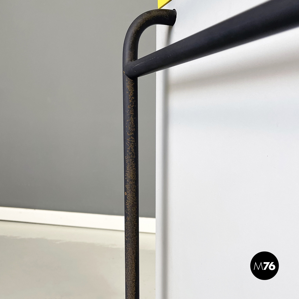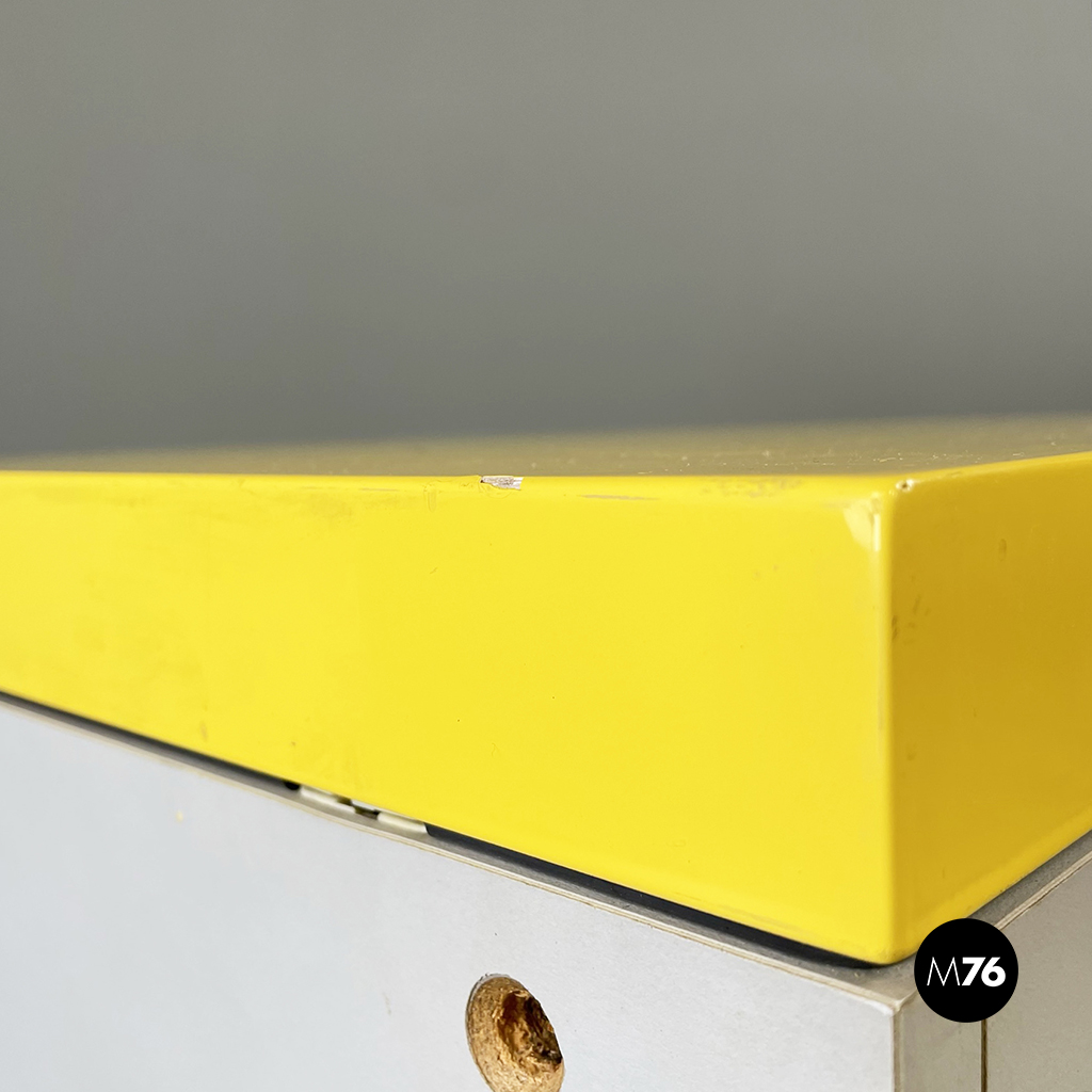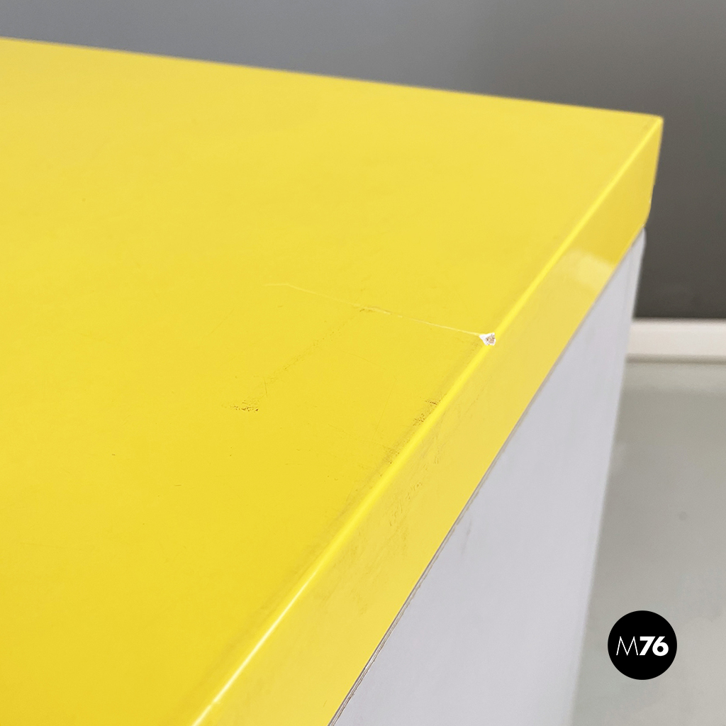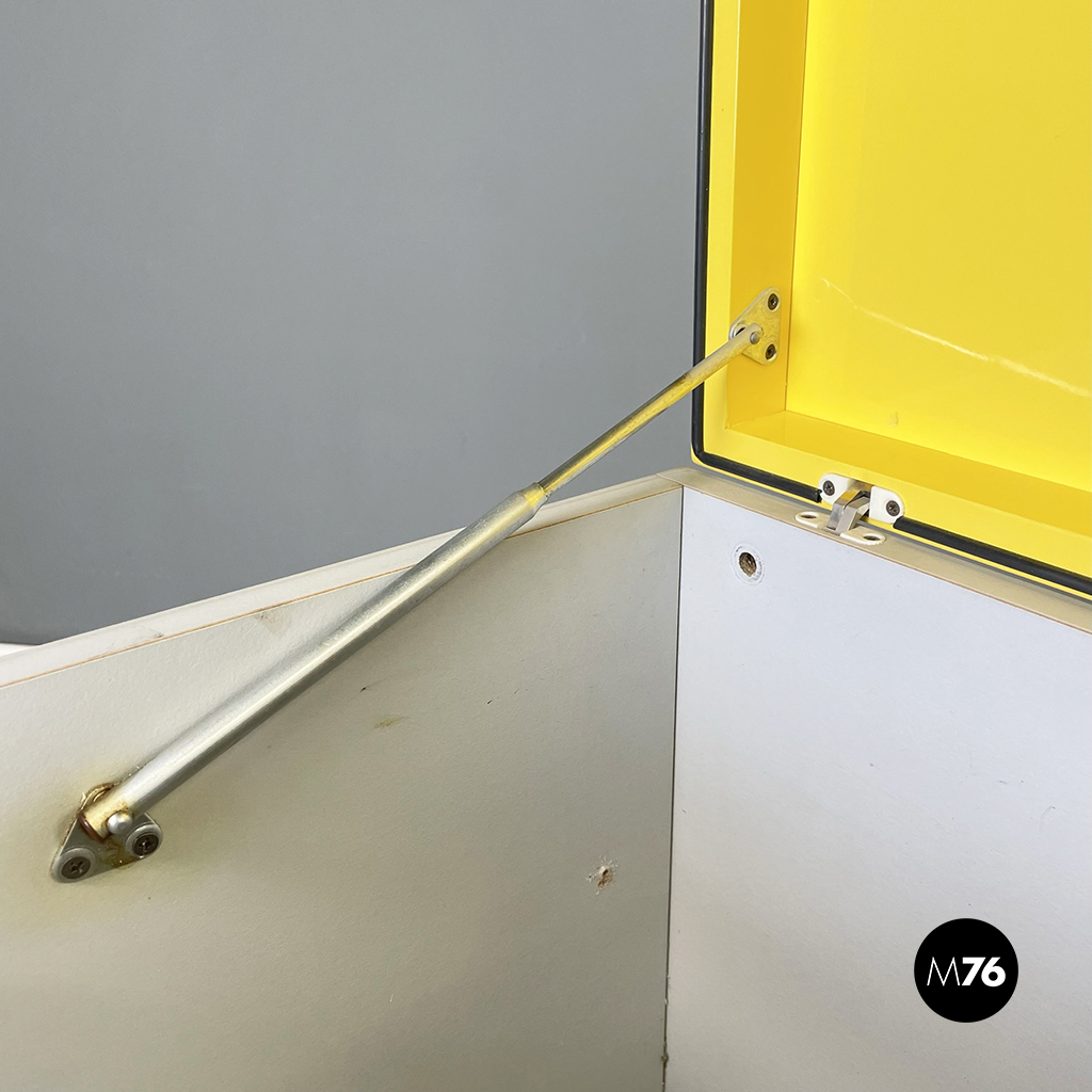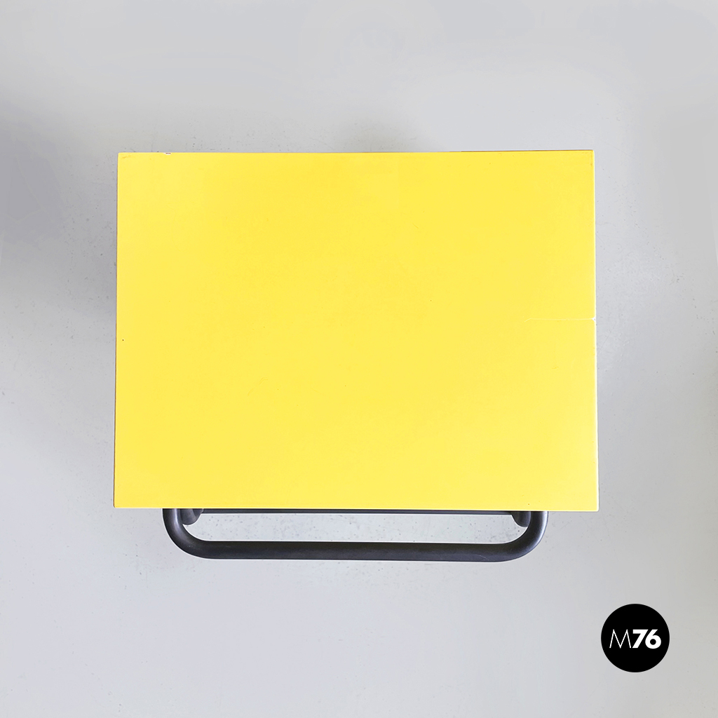 Cestino con base rettangolare in legno verniciato in grigio chiaro e giallo brillante. Il coperchio del mobile contenitore in legno giallo presenta una maniglia in tubolare di metallo verniciato nero. Sul fronte presenta una struttura in tubolare di metallo verniciato nero e alla base di questa una coppia di ruote nere.