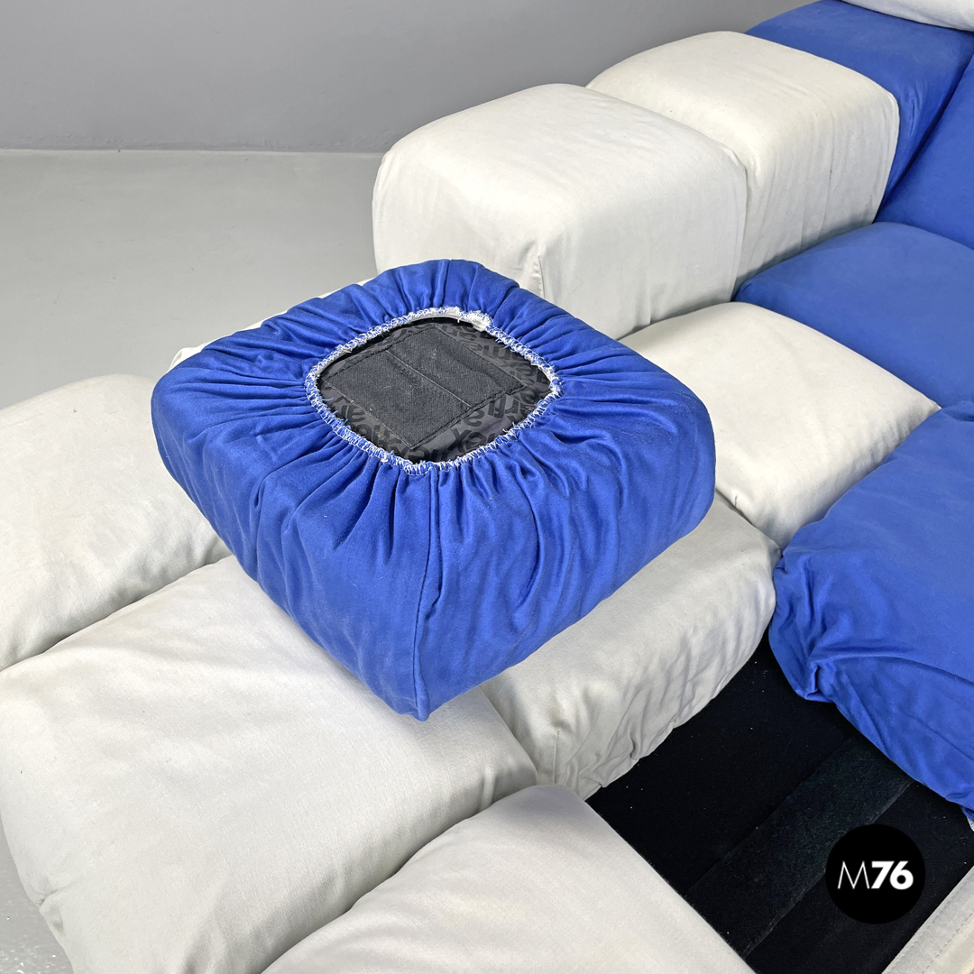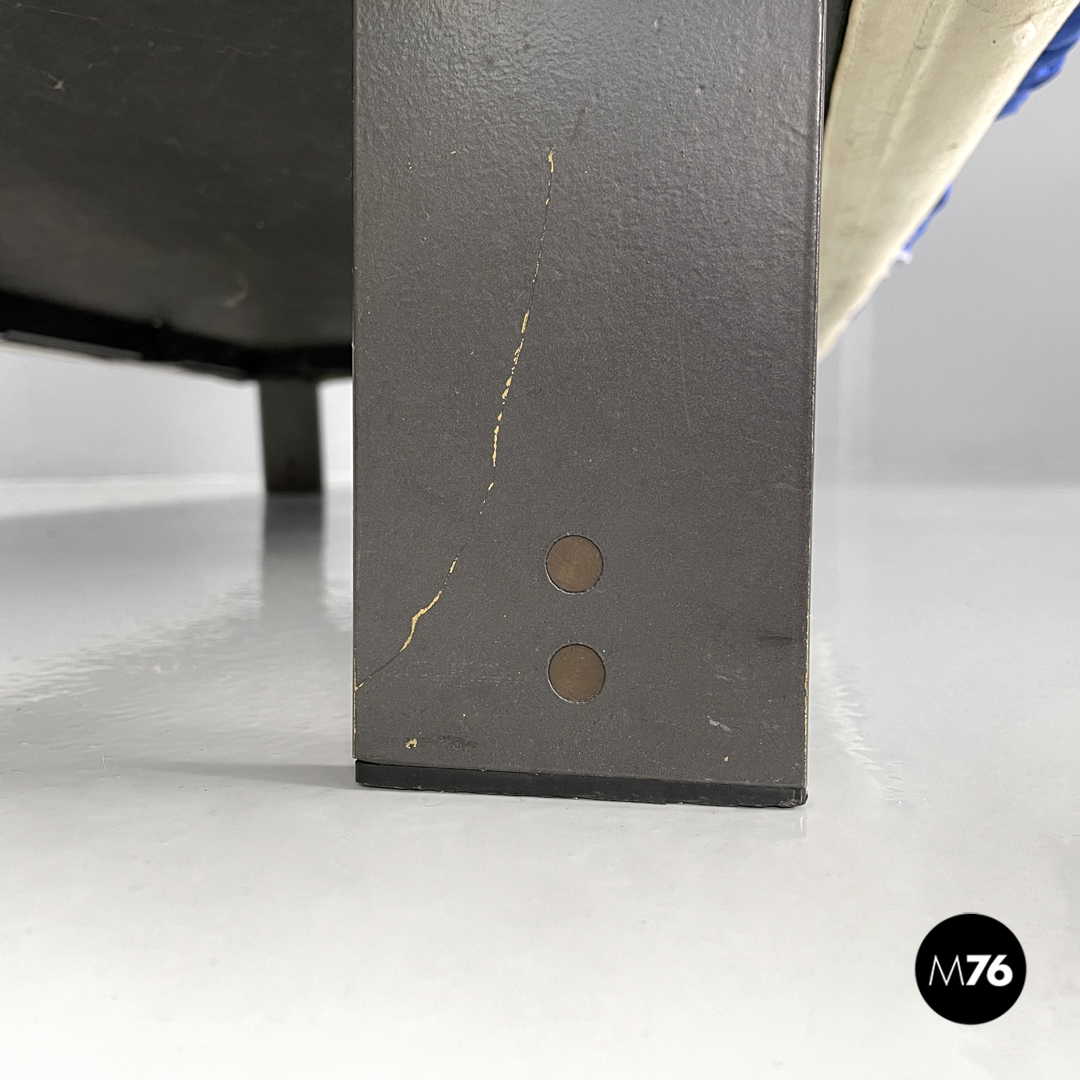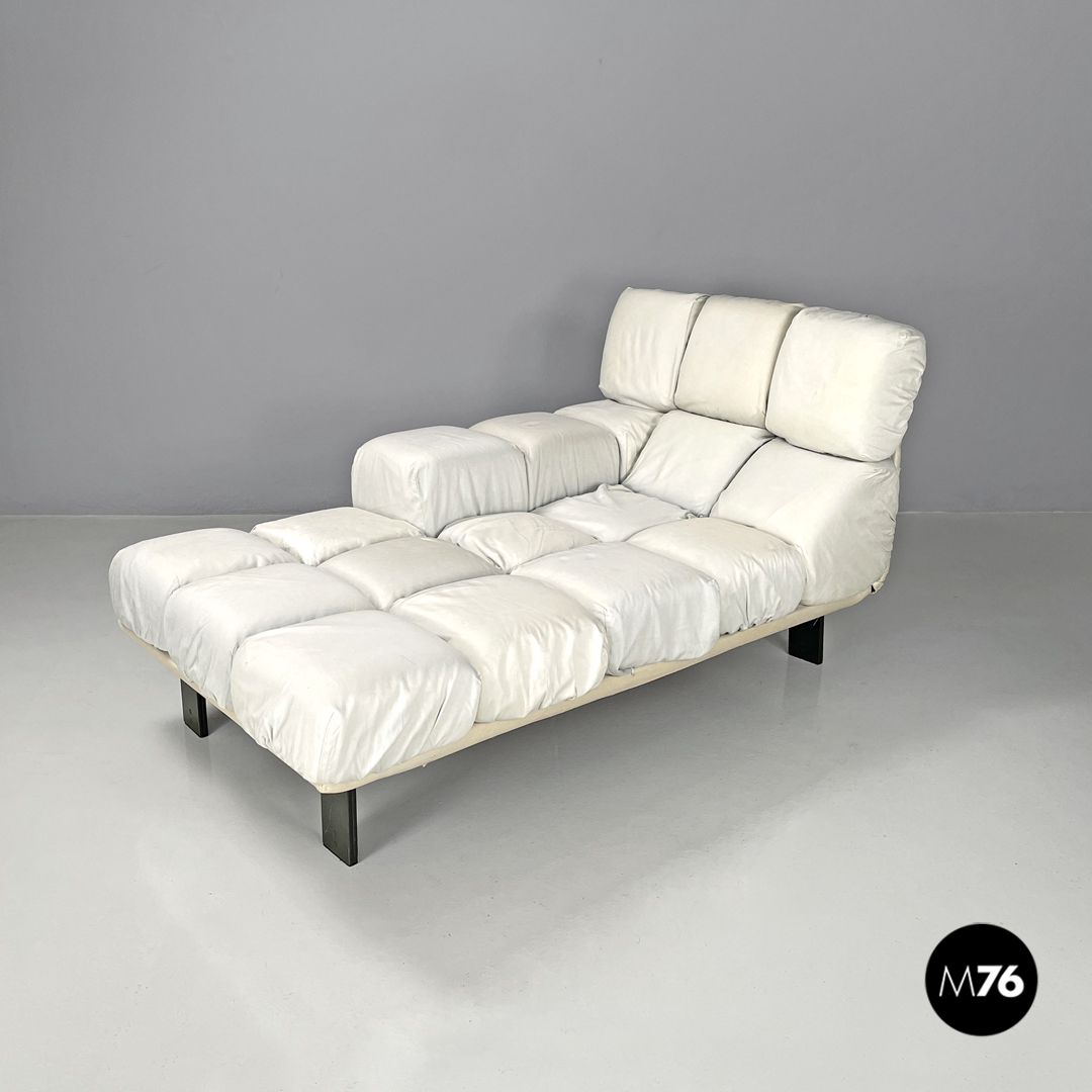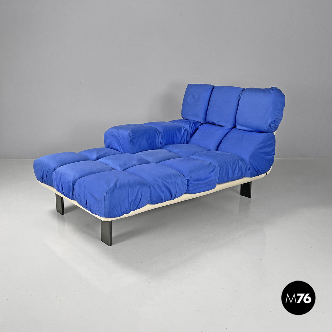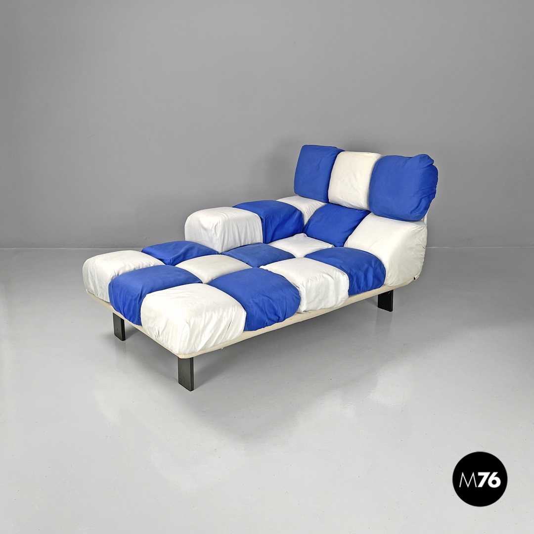 Chaise longue imbottita con seduta rettangolare. La schienale il bracciolo e la seduta sono composti da diciotto cubi imbottiti e rivestiti di tessuto double face blue elettrico e bianco. I cubi della seduta e dello schienale sono collegati alla struttura tramite velcro mentre quelli del bracciolo si incastrano in guide di tondino di ferro nero e sono più alti. Con quattro gambe a sezione rettangolare in metallo nero. Utilizzabile come daybed.