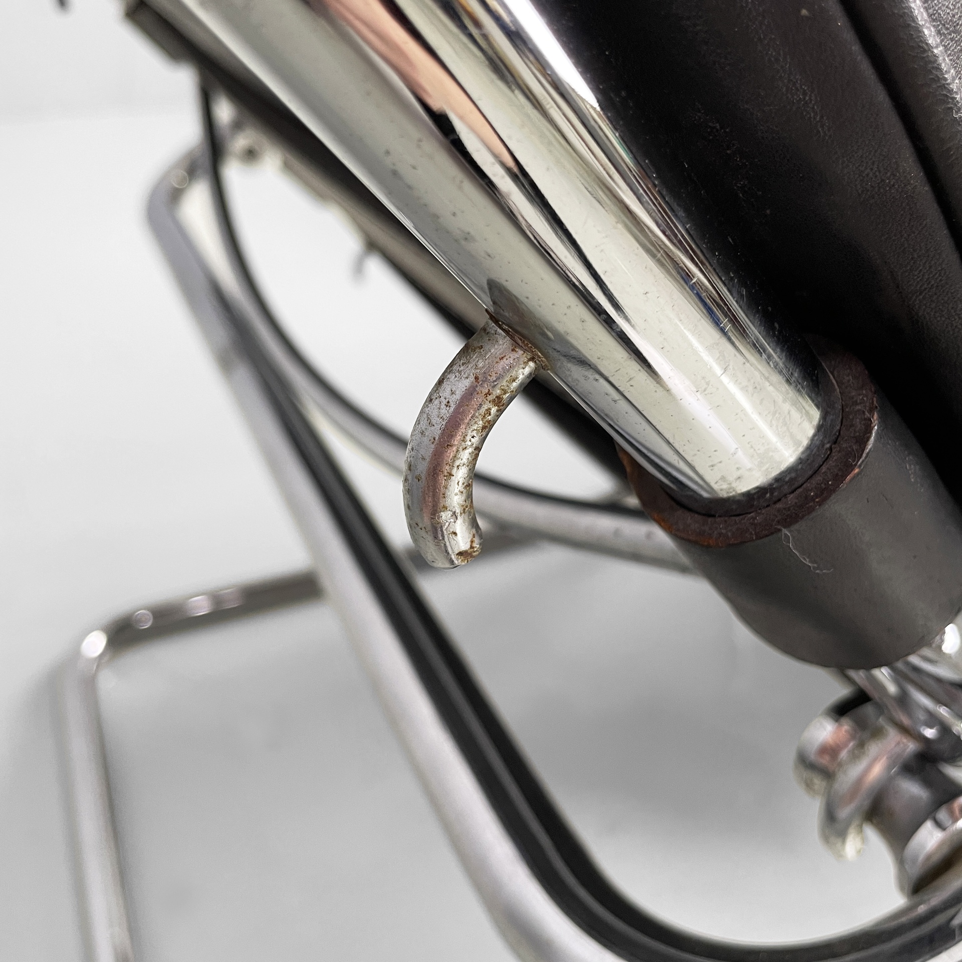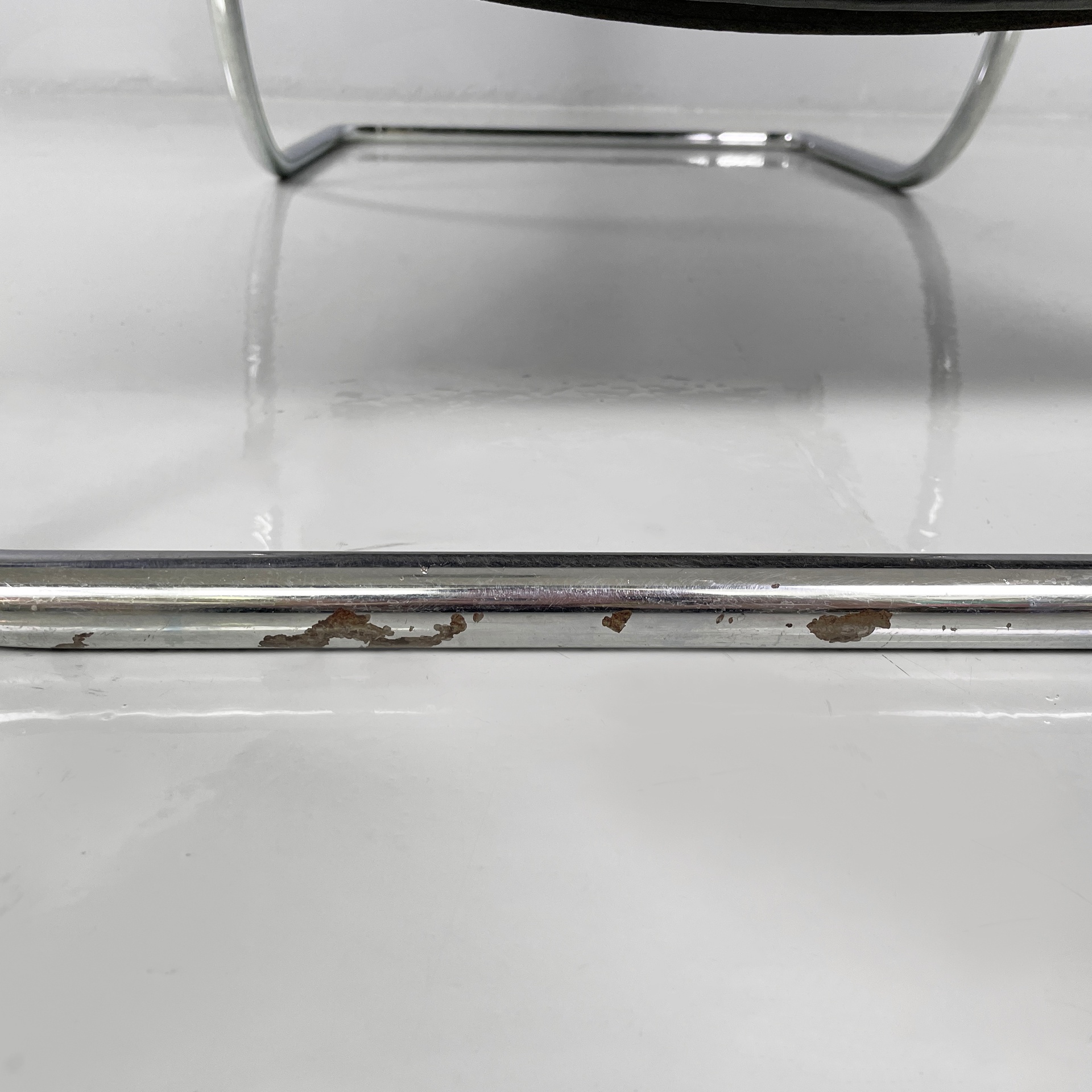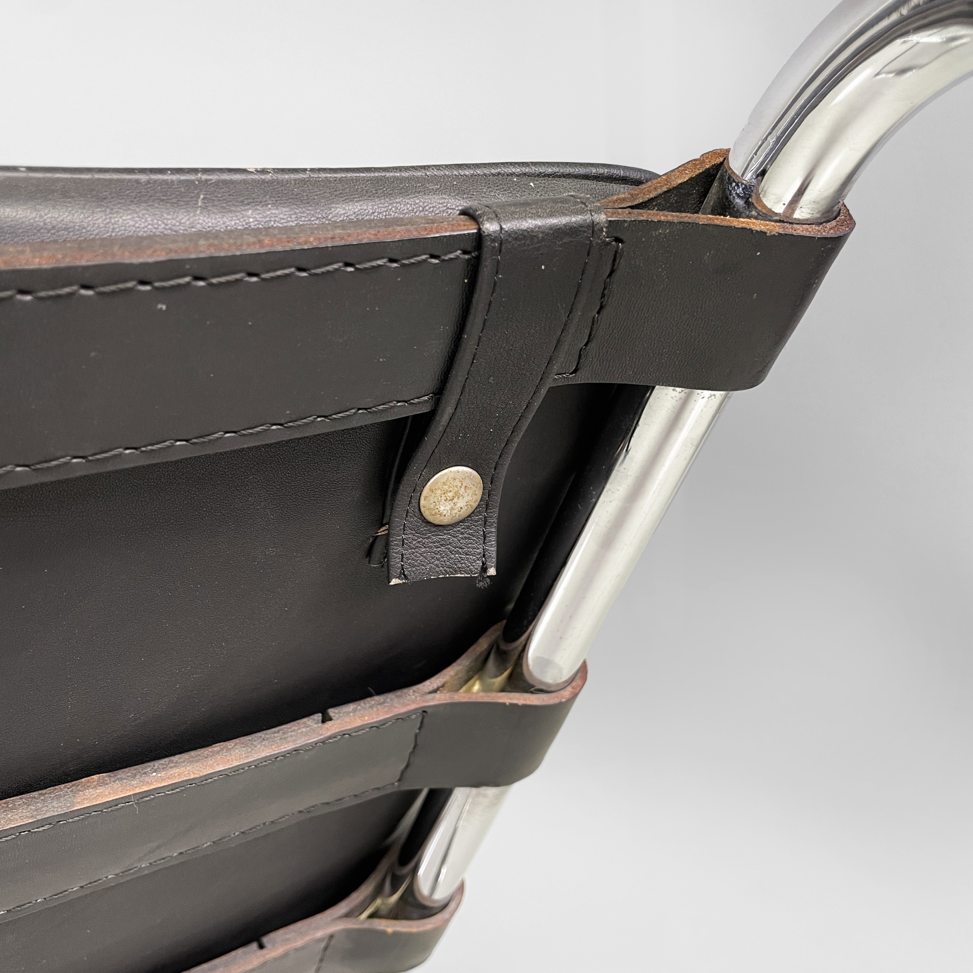 Chaise longue con seduta e schienale imbottiti e rivestiti in pelle nera con cinghie nere sul retro. La struttura e la base sono in tubolare di acciaio cromato. Sullo schienale sono presenti tre ganci, i quali permettono di scegliere l’inclinazione della poltrona.