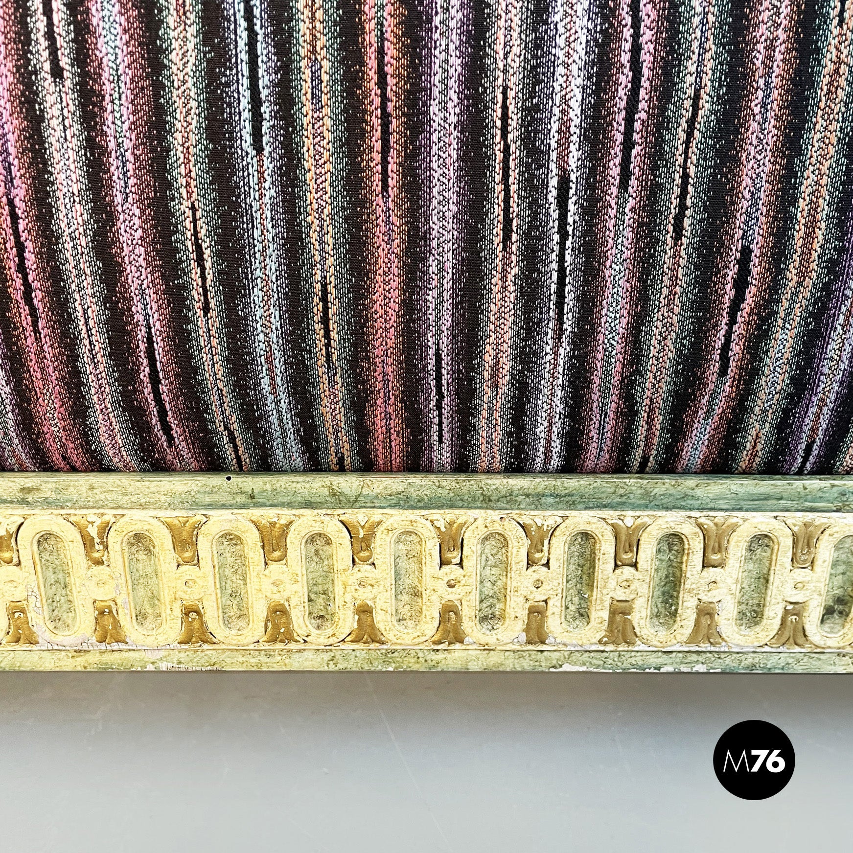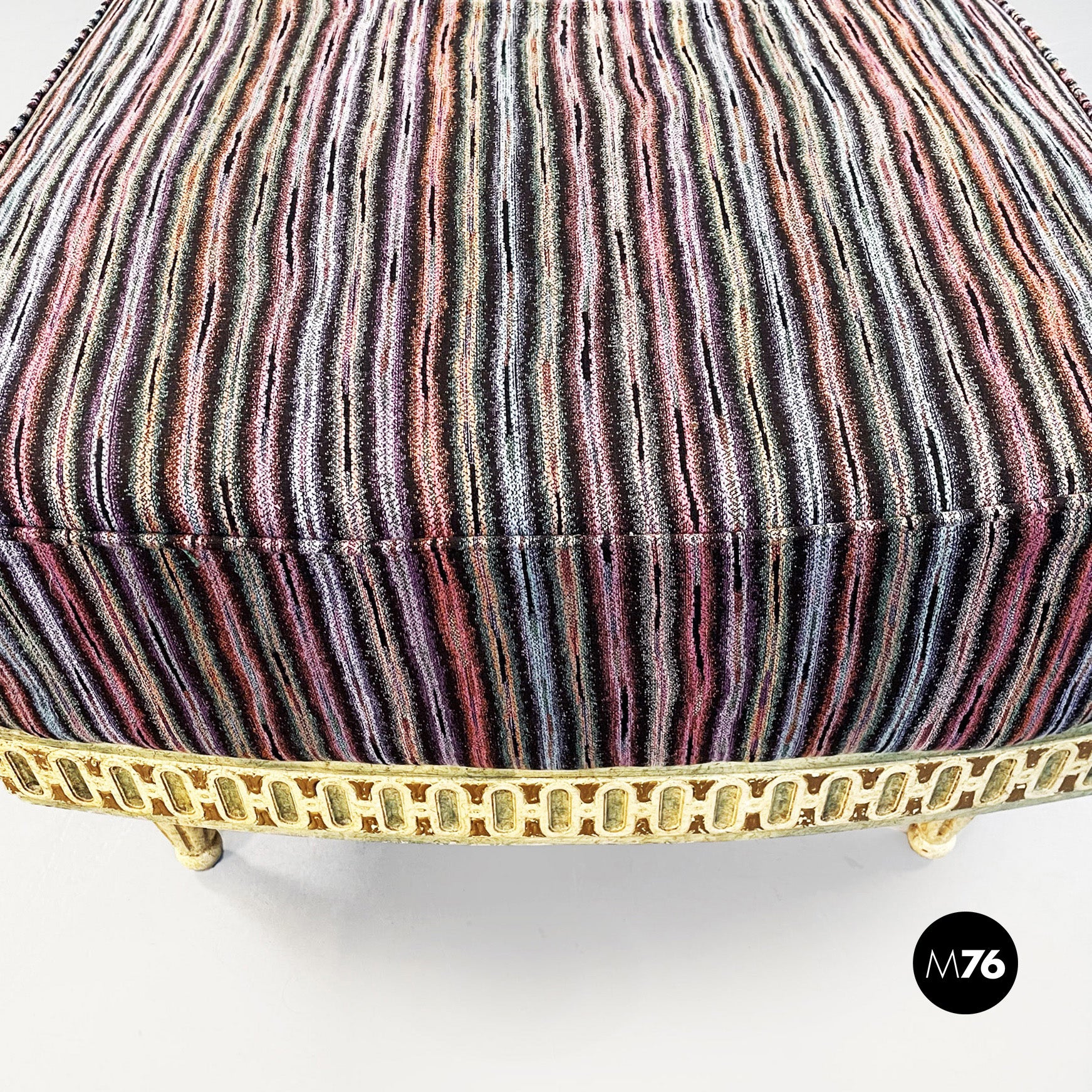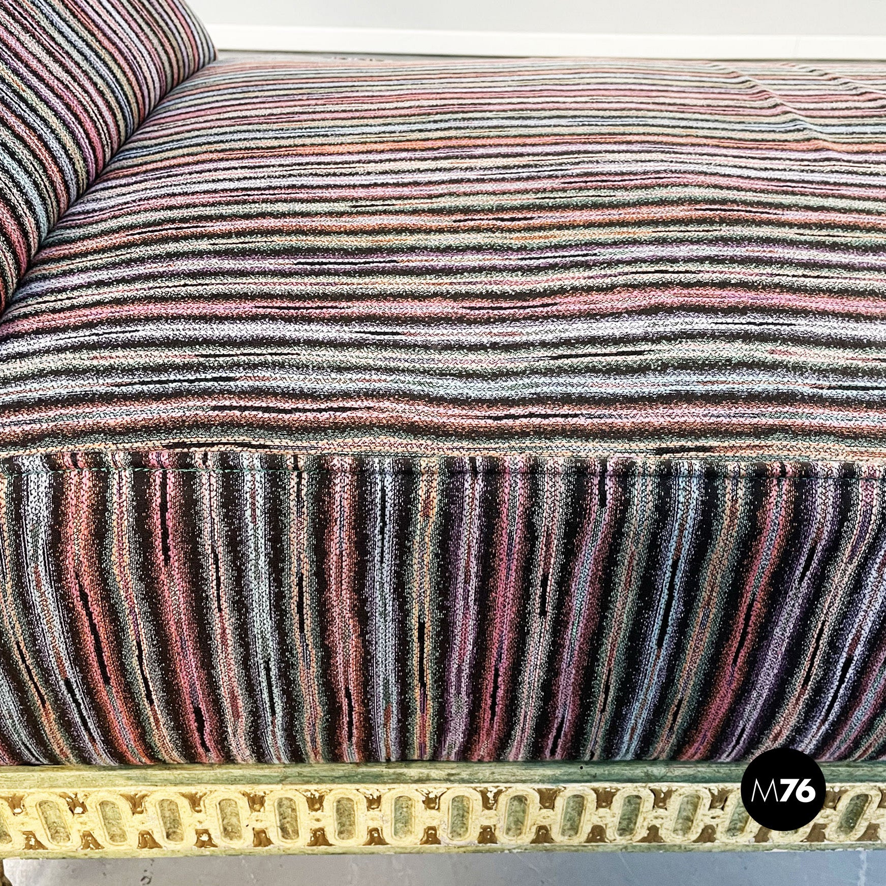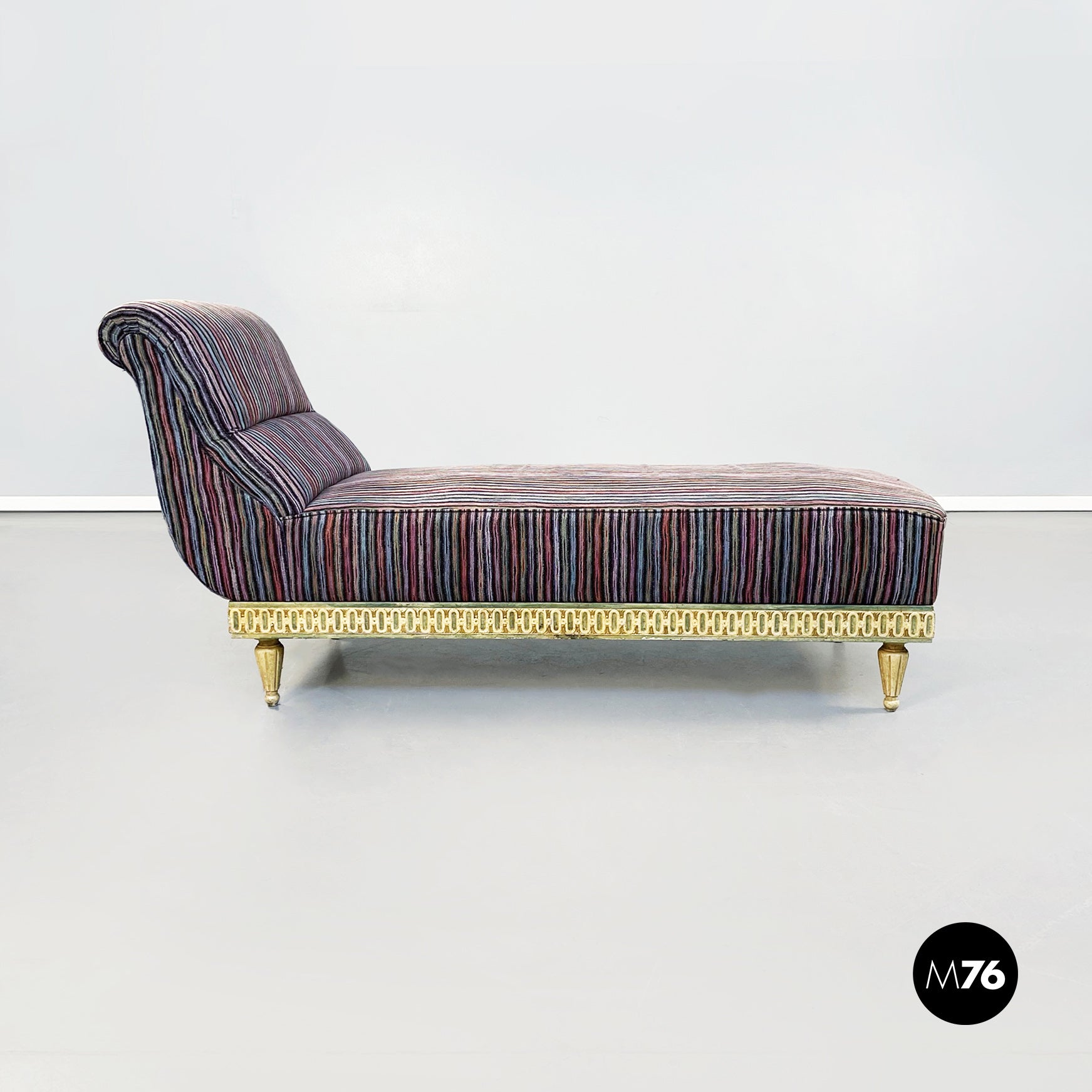 Chaise longue con seduta rettangolare e schienale imbottiti e rivestiti di tessuto a righe variopinte di Missoni. La struttura sottostante è in legno lavorata e dipinta di bianco avorio verde e giallo. I piedini sono finemente lavorati. In stile veneziano.