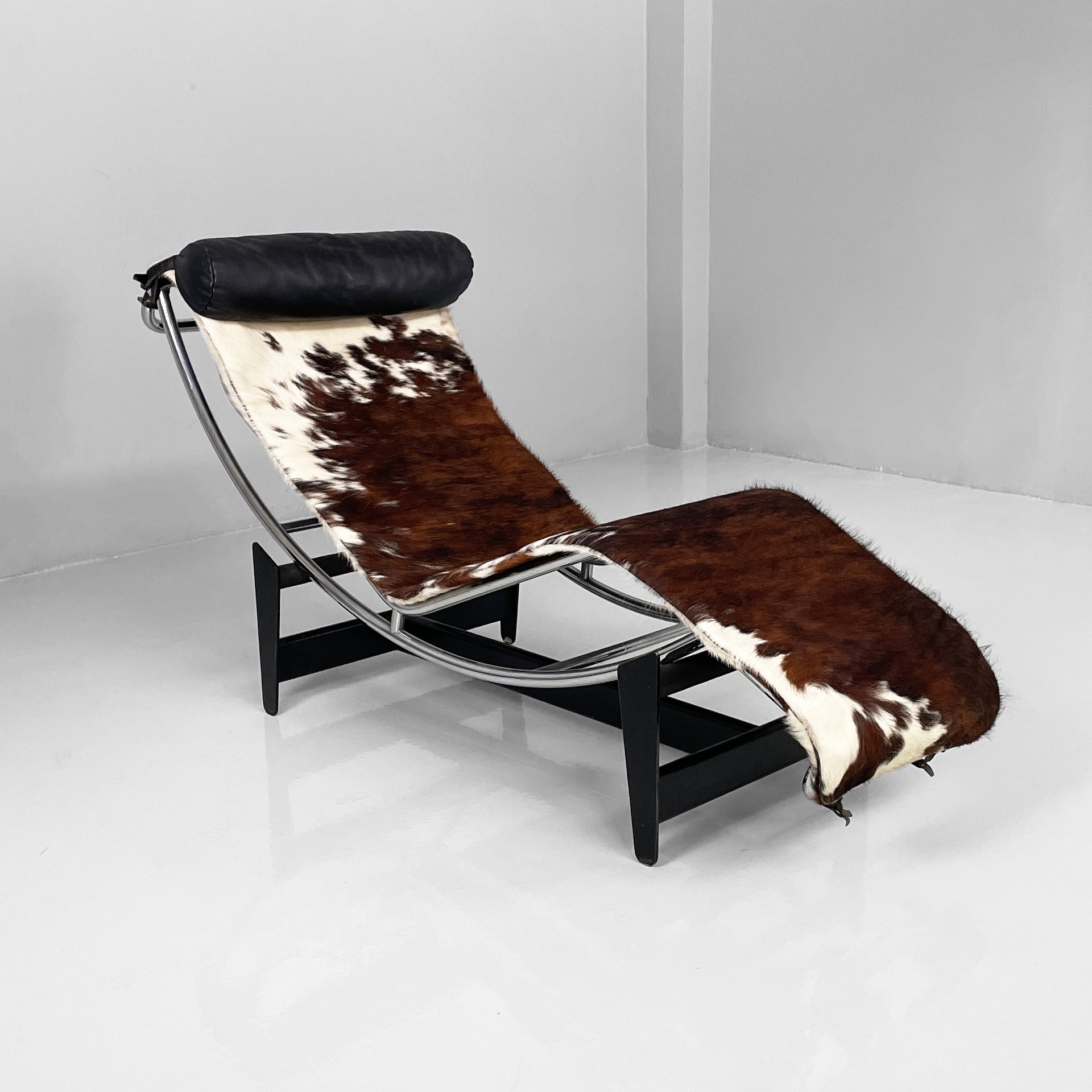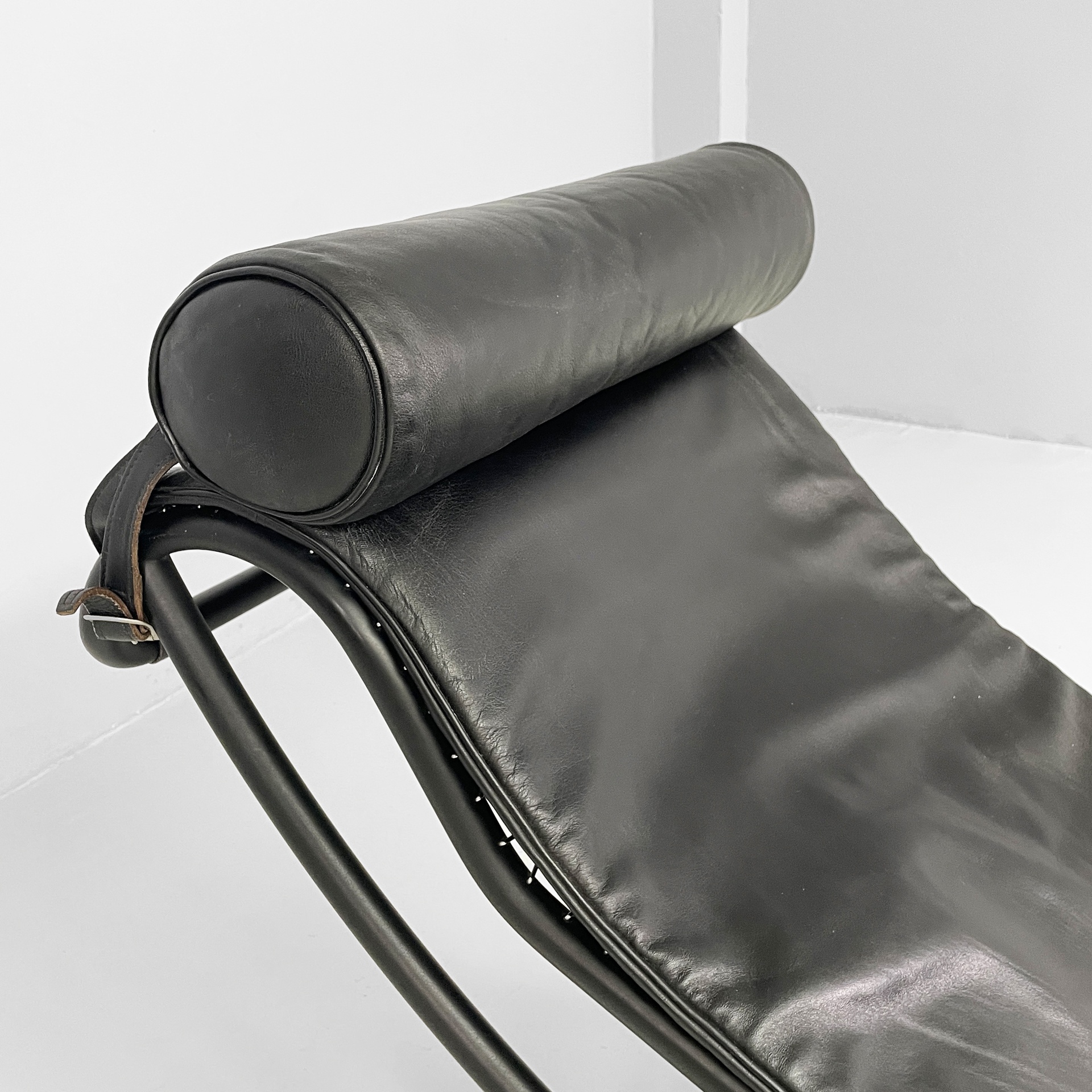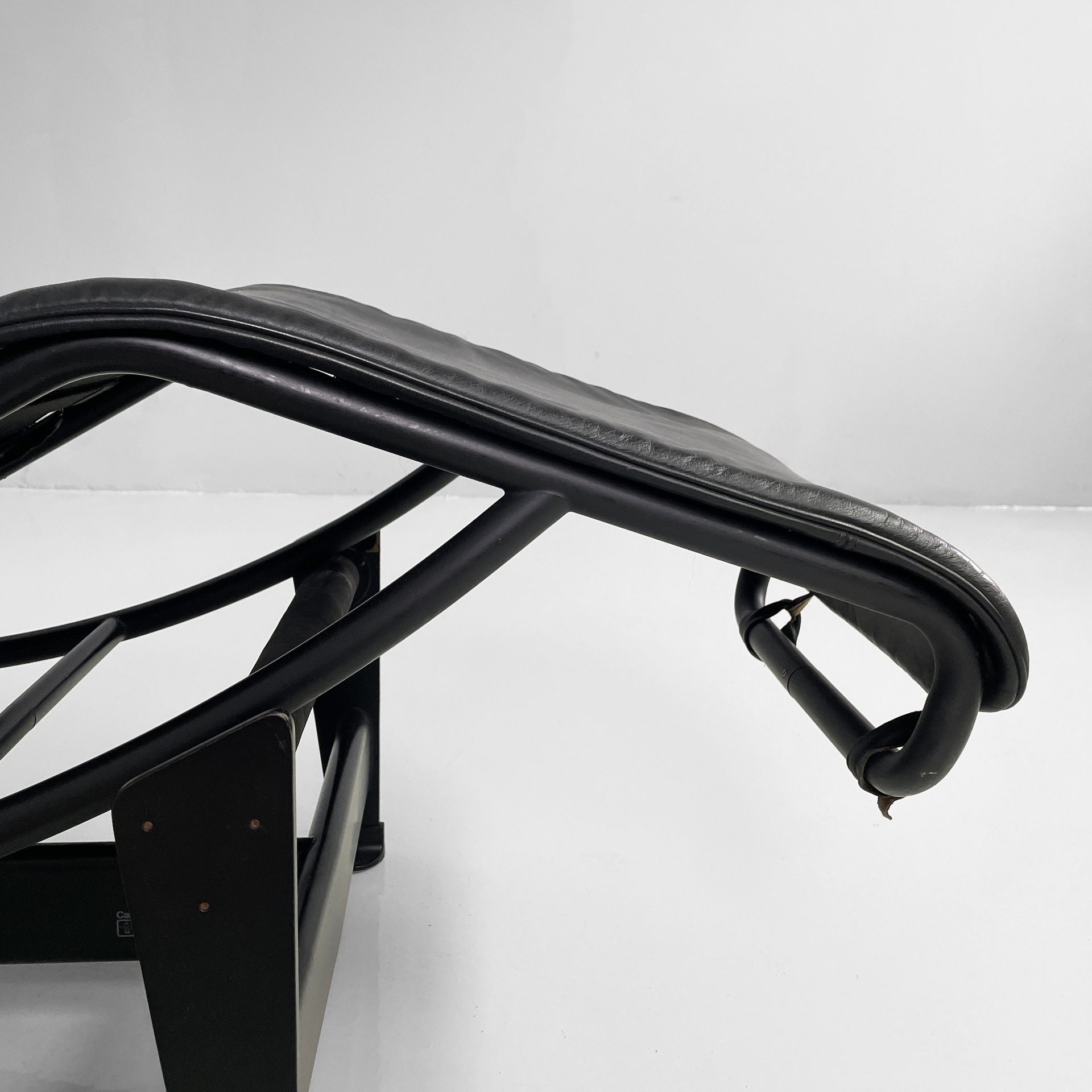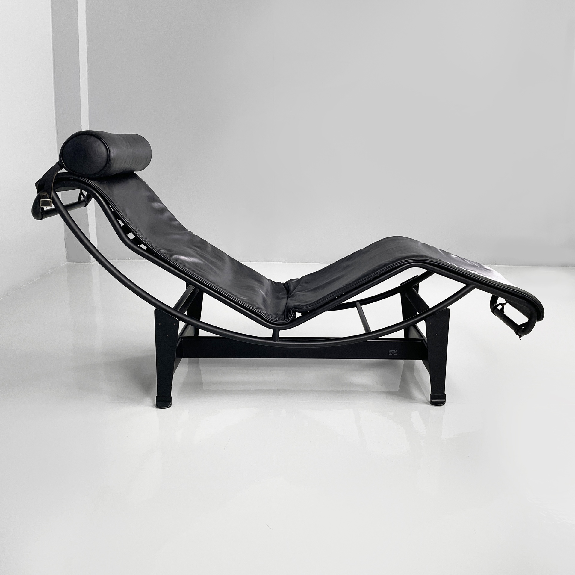 Poltrona o chaise longue modello LC4 con struttura in metallo nero a supporto della seduta curvata composta dal telaio in tubolare d’acciaio e dal cuscino in pelle nera a coprire l’intera struttura. Poggiatesta sempre in pelle di forma cilindrica agganciato alla struttura con maniglia posteriore sempre in tubolare d’acciaio utilizzata per il posizionamento della seduta rendendola più da relax o da lettura.