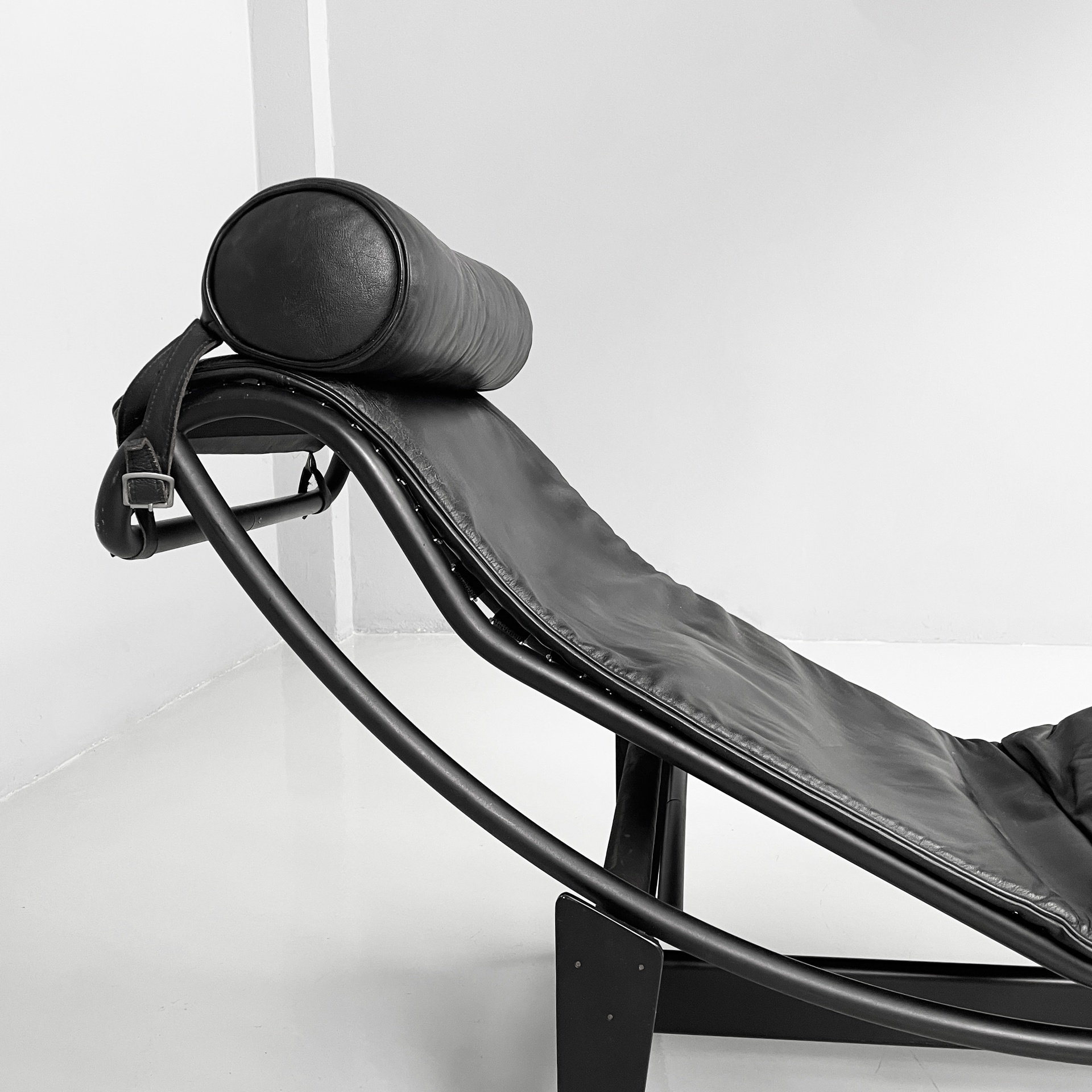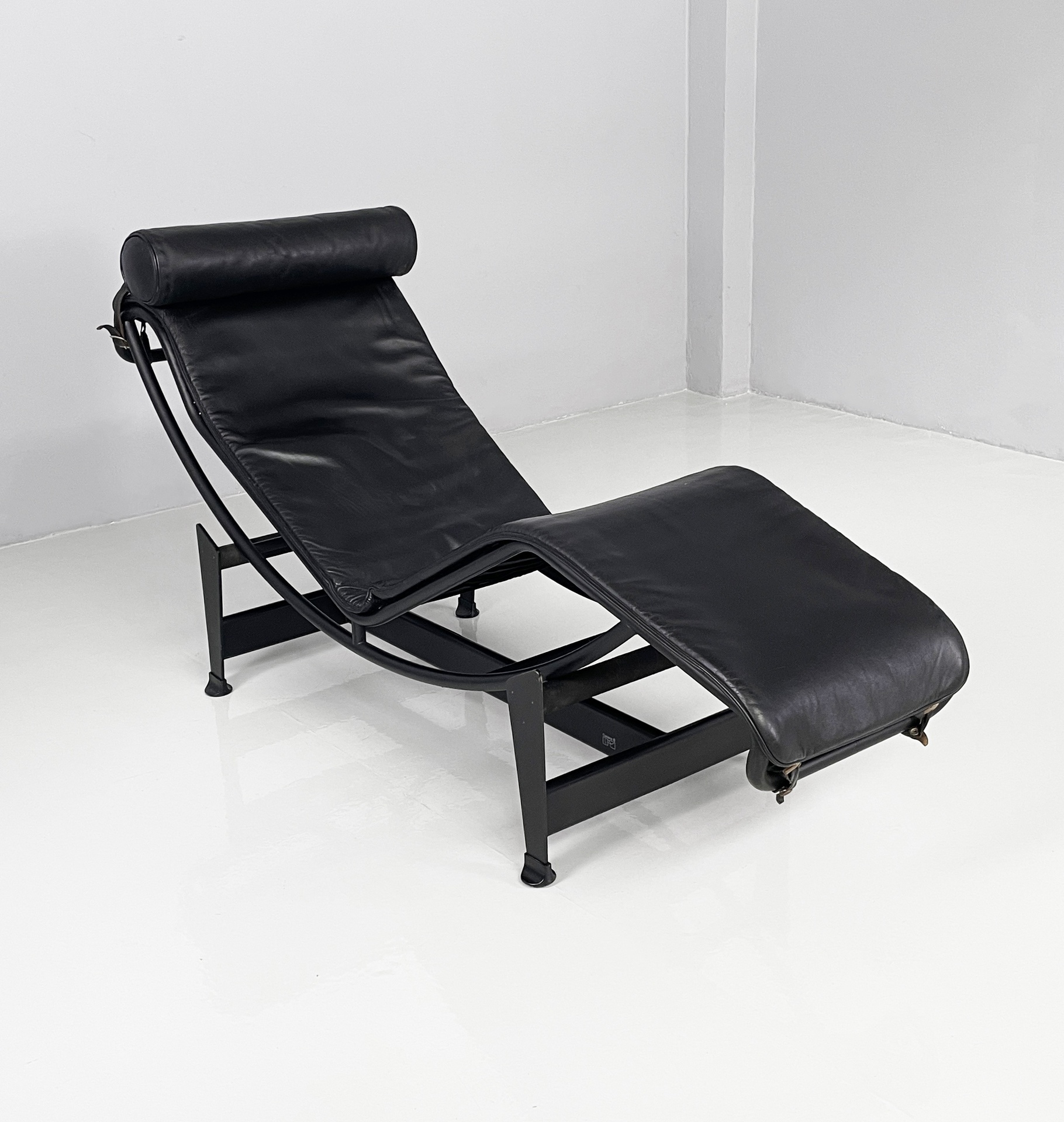 Poltrona o chaise longue modello LC4 con seduta curvata e cuscino cilindrico in pelle nera. La seduta presenta una struttura in tubolare di acciaio curvato verniciato nero, la quale essendo solo poggiata sulla base permette di scegliere il posizionamento della seduta, rendendola più da relax o da lettura. La base è in metallo verniciato nero con piedini tondi neri.