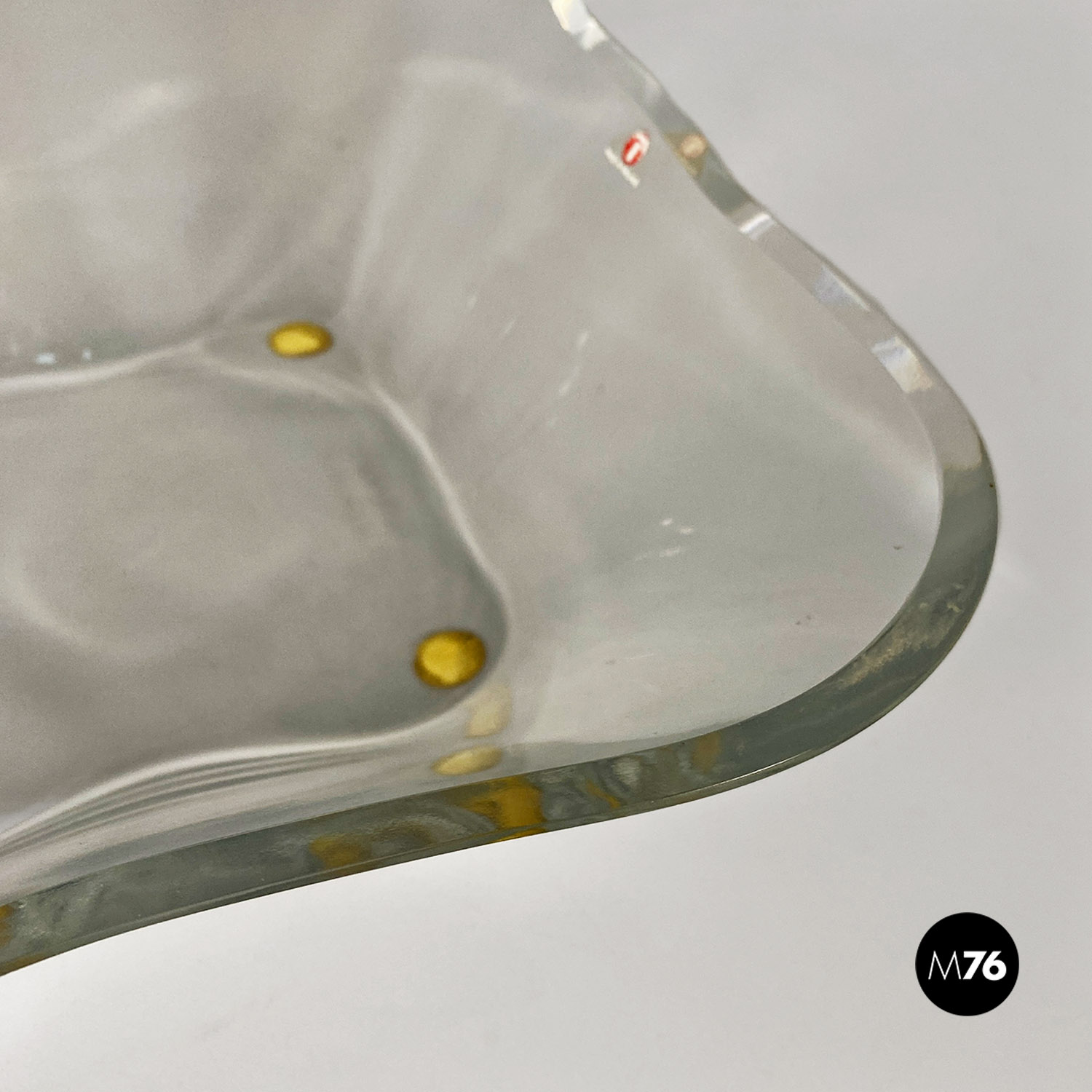 Ciotola centrotavola o vaso basso interamente in vetro e di forma irregolare e ondulata.