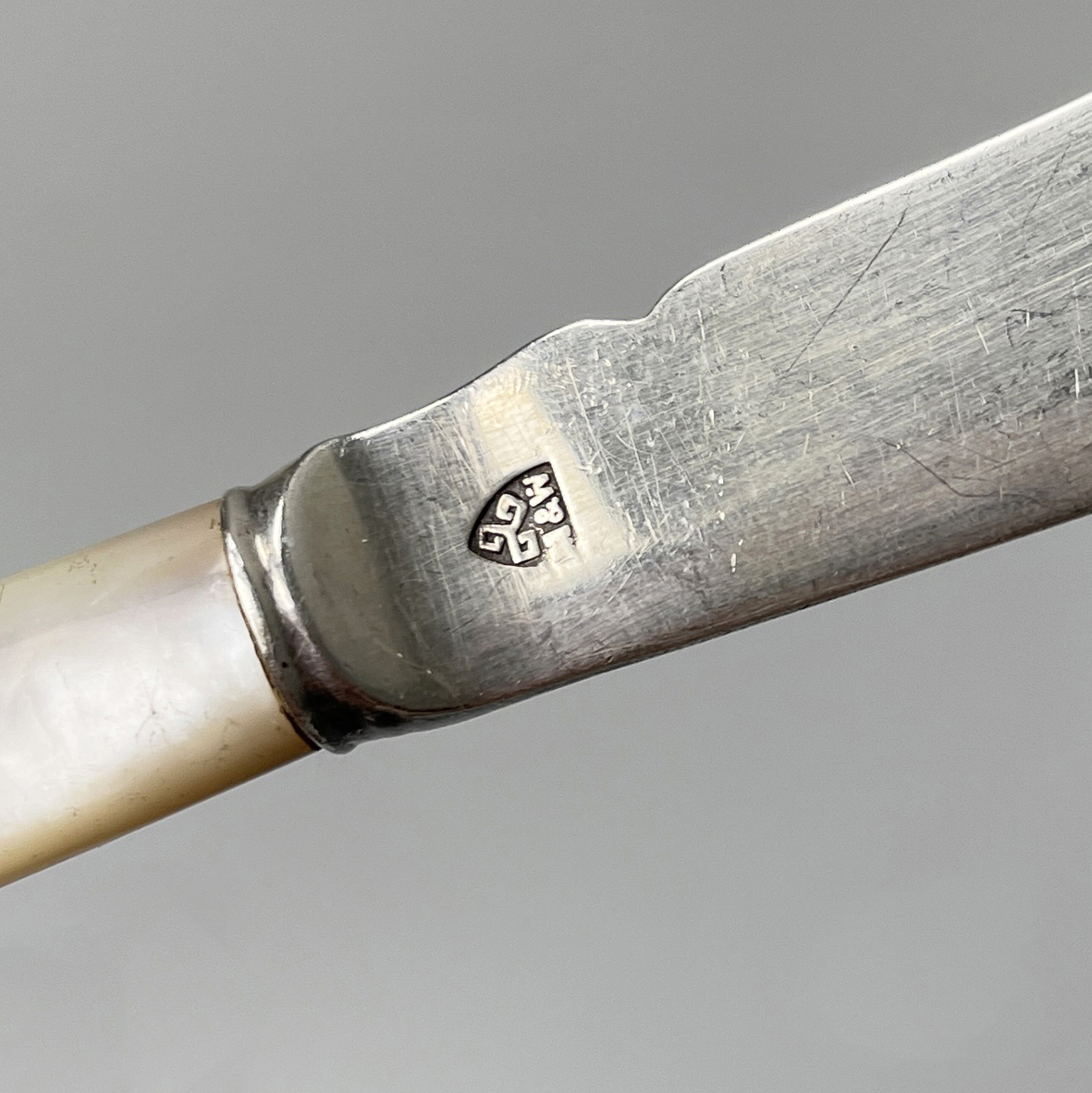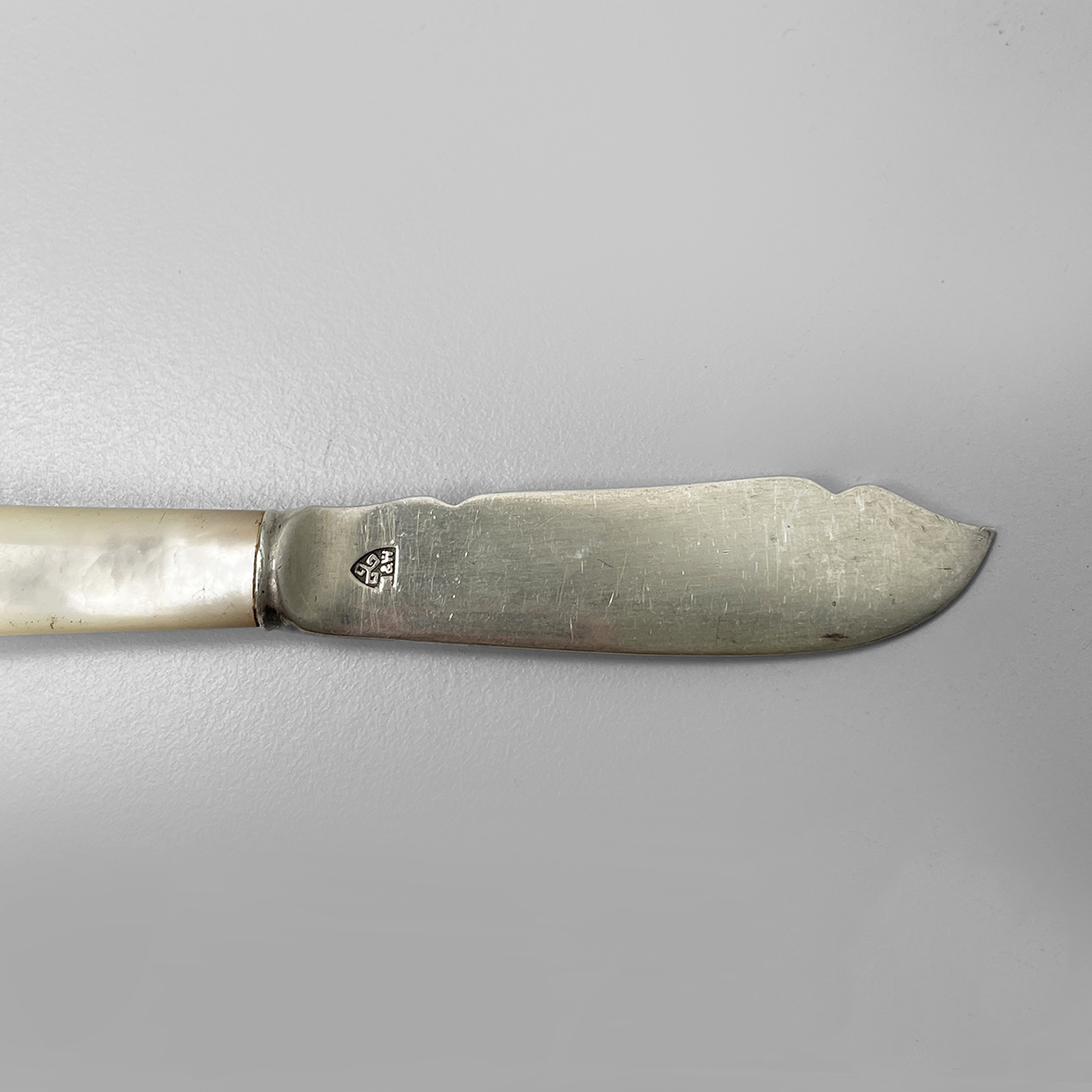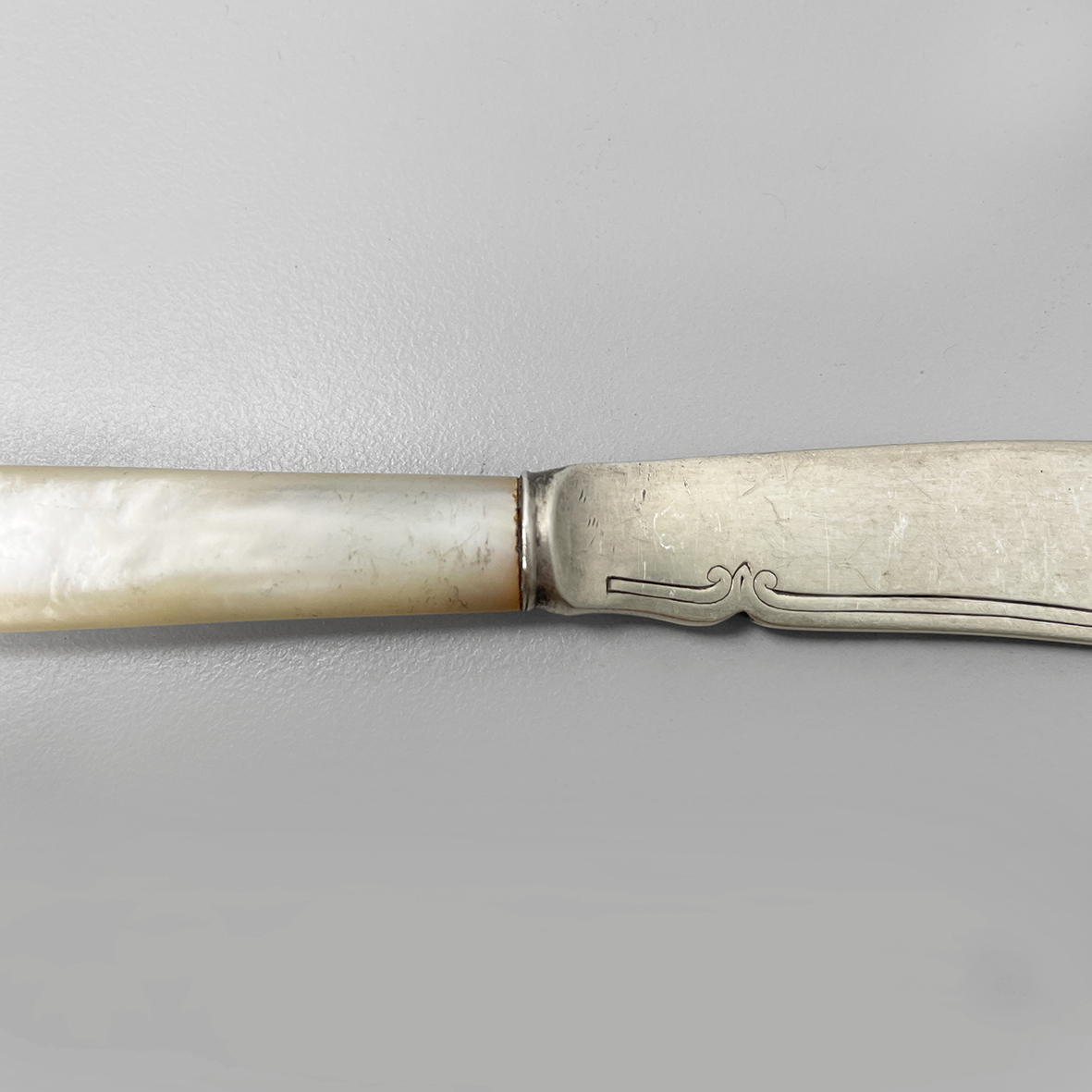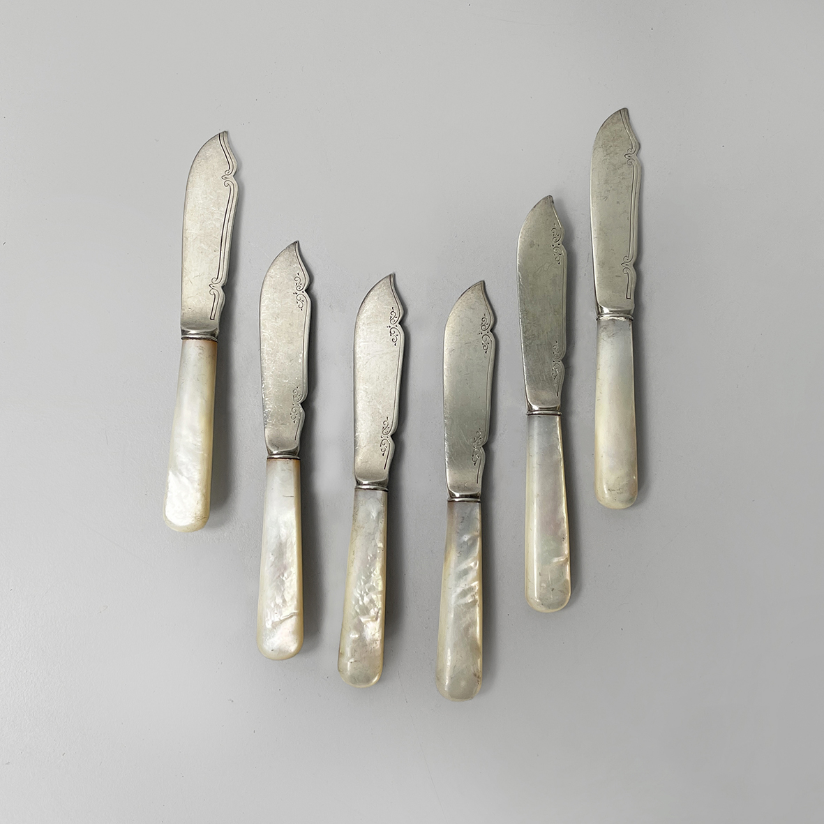 Set di sei coltelli da paté o burro con lama sagomata placcato argento. Sulla lama sono presenti dei piccoli decori incisi. Il manico è in bachelite bianco-beige.