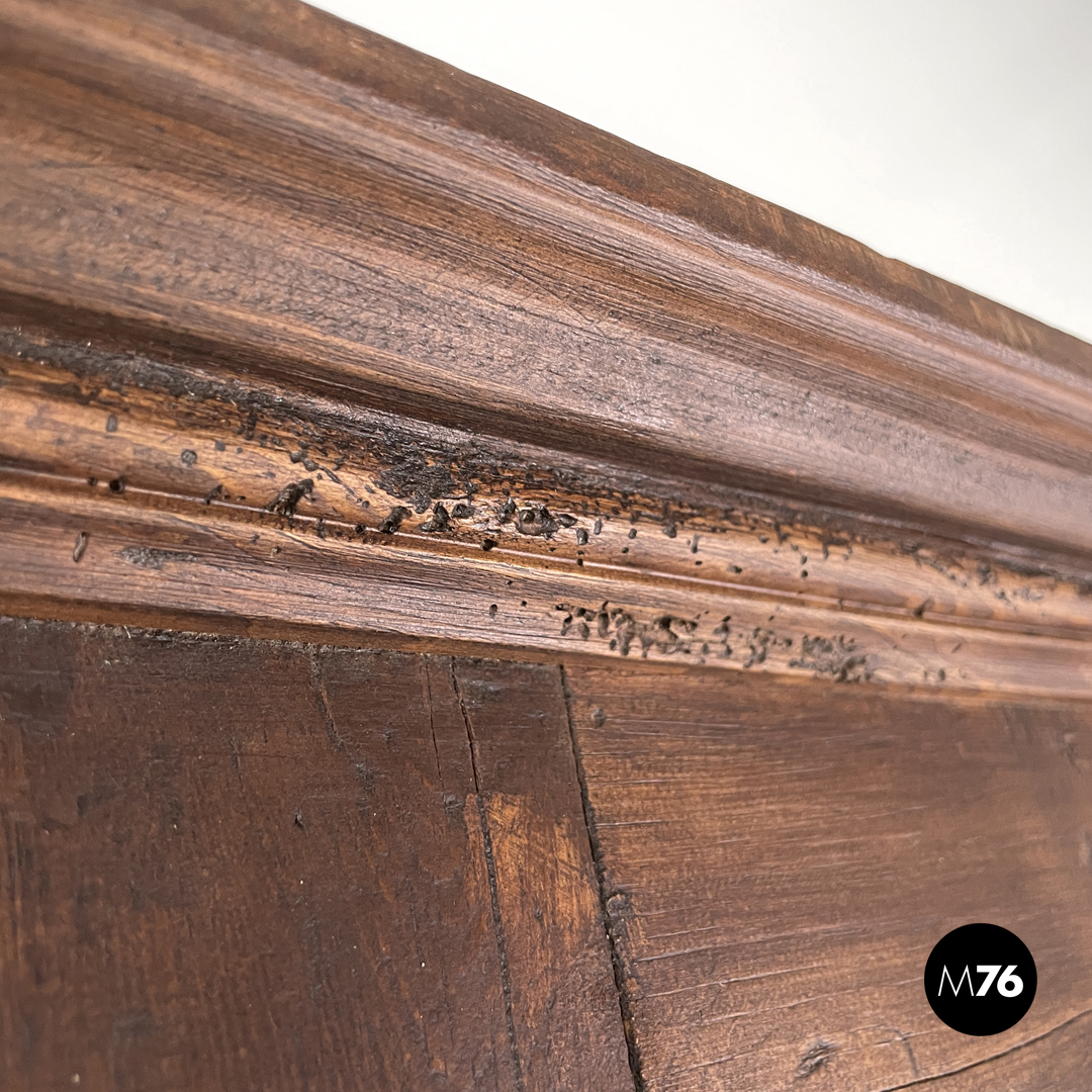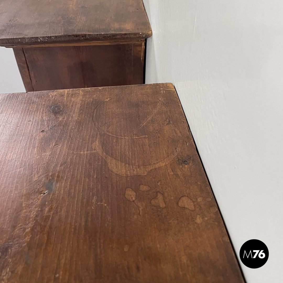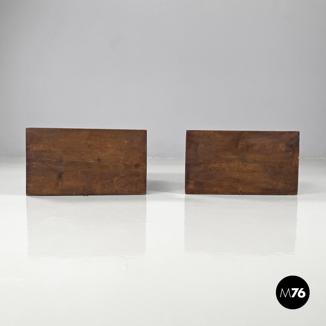Coppia di comodini da parete interamente in legno. Il piano è rettangolare con il gancio tondo per appenderli al muro. I comodini presentano un’anta frontale decorata con diversi livelli di legno a formare una composizione geometrica. Le due “gambe” posteriori poggiano alla parete unite da una trave a sezione circolare.