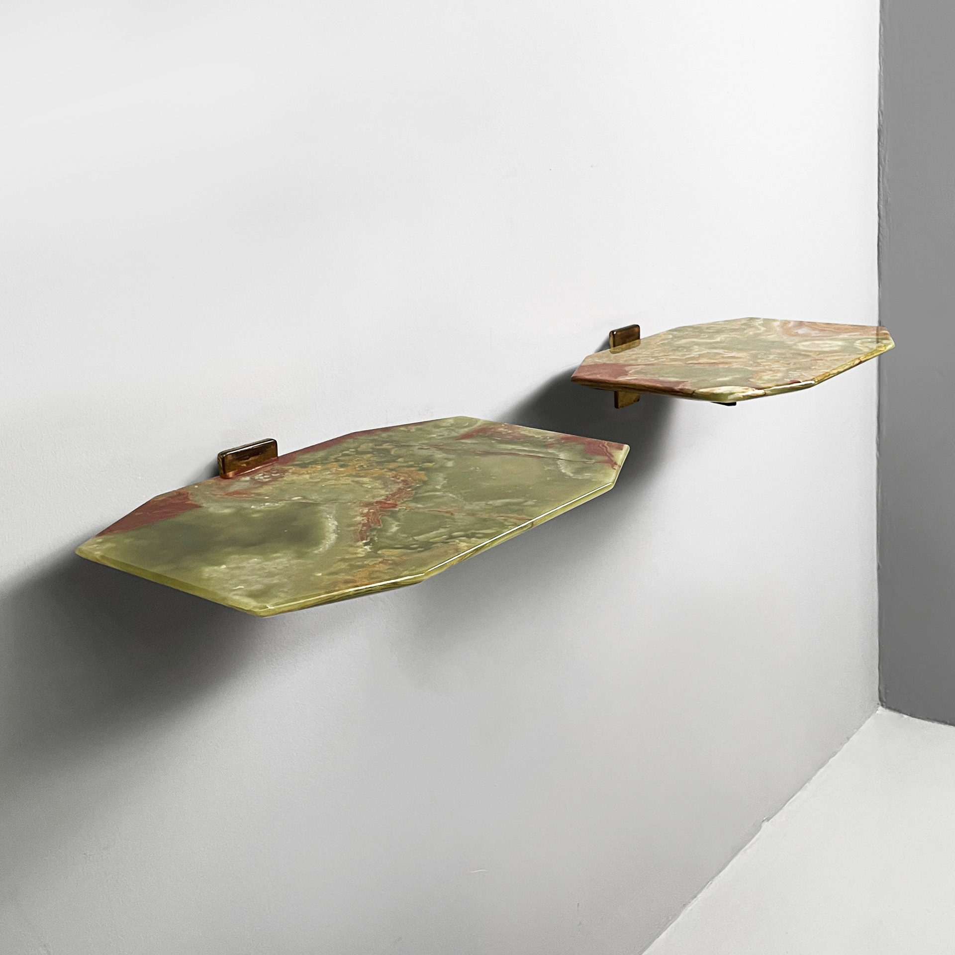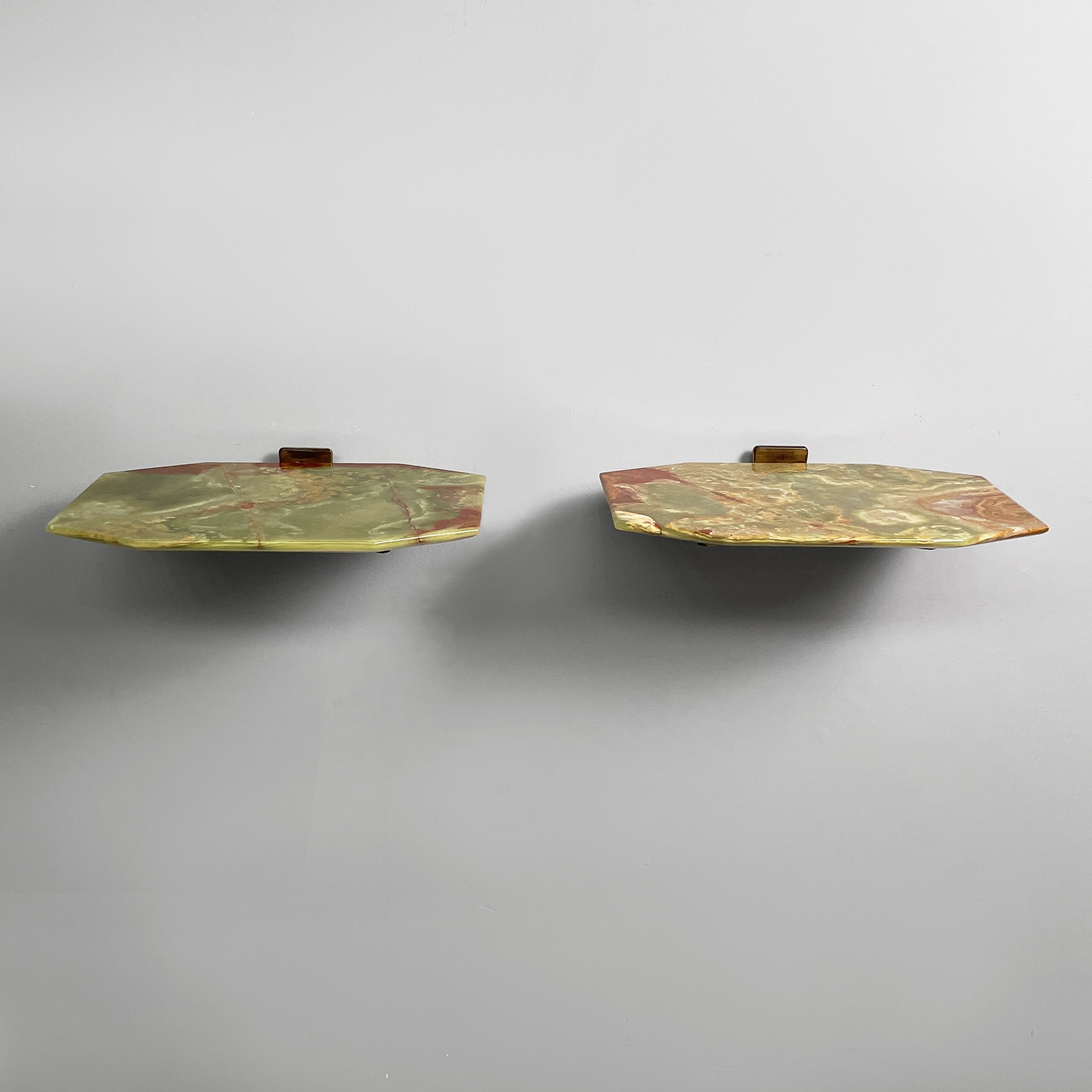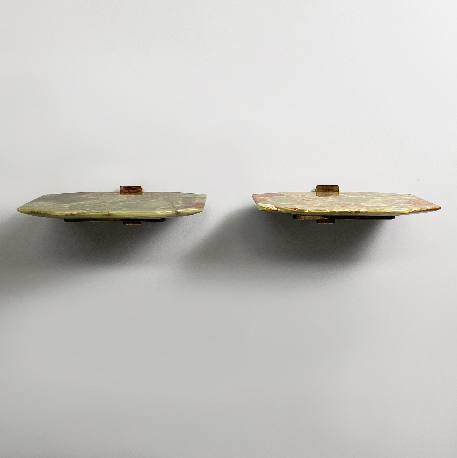 Coppia di comodini sospesi con piano sagomato in onice verde. La struttura in ottone su cui poggia il piano è composto da due bracci ed attacco a parete squadrato. Utilizzabili come piccole consolle.