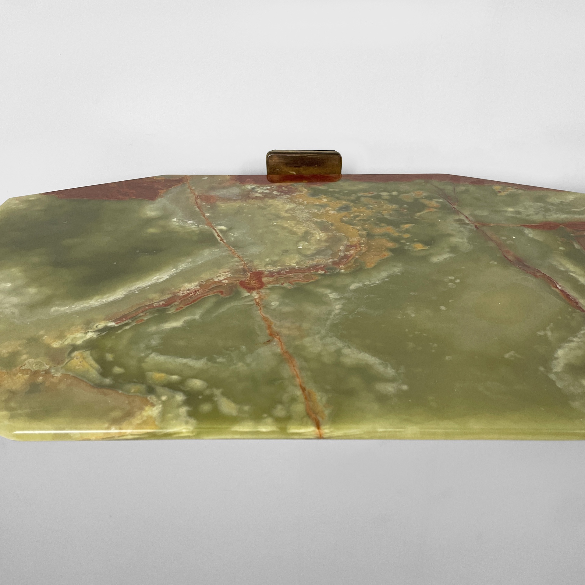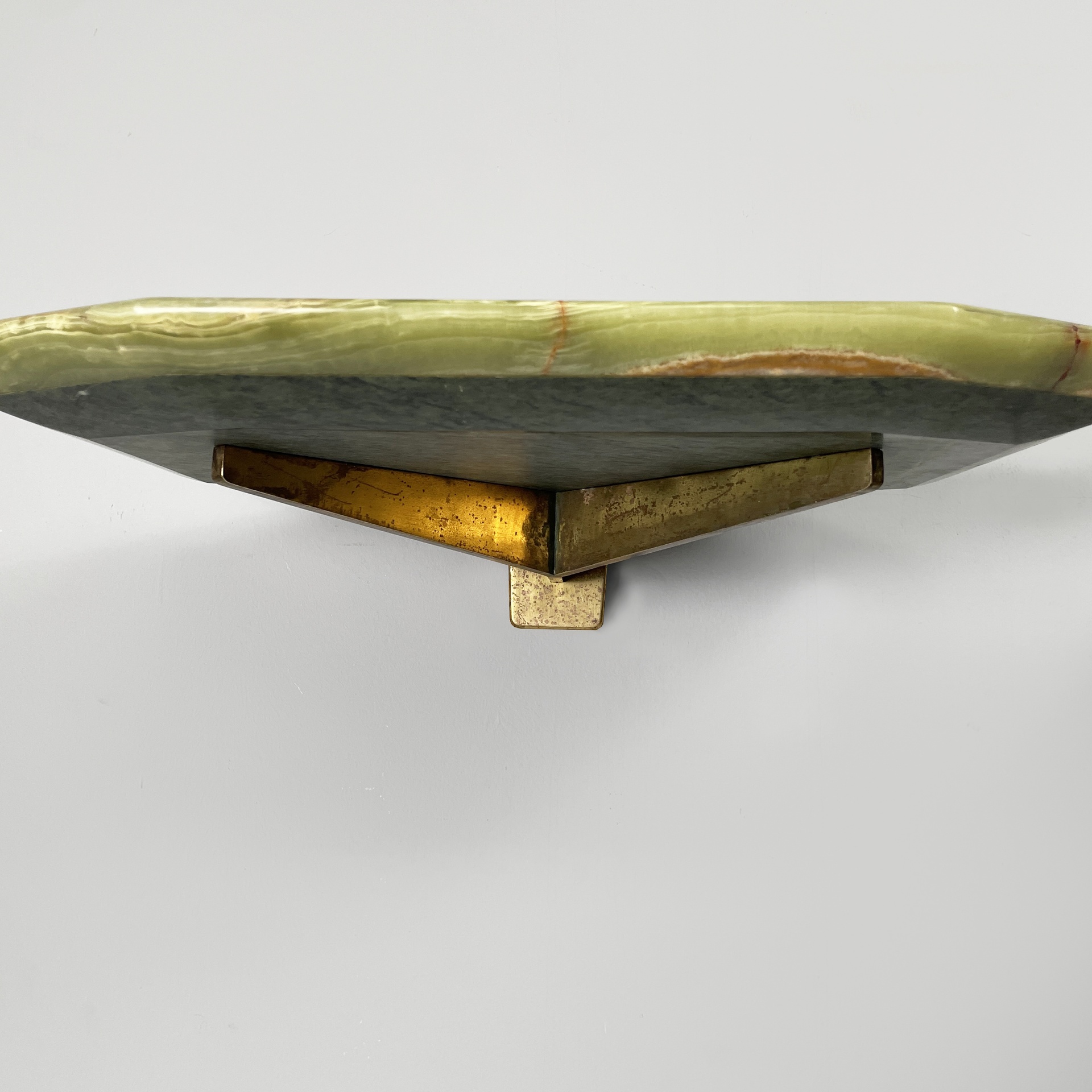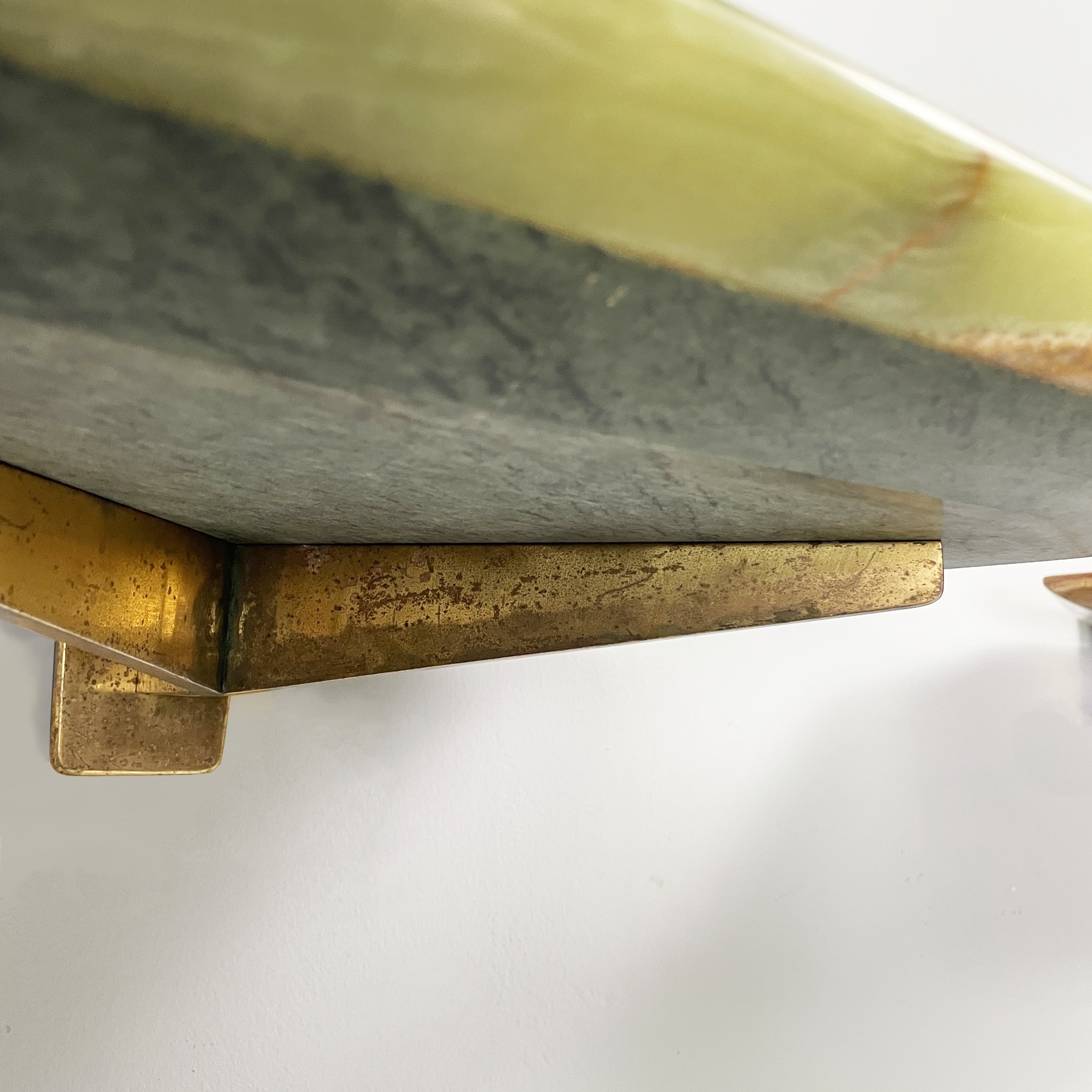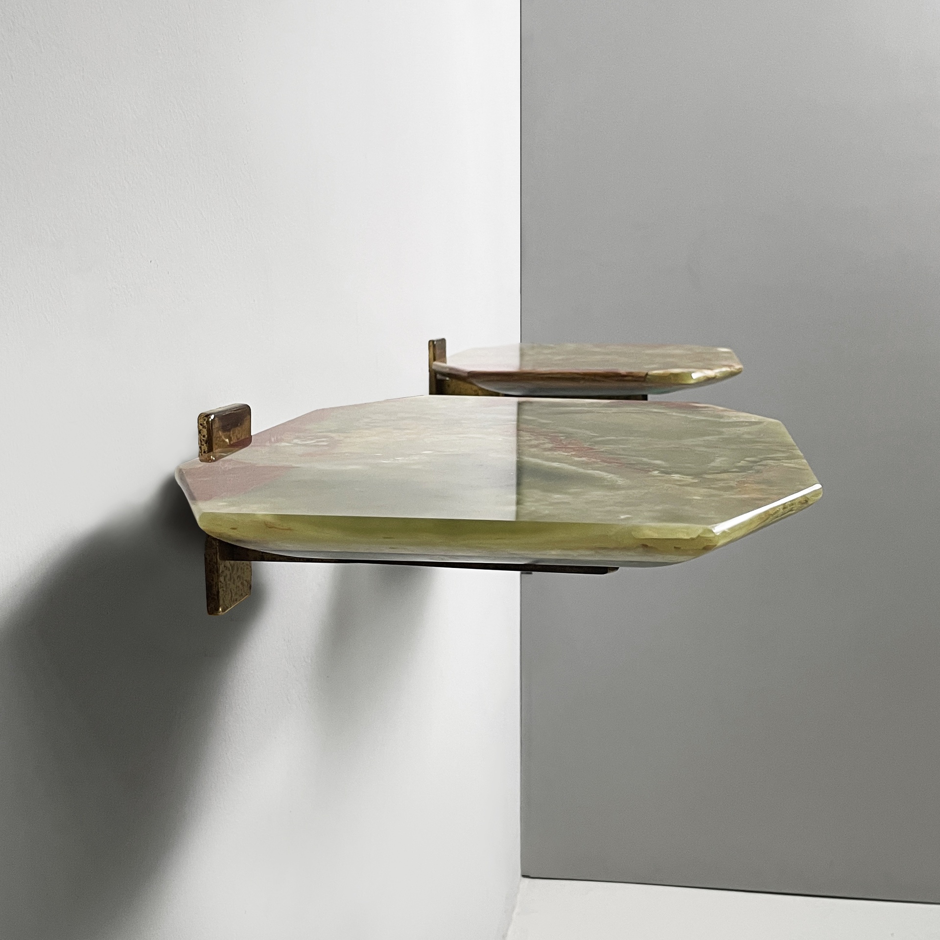 Coppia di comodini sospesi con piano sagomato in onice verde. La struttura in ottone su cui poggia il piano è composto da due bracci ed attacco a parete squadrato. Utilizzabili come piccole consolle.