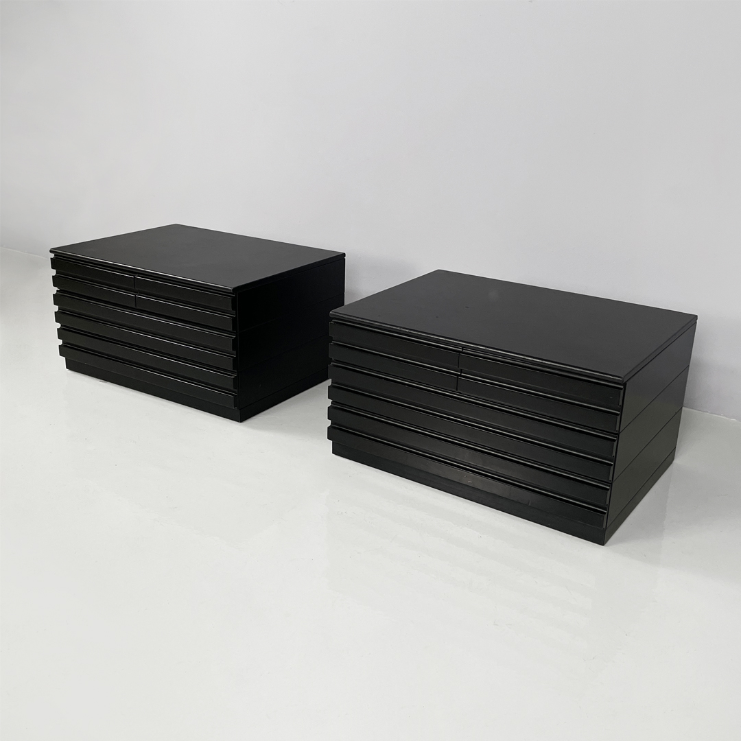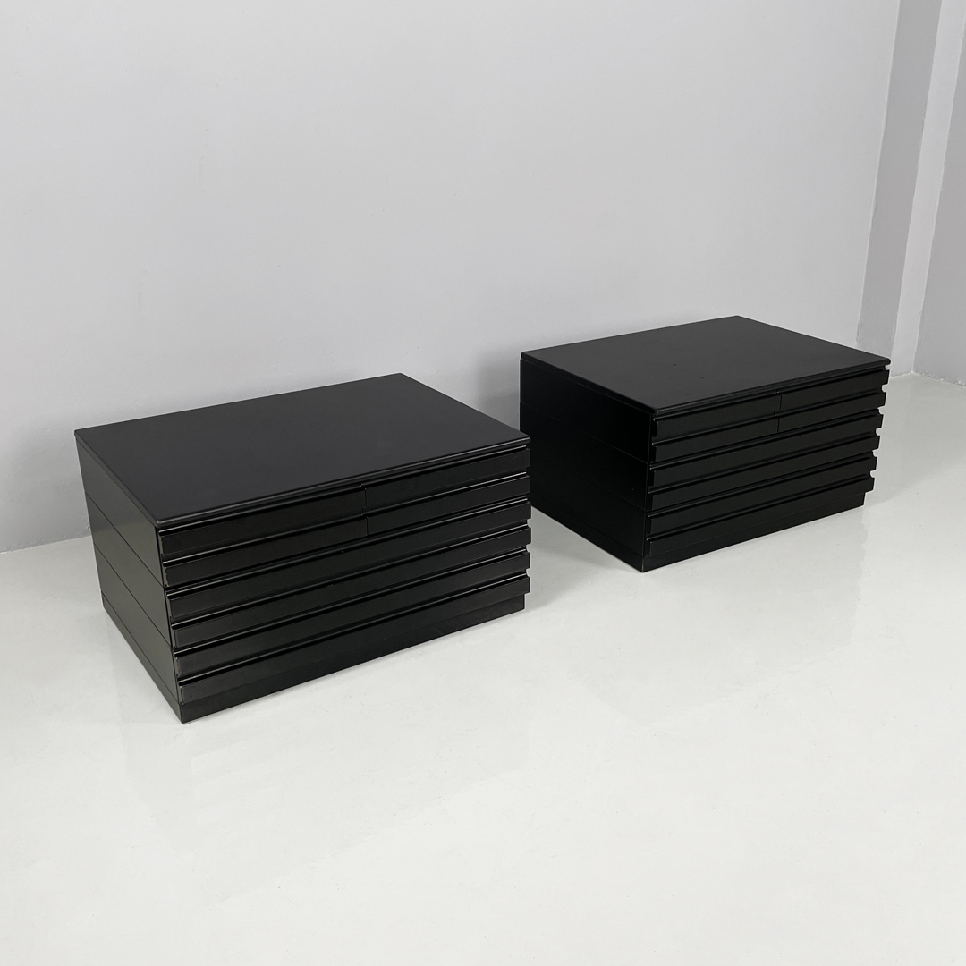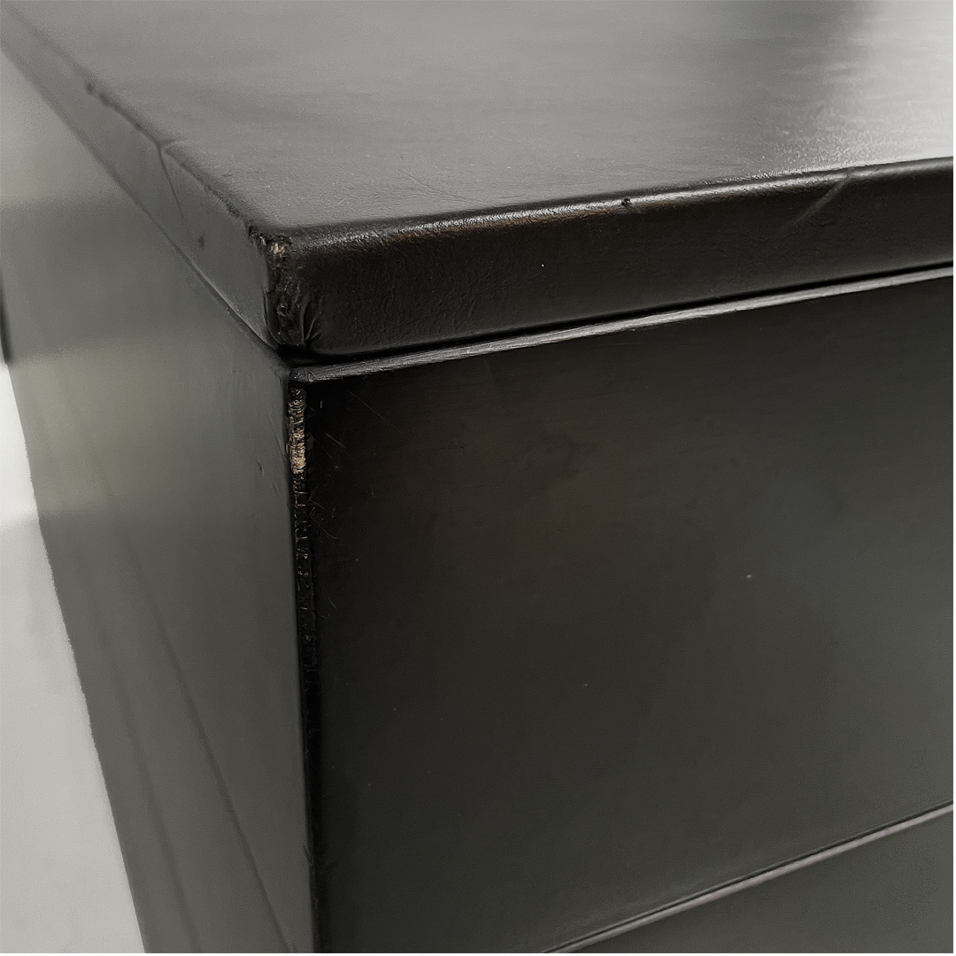 Coppia di comodini con cassetti in legno. Il piano ad angoli arrotondati è in pelle nera.