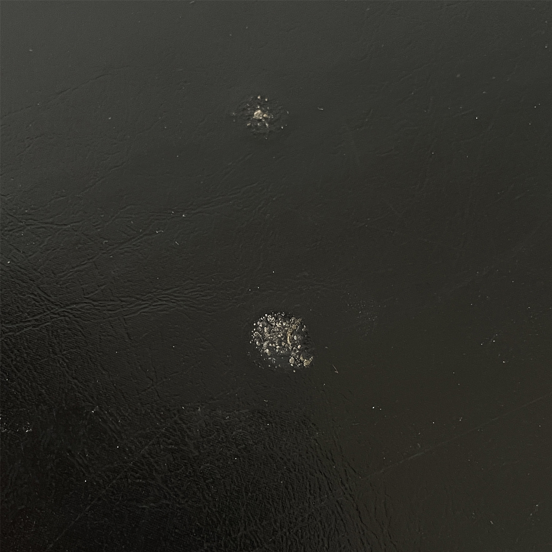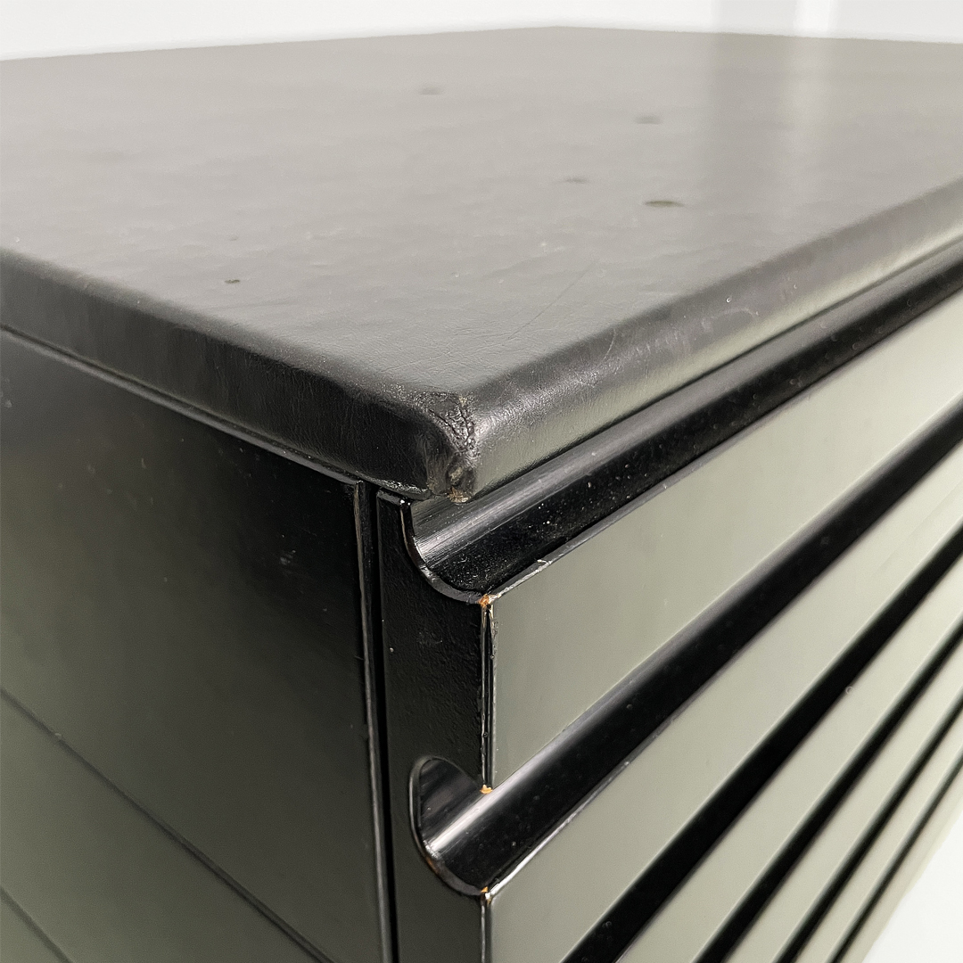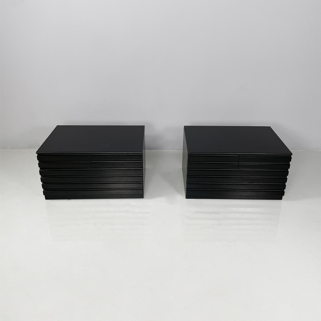 Coppia di comodini con cassetti in legno. Il piano ad angoli arrotondati è in pelle nera.