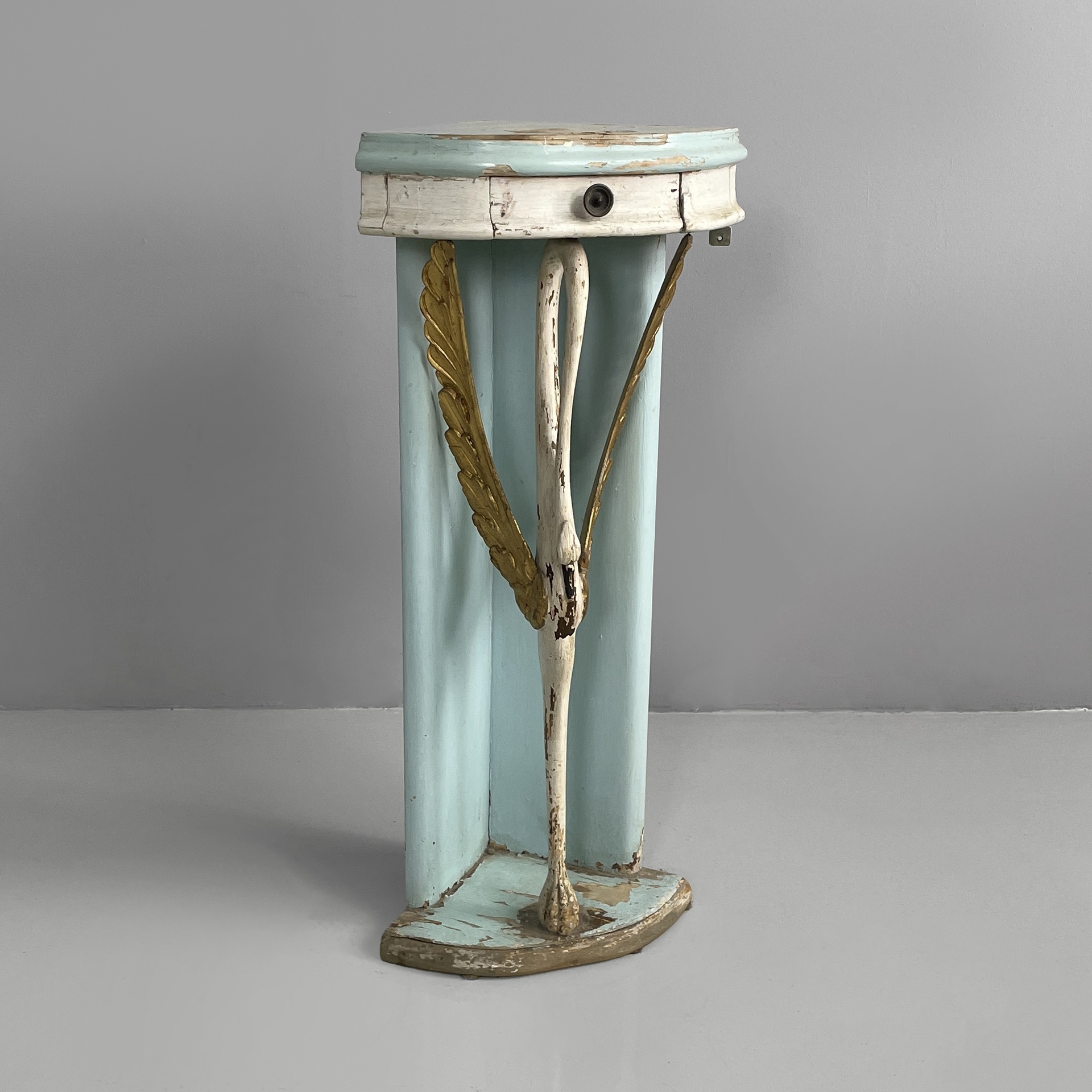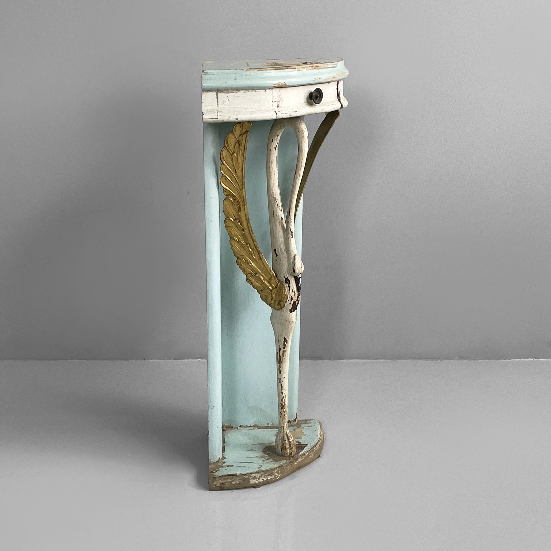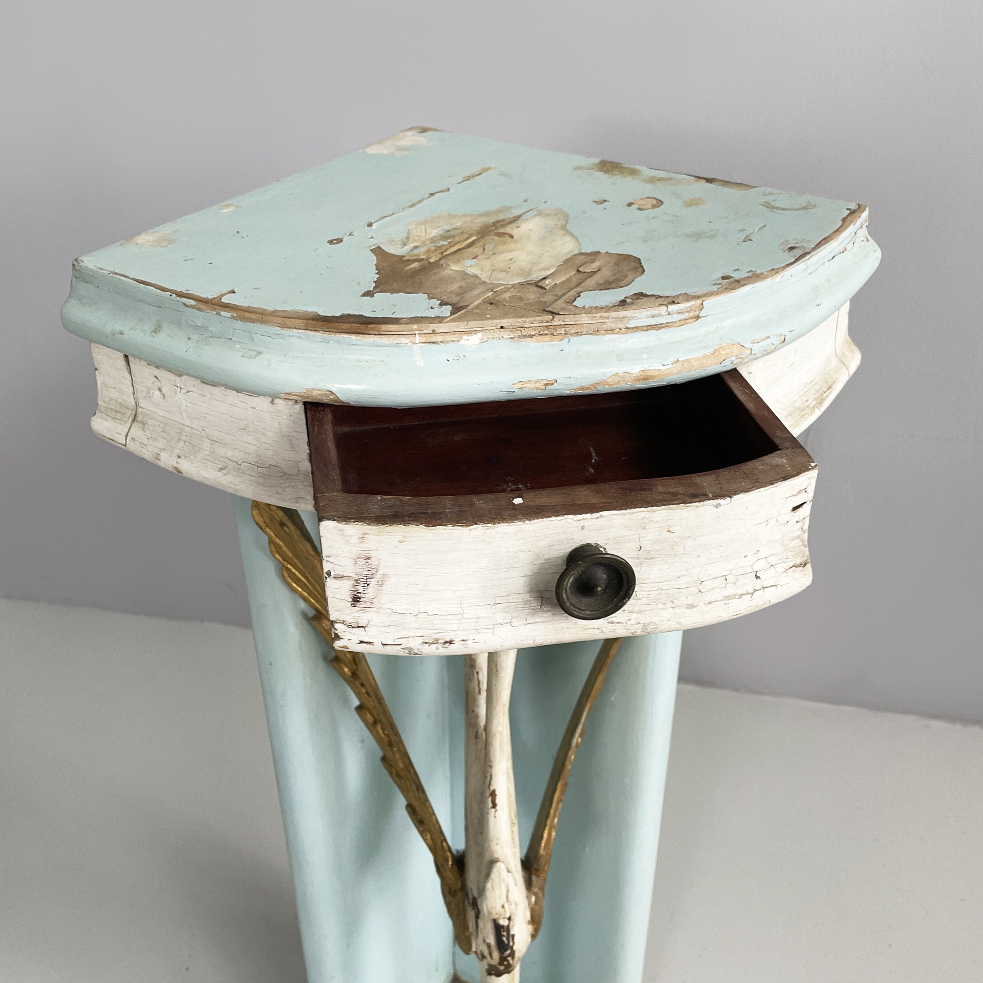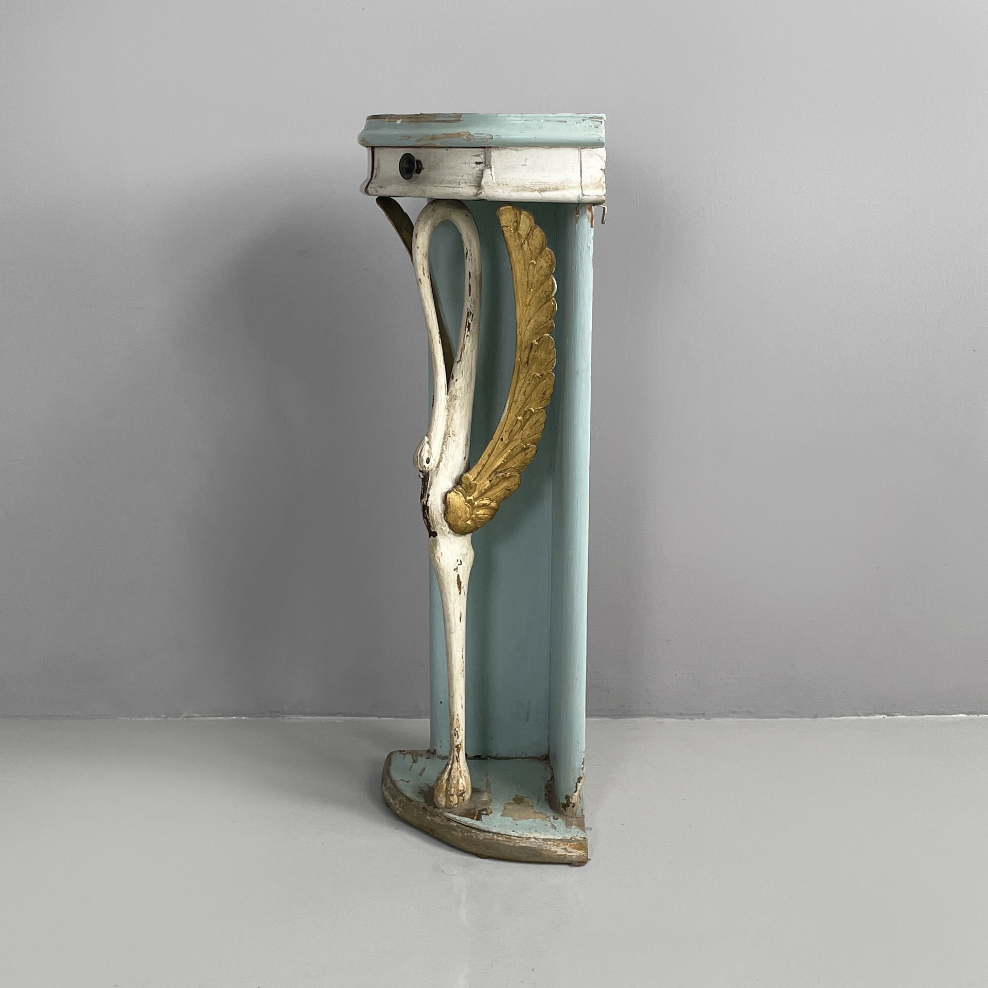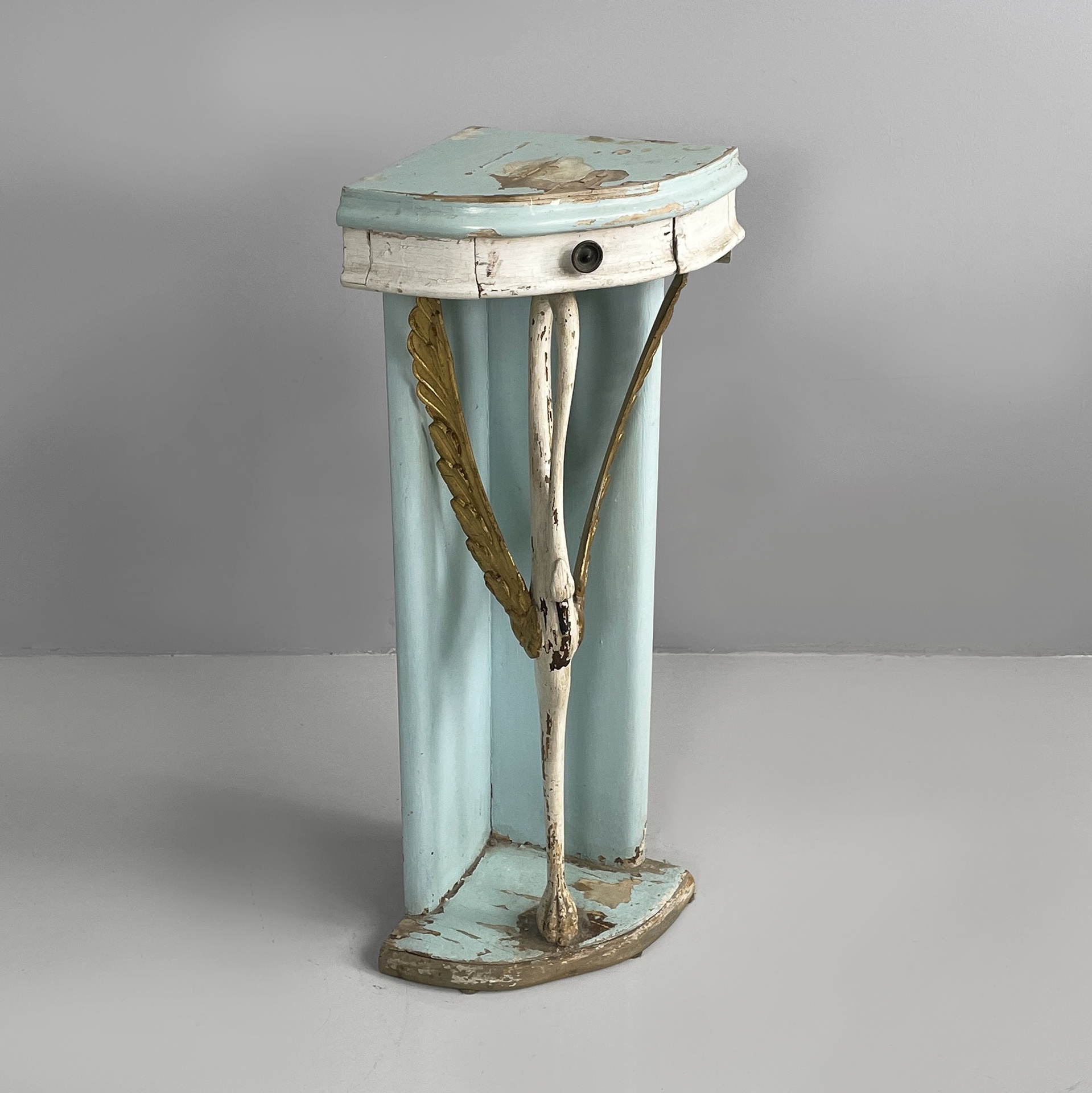 Consolle angolare con cassetto, in legno. Il piano a spicchio è in legno verniciato azzurro, mentre il cassetto sottostante è in legno verniciato bianco. Il pomello è in metallo. La struttura è composta da due listelli in legno verniciato azzurro e una colonna centrale a forma di cigno o airone bianco con ali dorate. Base a spicchio in legno azzurro.