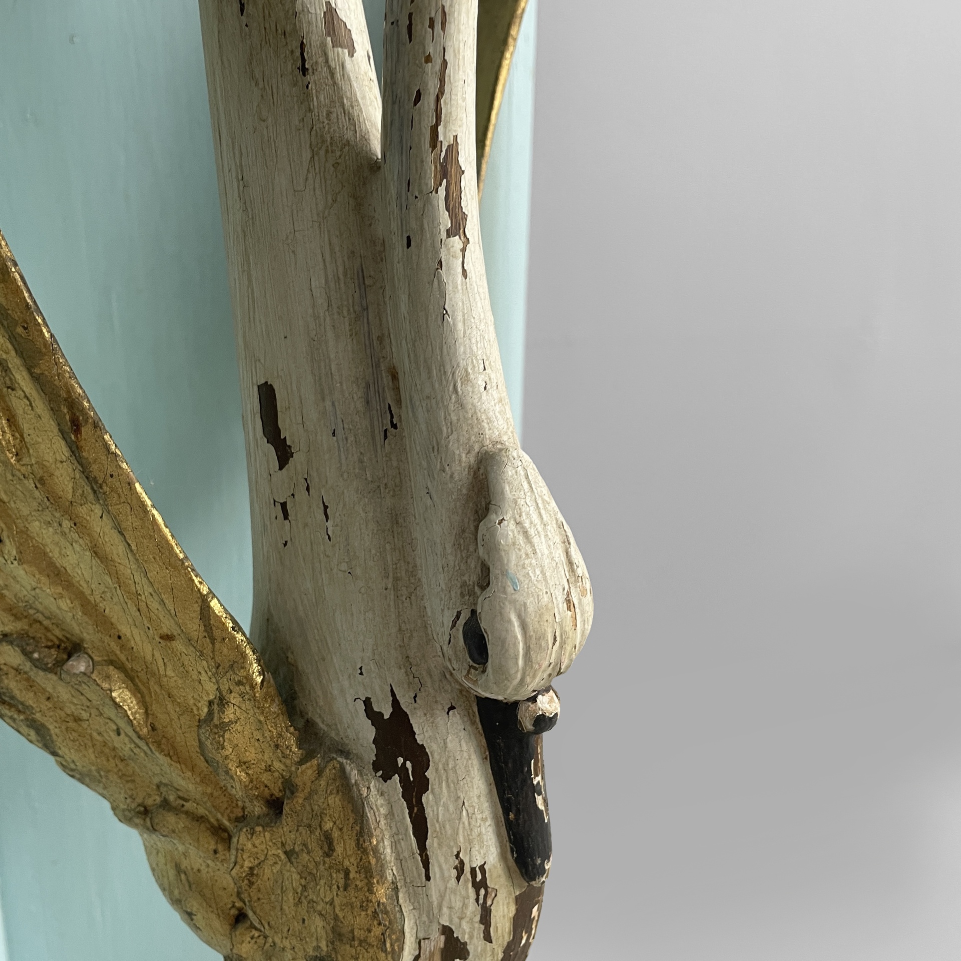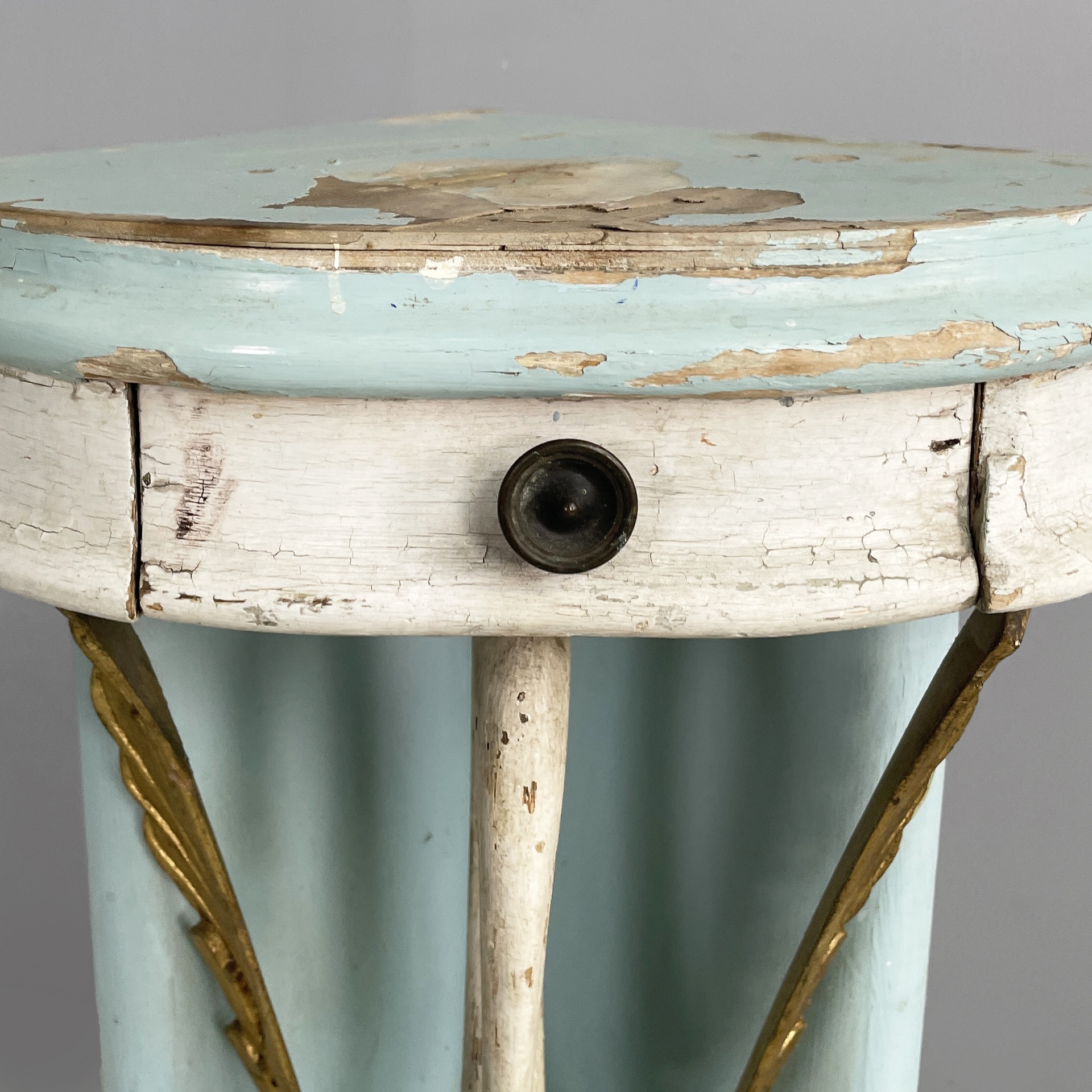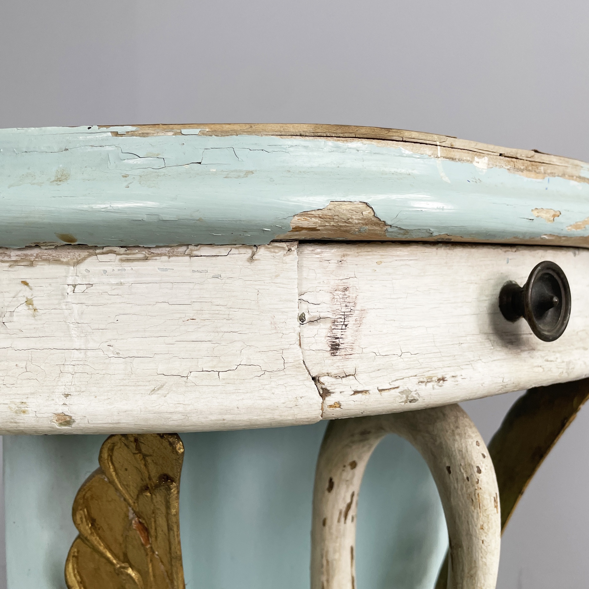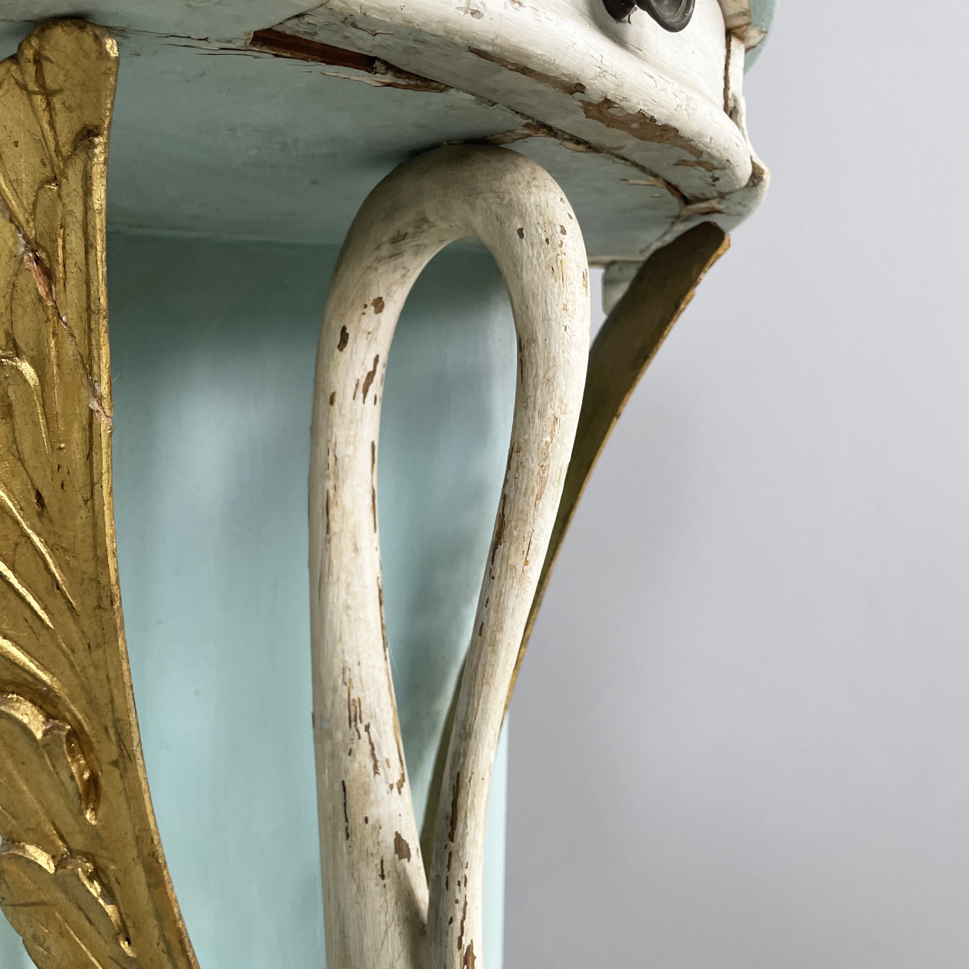 Consolle angolare con cassetto, in legno. Il piano a spicchio è in legno verniciato azzurro, mentre il cassetto sottostante è in legno verniciato bianco. Il pomello è in metallo. La struttura è composta da due listelli in legno verniciato azzurro e una colonna centrale a forma di cigno o airone bianco con ali dorate. Base a spicchio in legno azzurro.