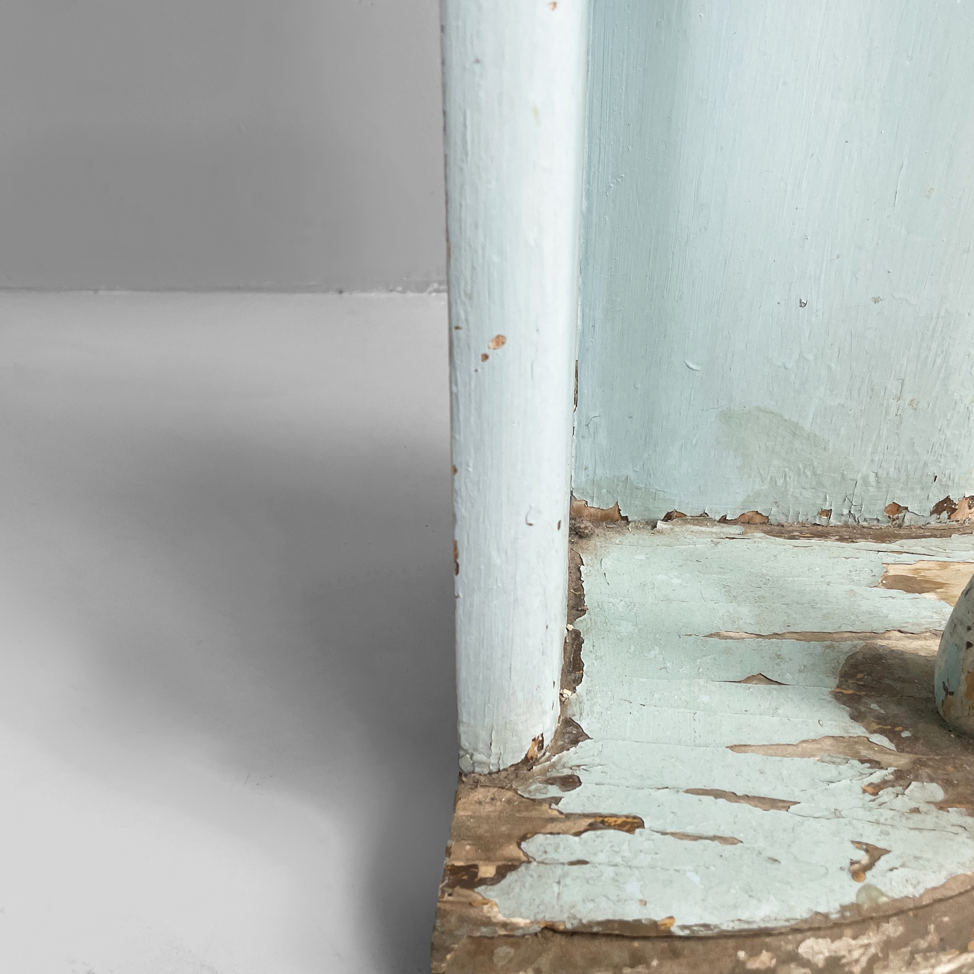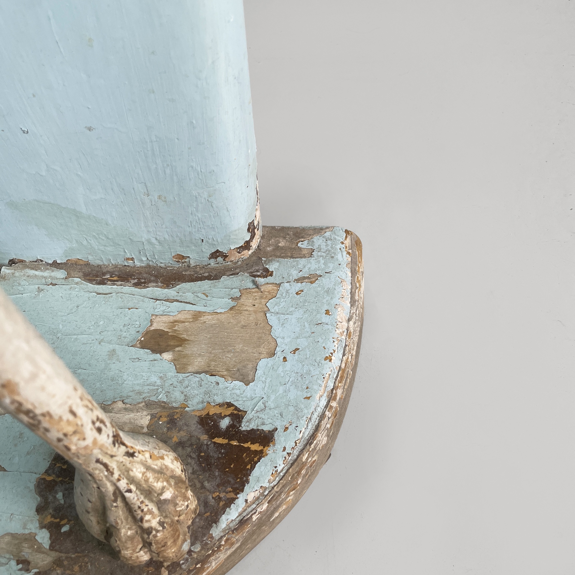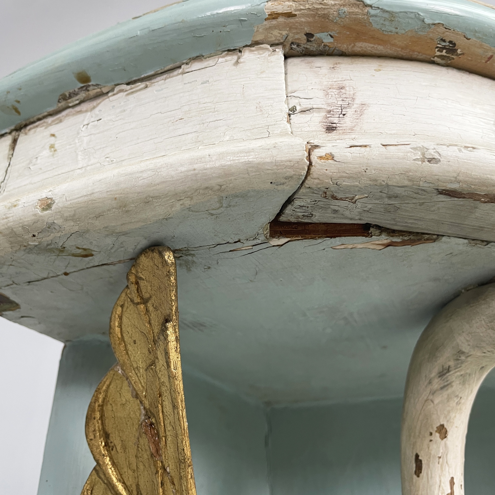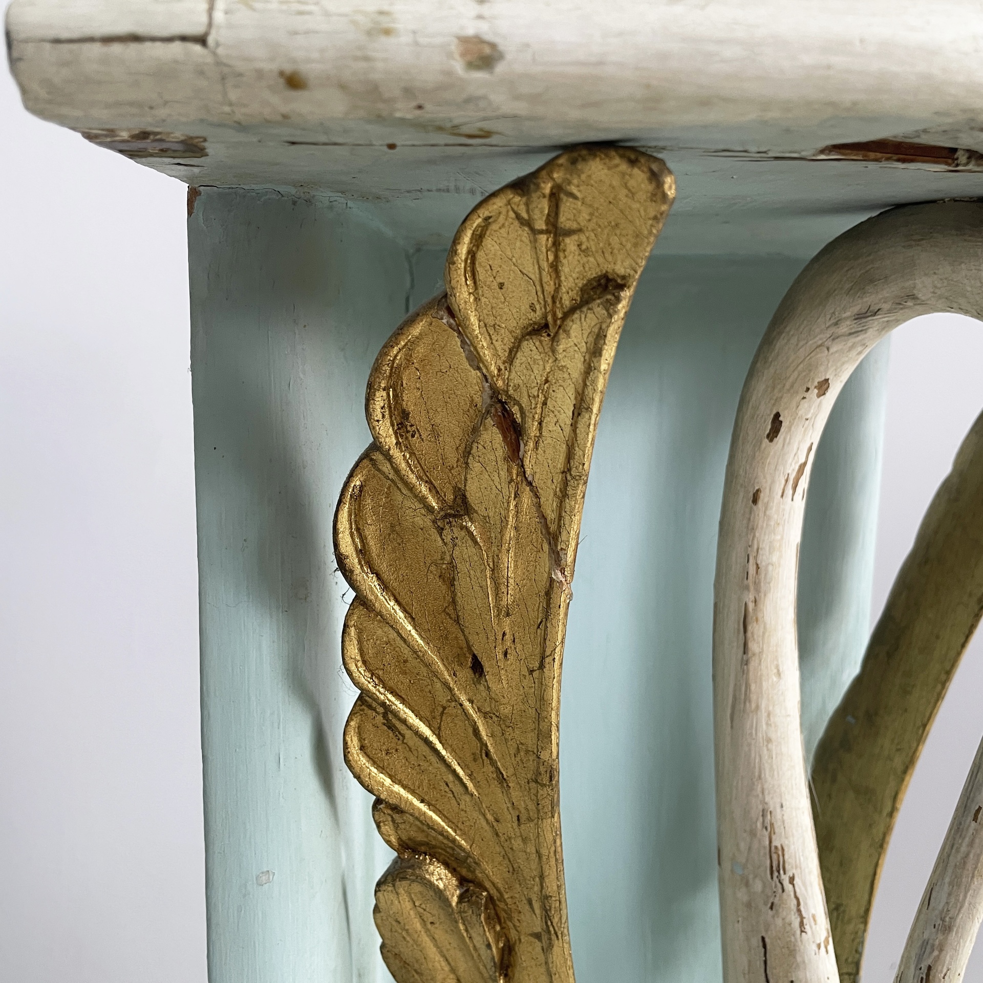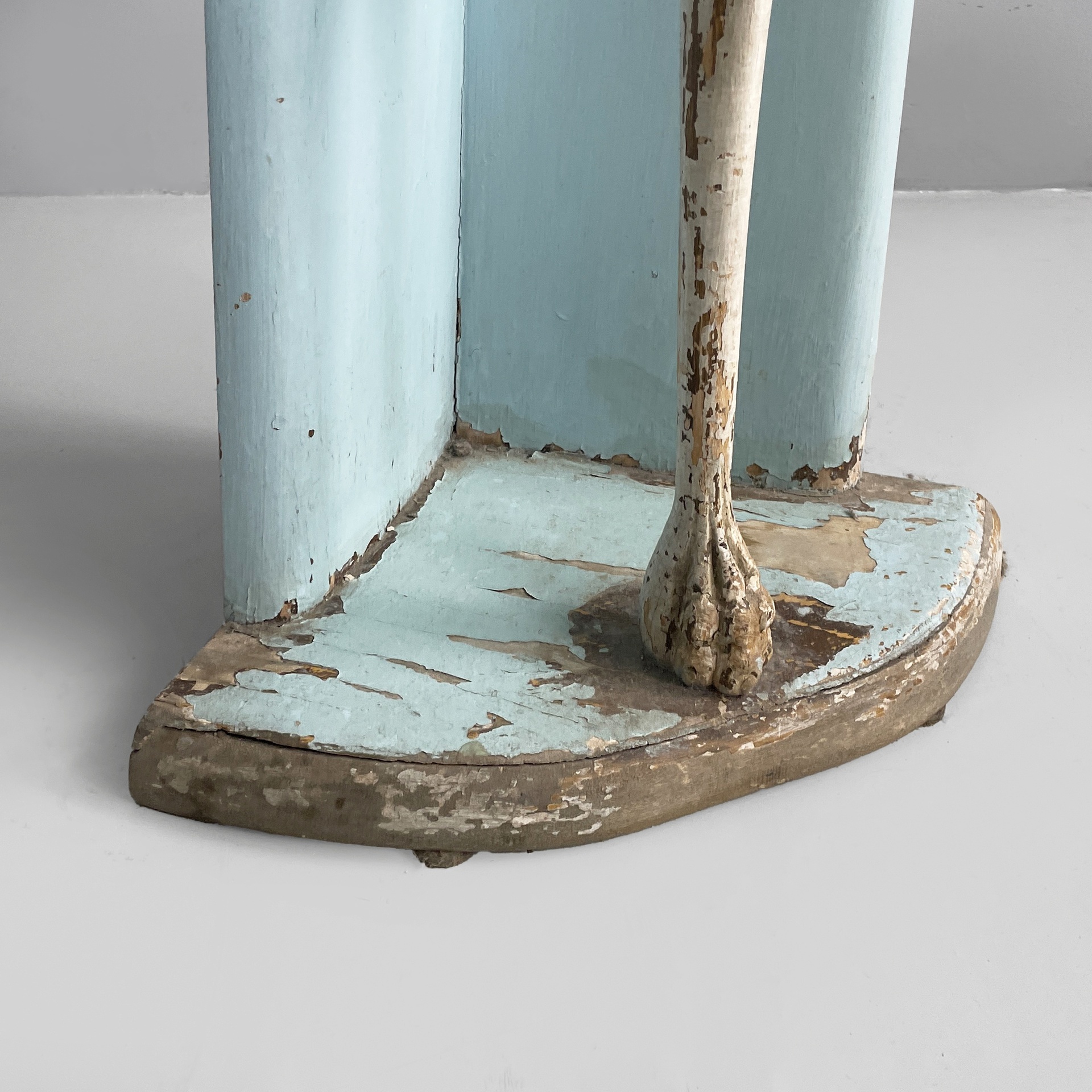 Consolle angolare con cassetto, in legno. Il piano a spicchio è in legno verniciato azzurro, mentre il cassetto sottostante è in legno verniciato bianco. Il pomello è in metallo. La struttura è composta da due listelli in legno verniciato azzurro e una colonna centrale a forma di cigno o airone bianco con ali dorate. Base a spicchio in legno azzurro.
