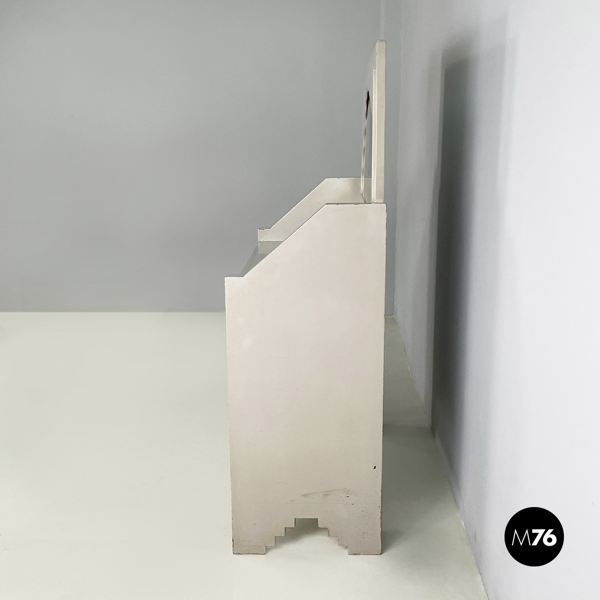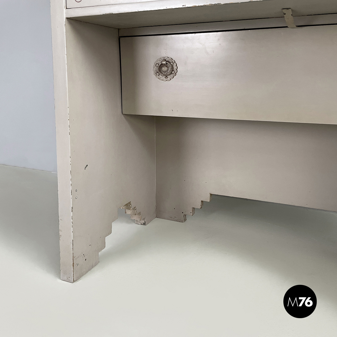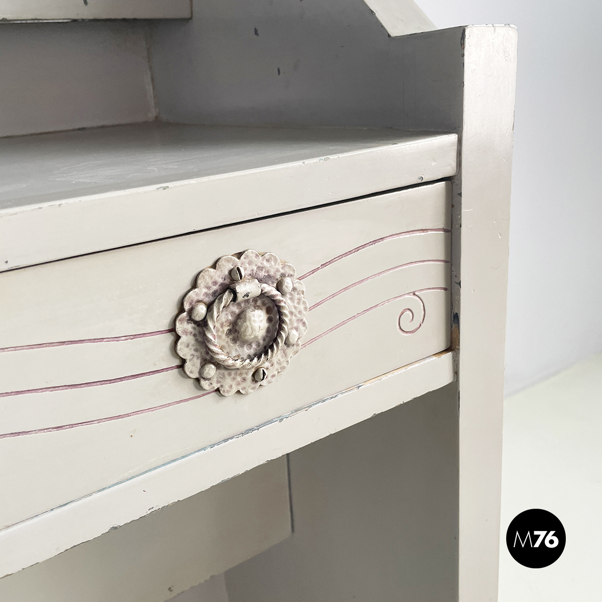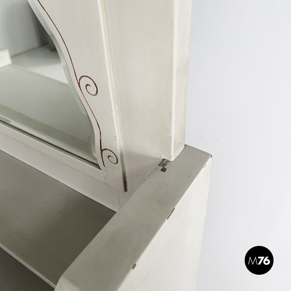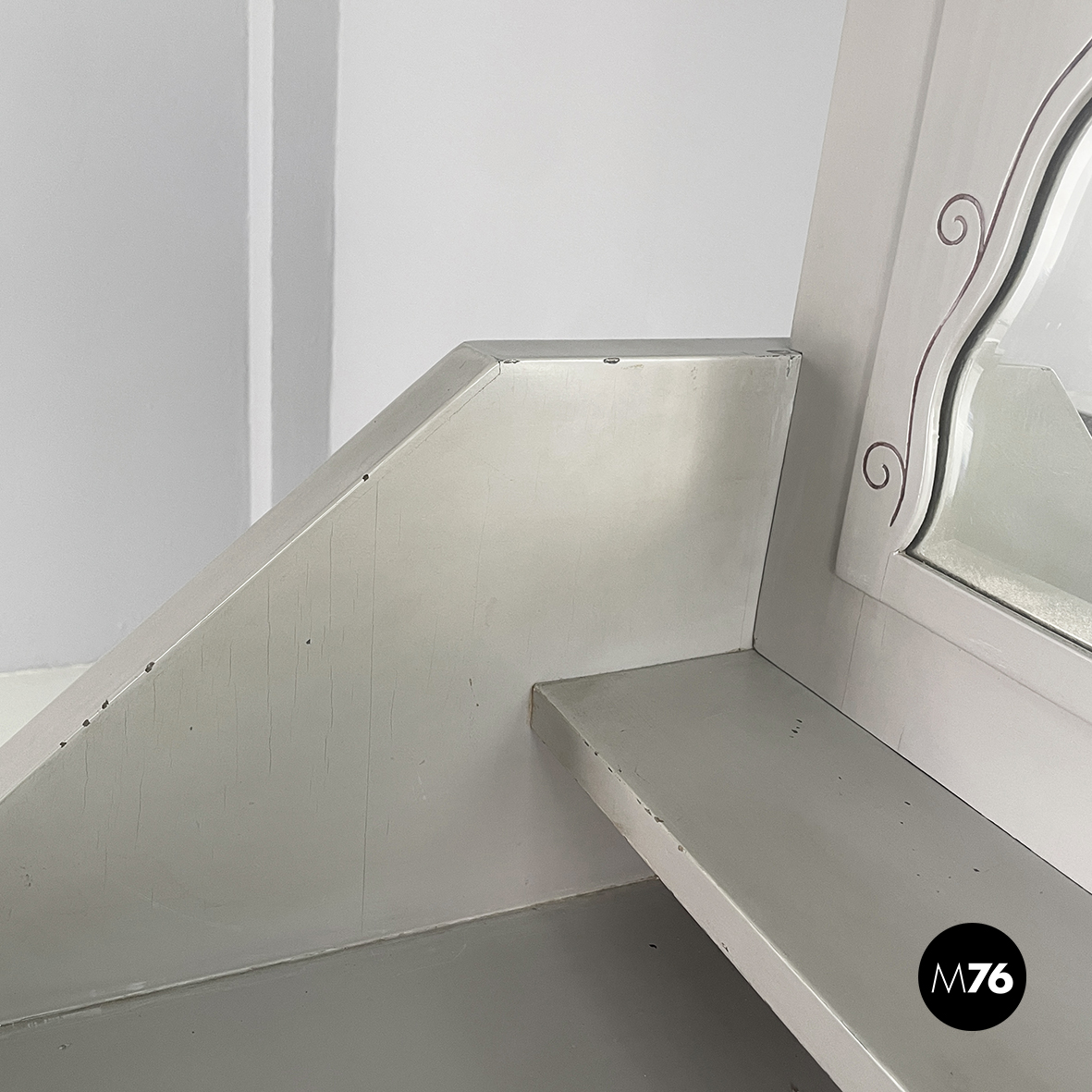 Consolle con specchio in legno verniciato grigio con decorazioni incise. Nella parte superiore è presente lo specchio a semicerchio con una struttura in legno rettangolare e decorazioni incise a ricciolo. Sul fronte presenta due ripiani rettangolari, ci cui uno più stretto. Inoltre ha due cassetti: uno con apertura a ribalta e l’altro con decorazioni incise ondulate. Le maniglie finemente lavorate sono in metallo verniciato in grigio. Zampe lavorate con motivo geometrico, “a gradini”. Non rifinita sul retro. Utilizzabile come toeletta o petineuse. Art Deco.