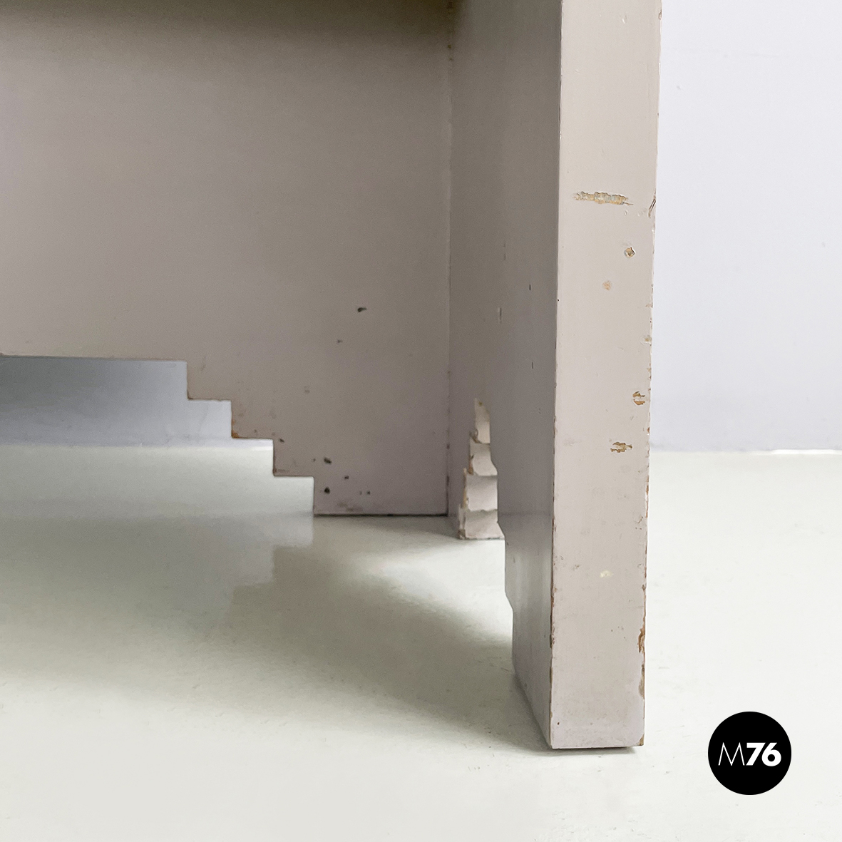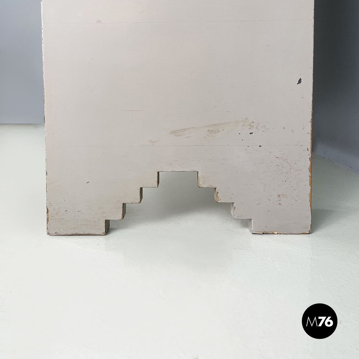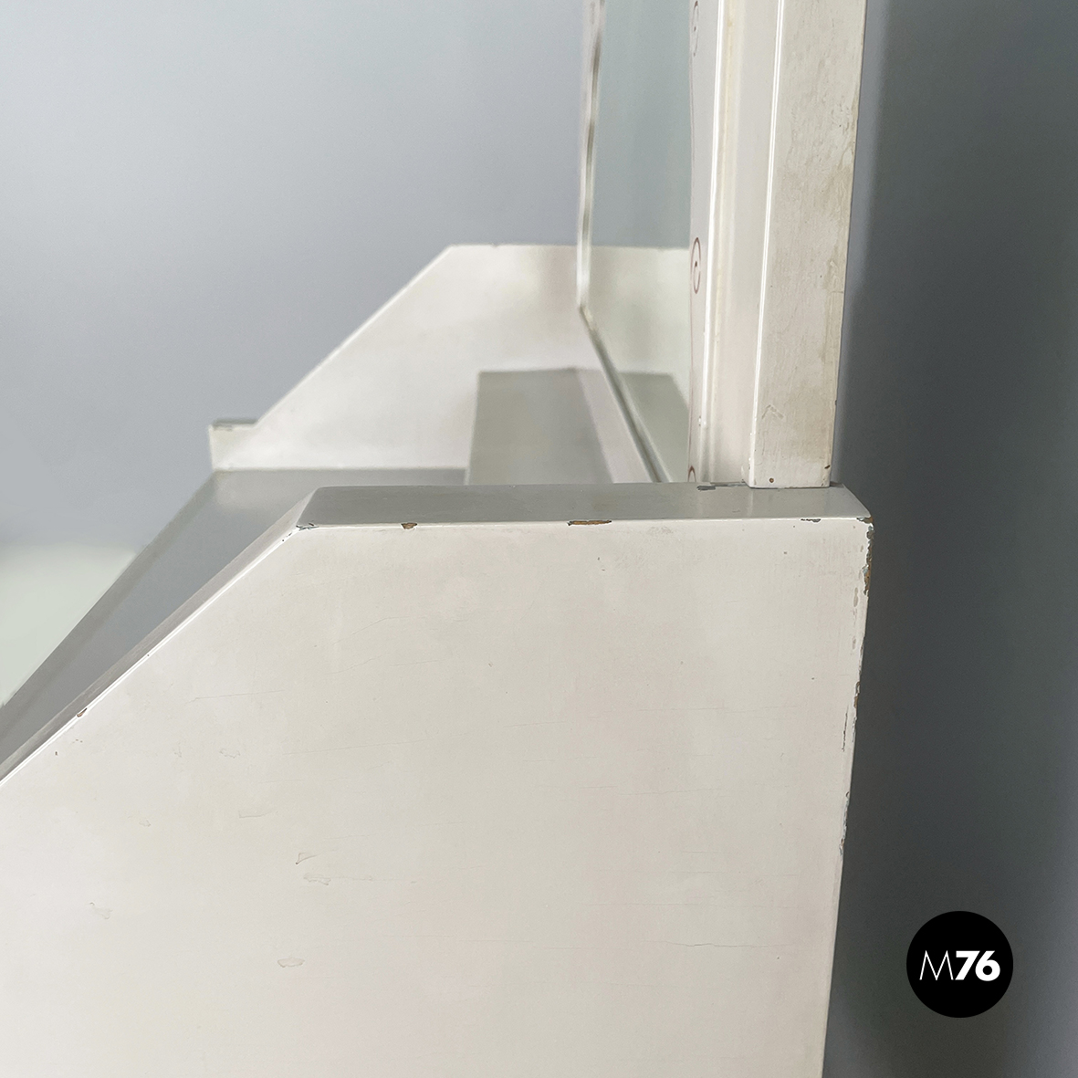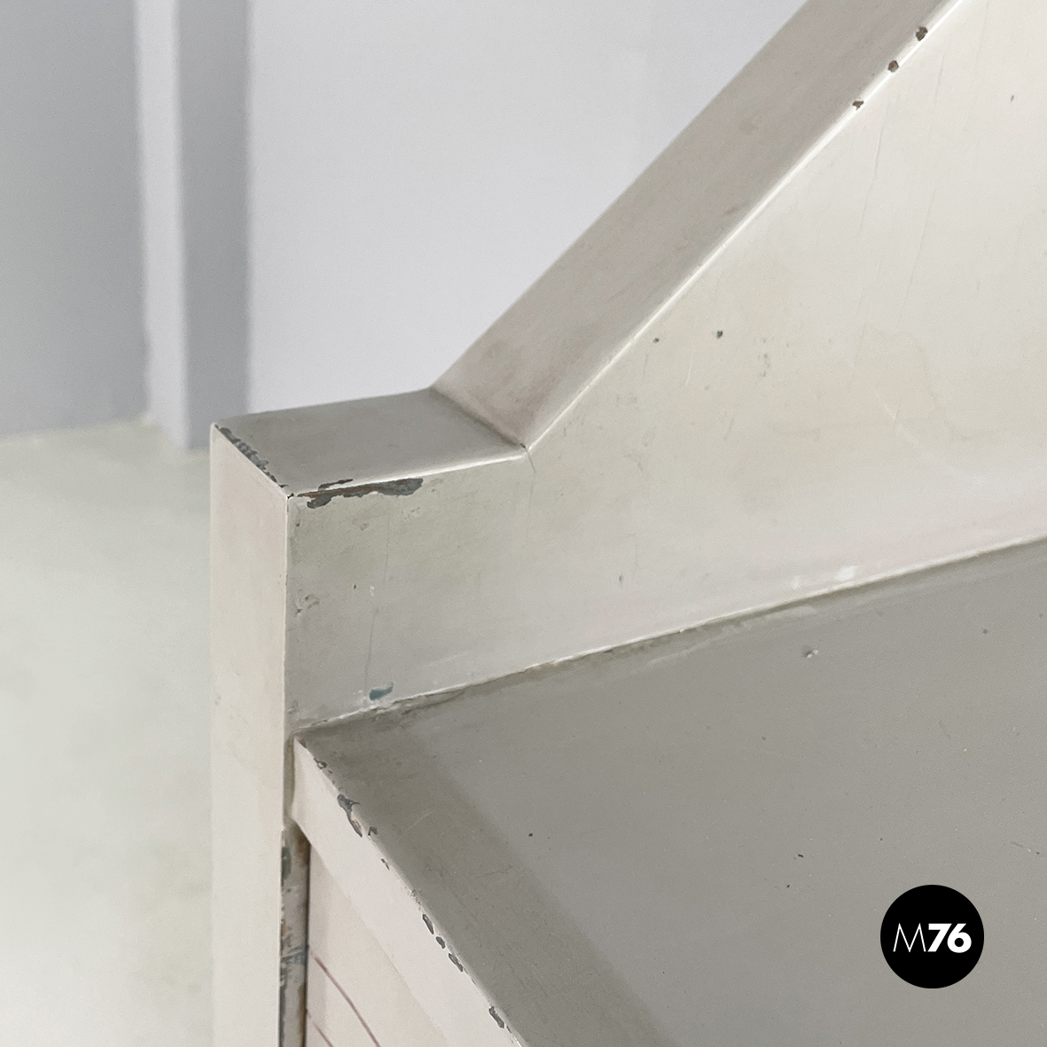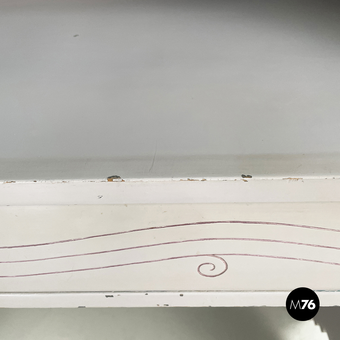Consolle con specchio in legno verniciato grigio con decorazioni incise. Nella parte superiore è presente lo specchio a semicerchio con una struttura in legno rettangolare e decorazioni incise a ricciolo. Sul fronte presenta due ripiani rettangolari, ci cui uno più stretto. Inoltre ha due cassetti: uno con apertura a ribalta e l’altro con decorazioni incise ondulate. Le maniglie finemente lavorate sono in metallo verniciato in grigio. Zampe lavorate con motivo geometrico, “a gradini”. Non rifinita sul retro. Utilizzabile come toeletta o petineuse. Art Deco.