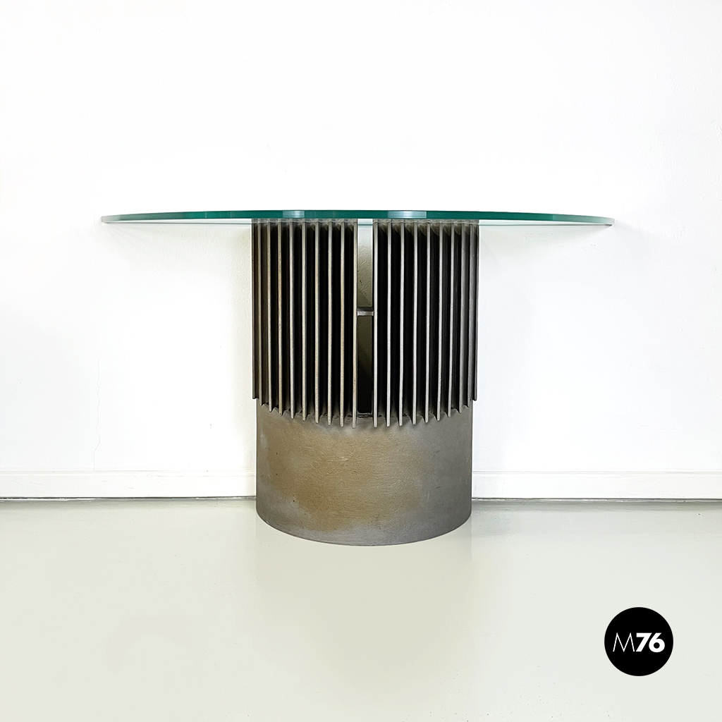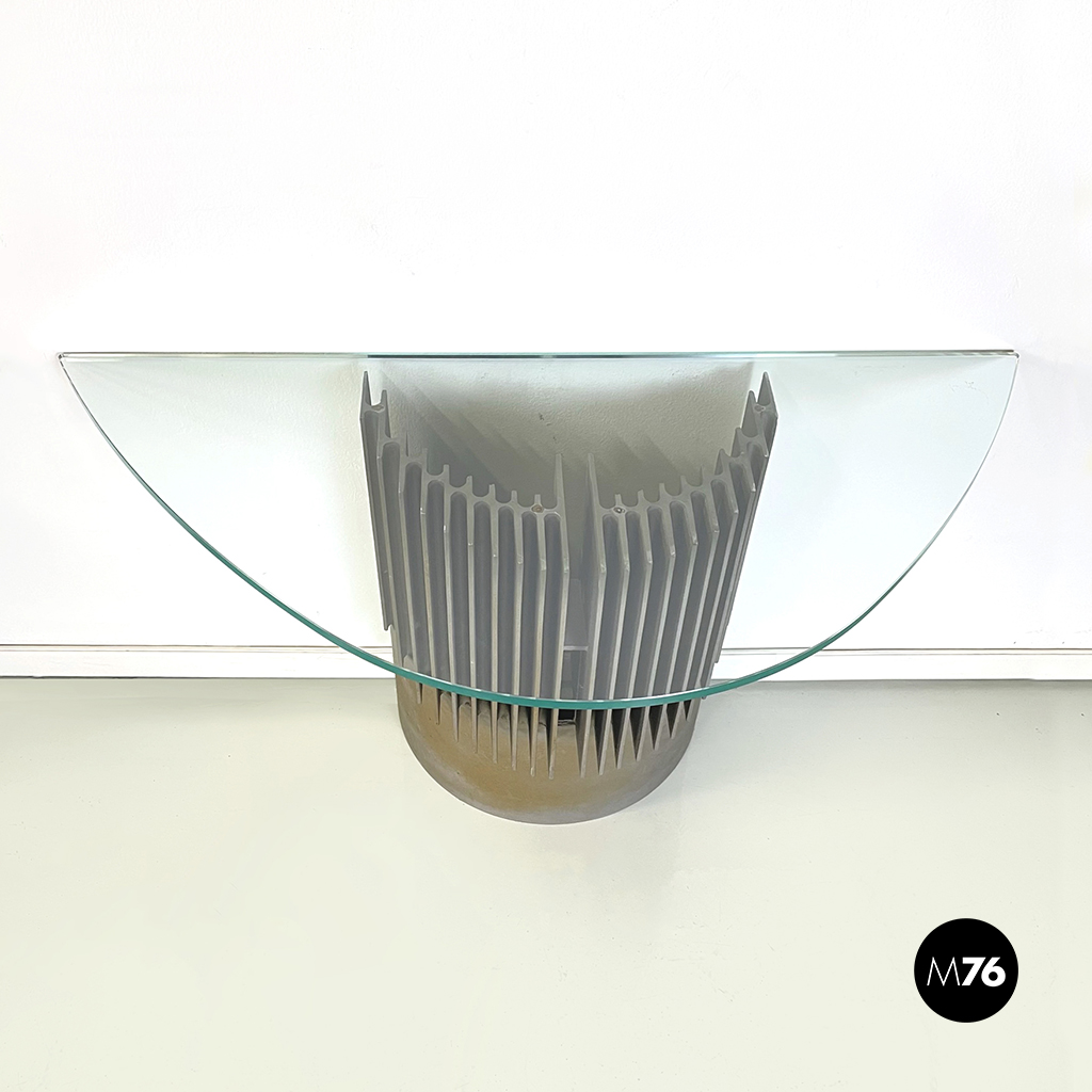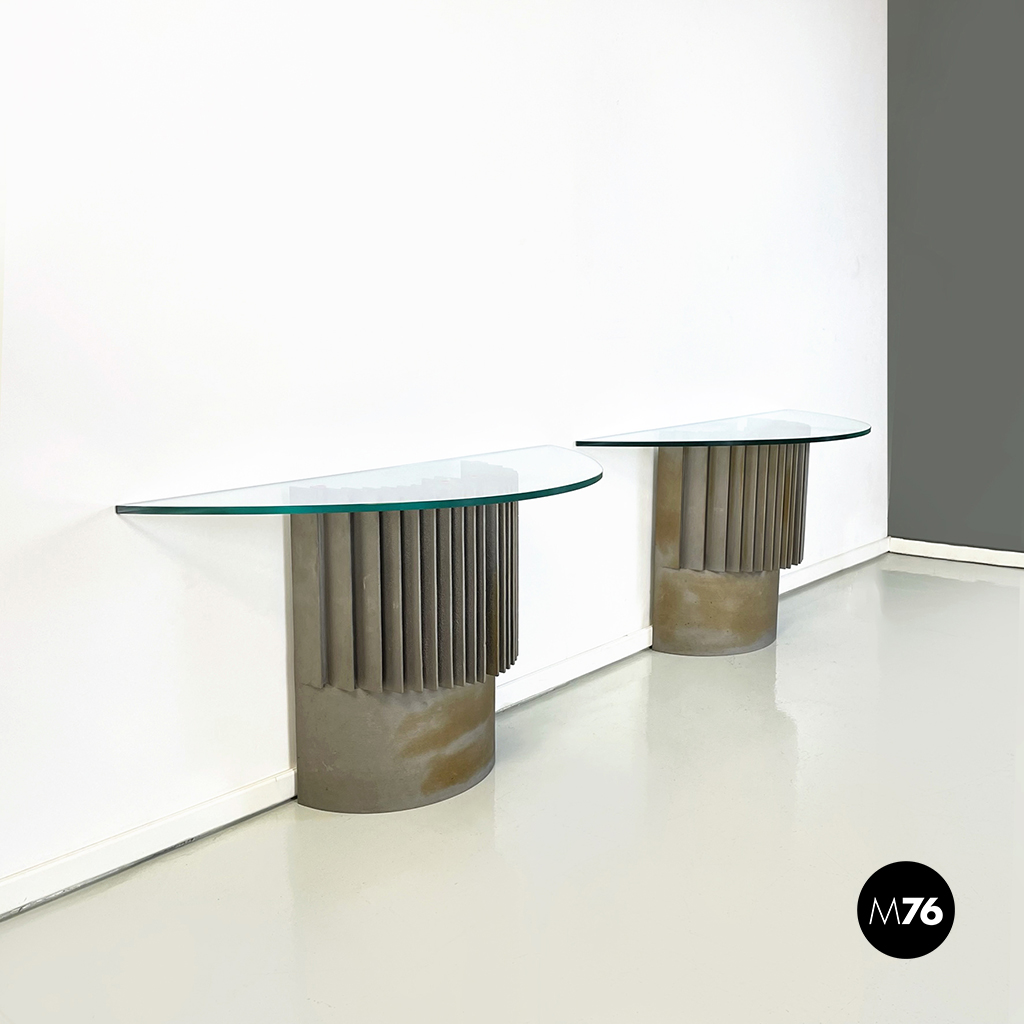 Coppia di consolle con piano semi-ovale in vetro spesso. La base in fusione di ghisa è composta da una parte superiore composta da listelli verticali e una parte inferiore a semi-cerchio.