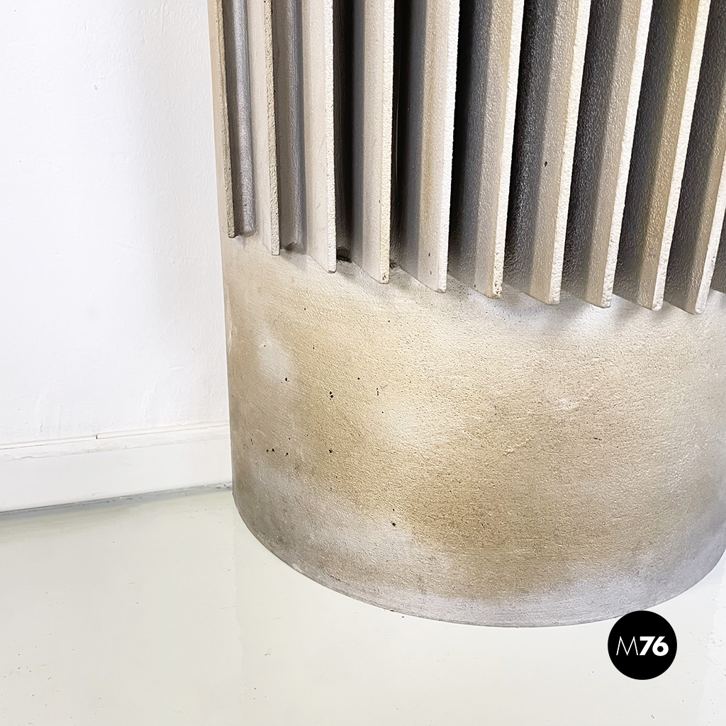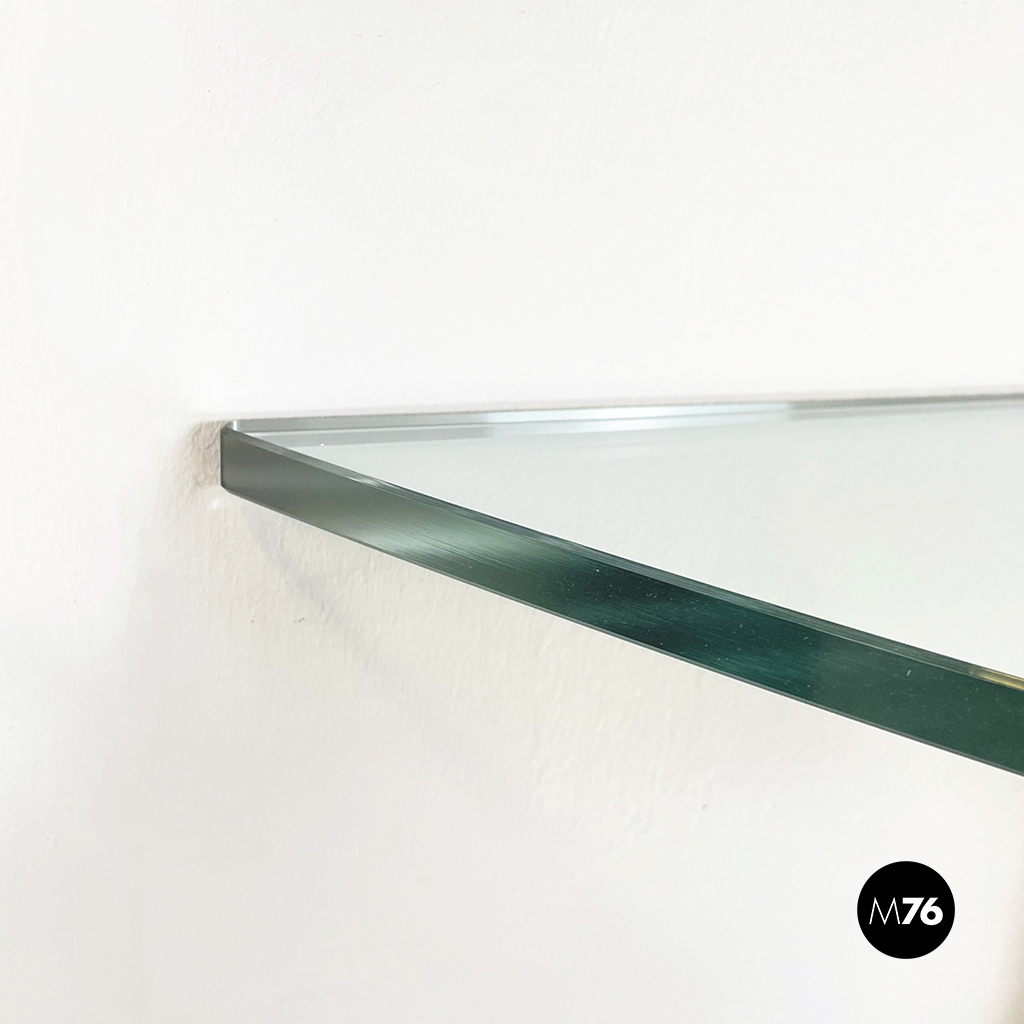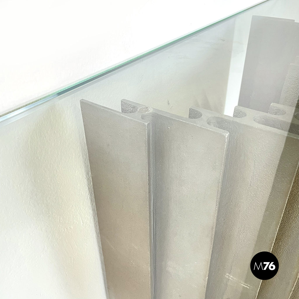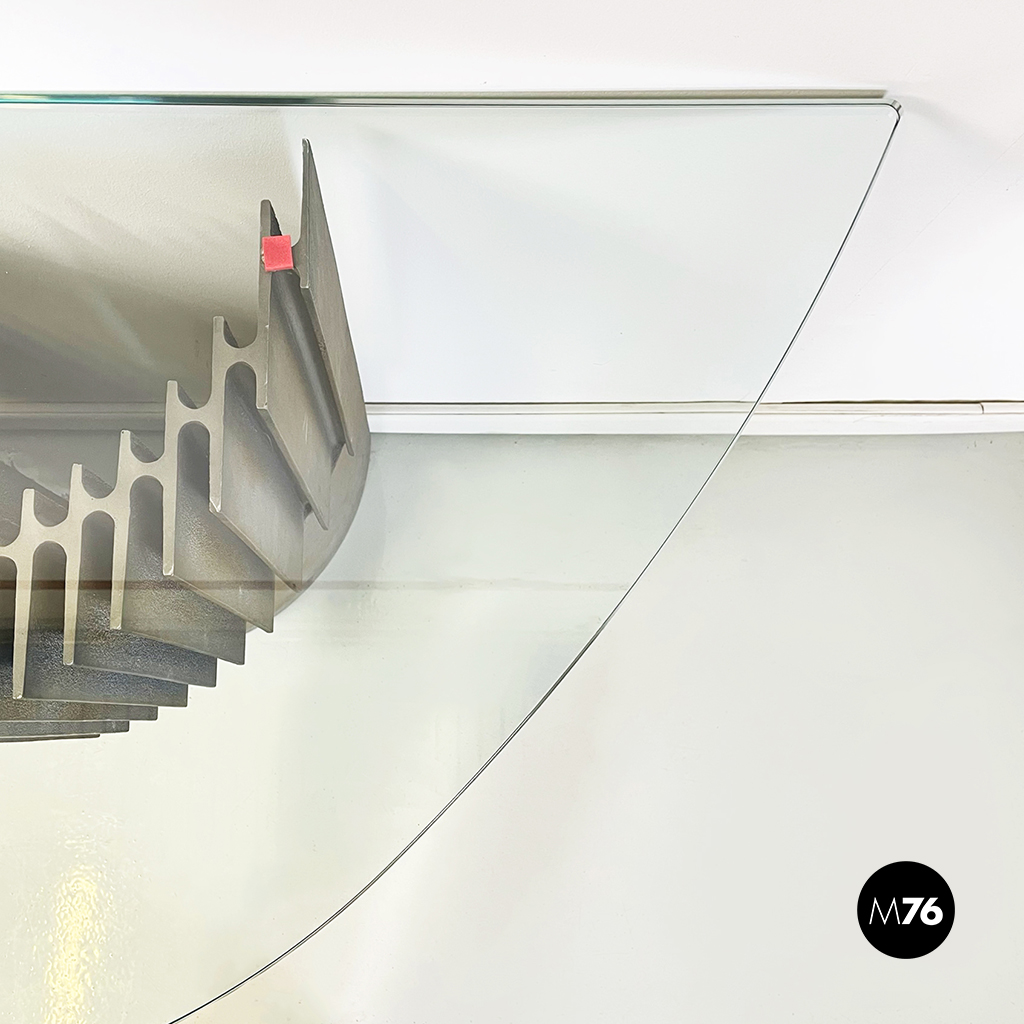 Coppia di consolle con piano semi-ovale in vetro spesso. La base in fusione di ghisa è composta da una parte superiore composta da listelli verticali e una parte inferiore a semi-cerchio.