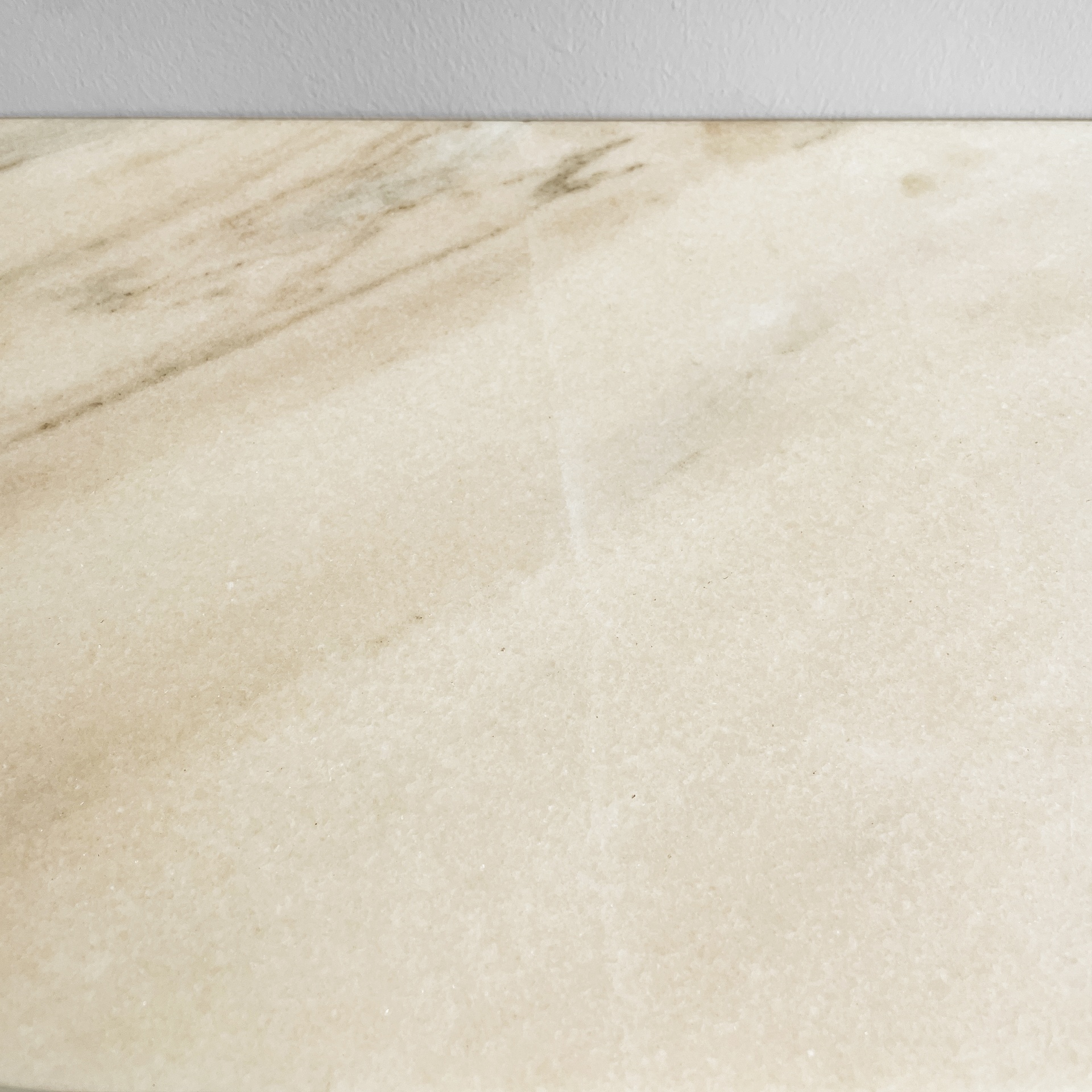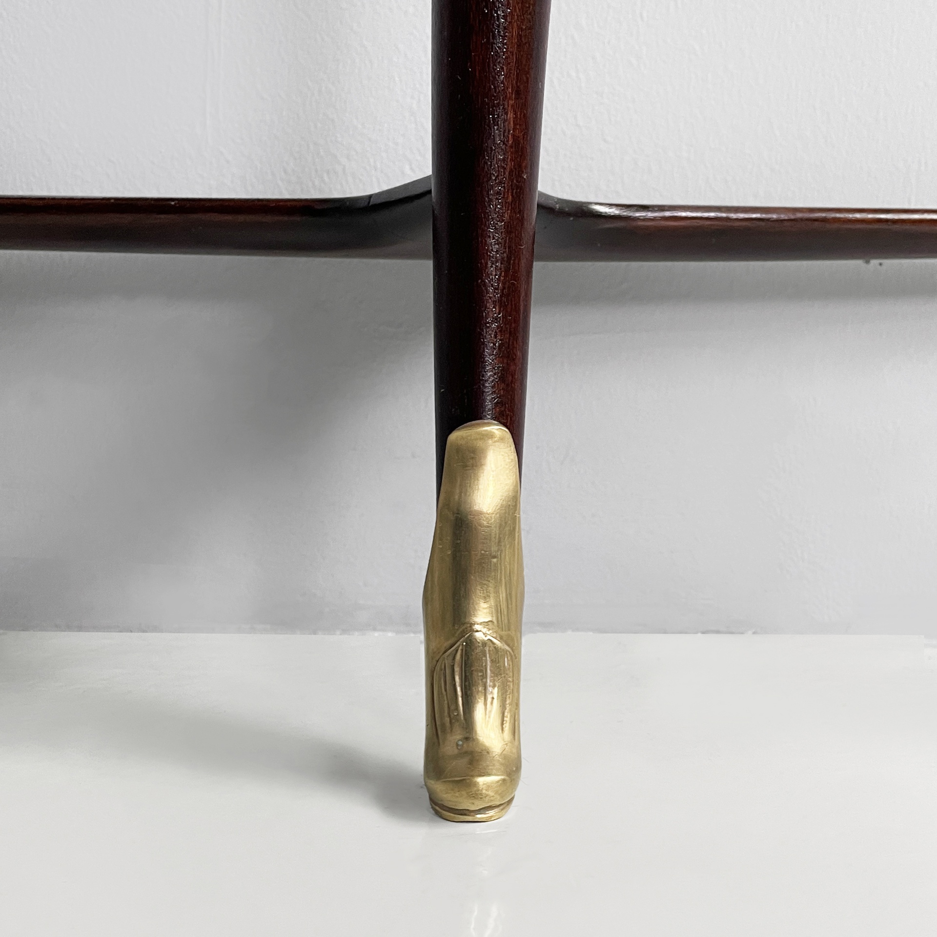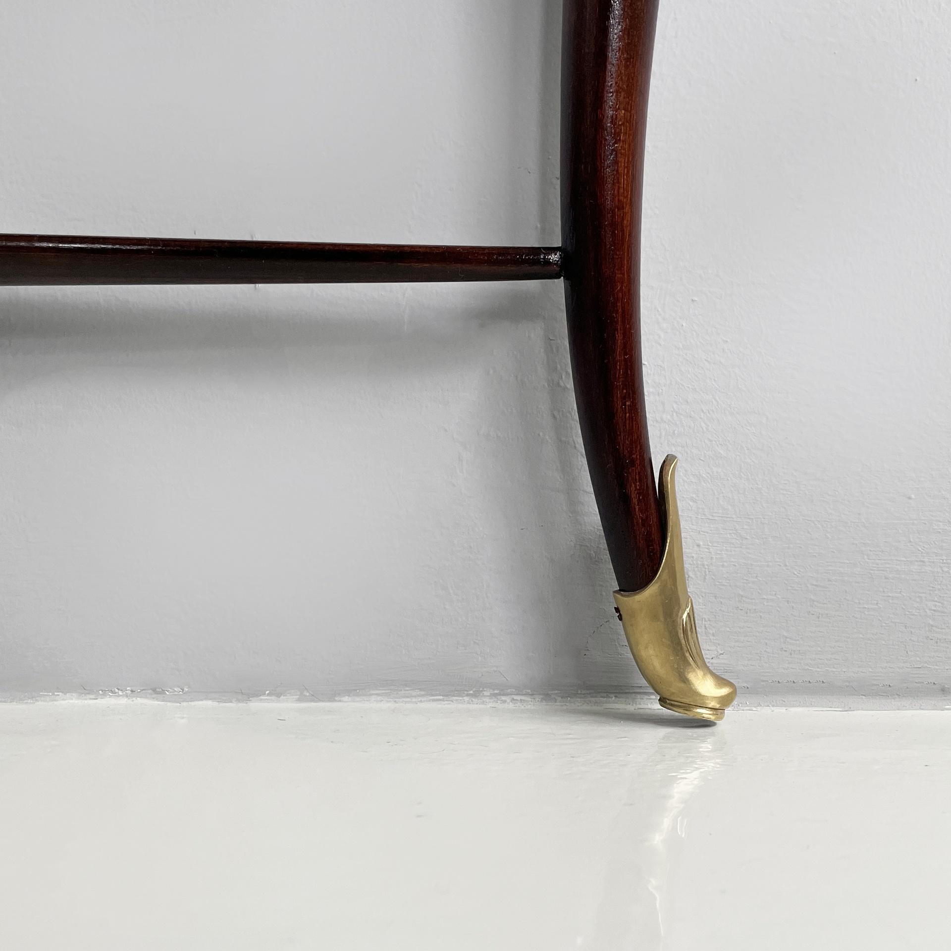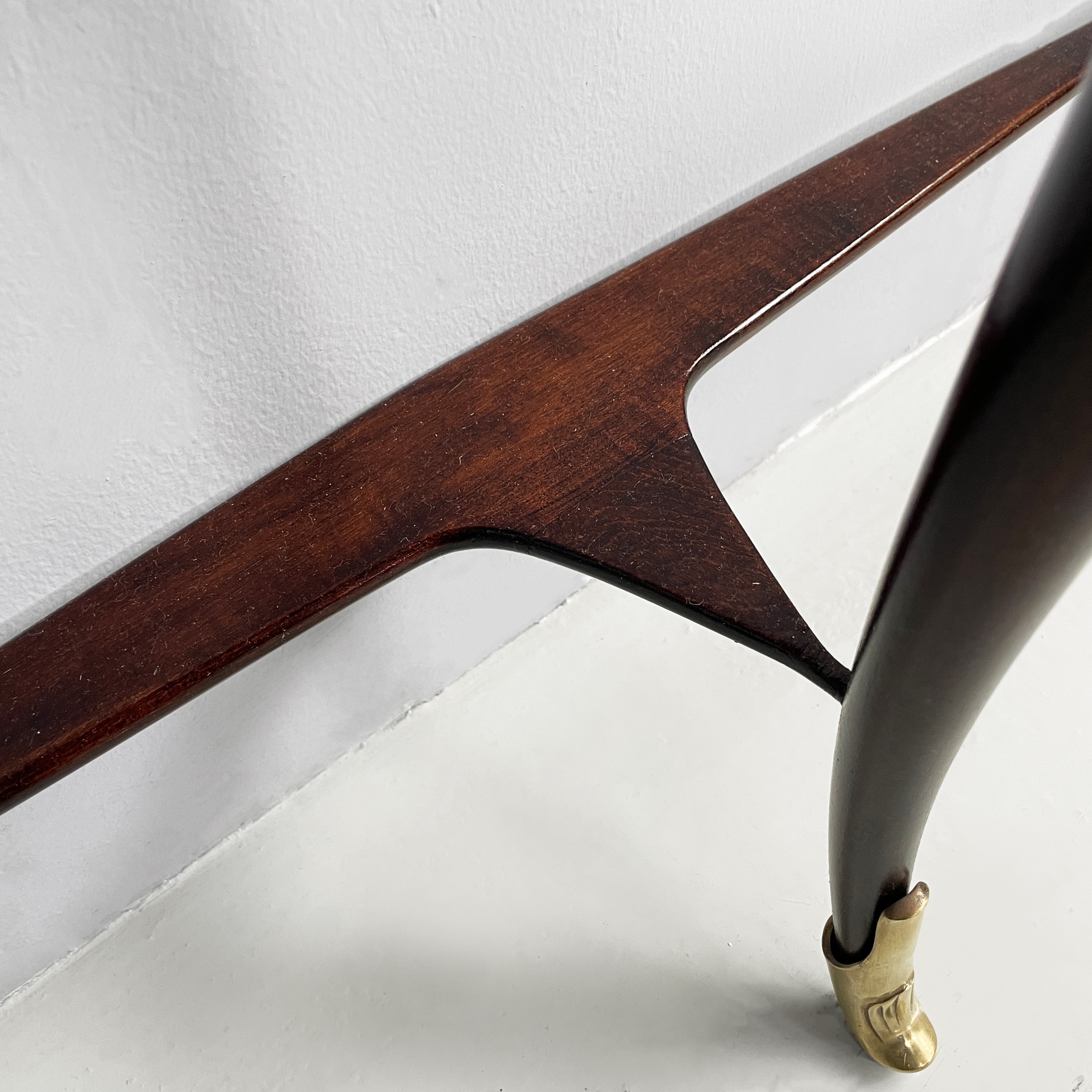Consolle da parete con piano semitondo in marmo bianco-rosa. La struttura a tre zampe è in legno scuro con dettagli e piedini in ottone lavorato.