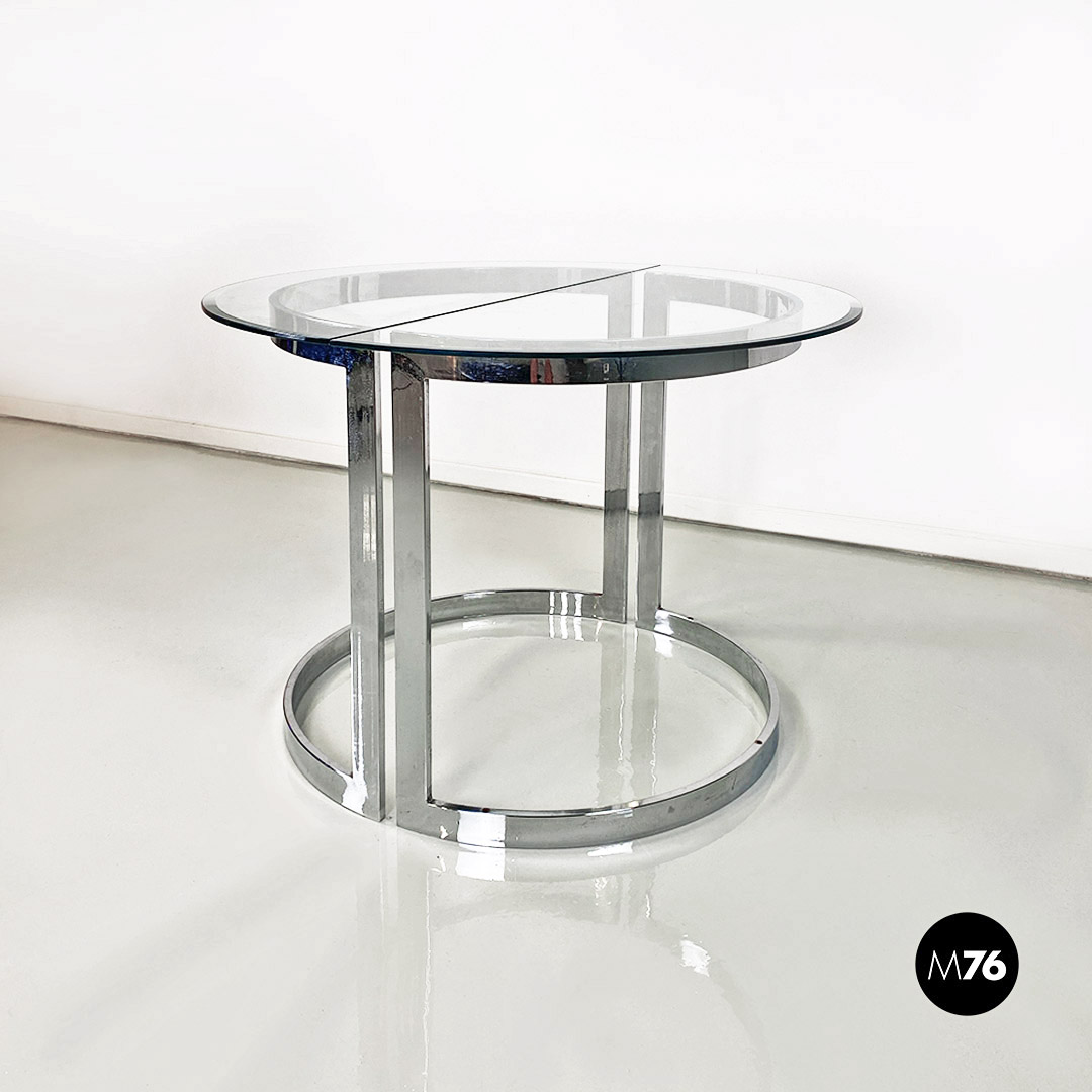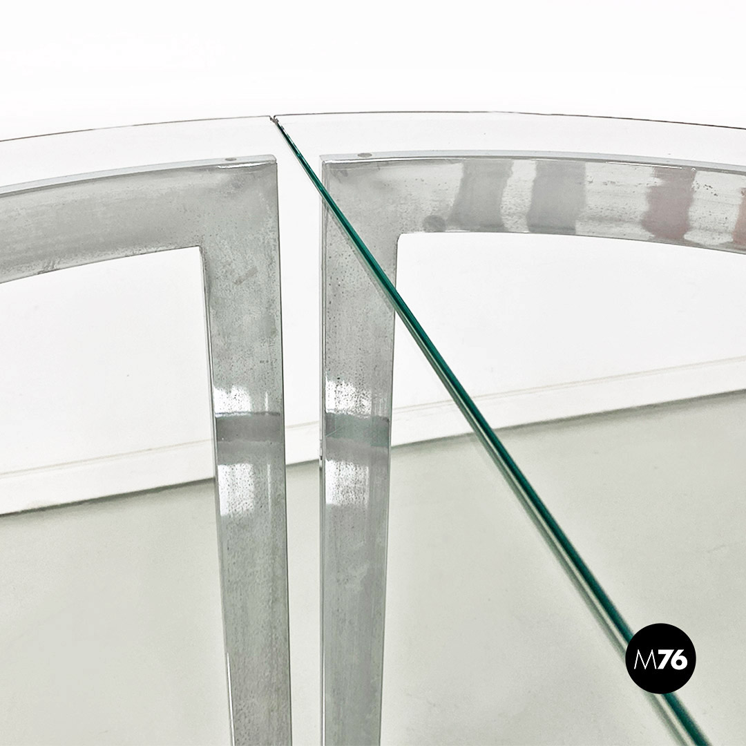 Coppia di consolle di provenienza parigina, con struttura in acciaio cromato, con piano di forma semicircolare in vetro bisellato.