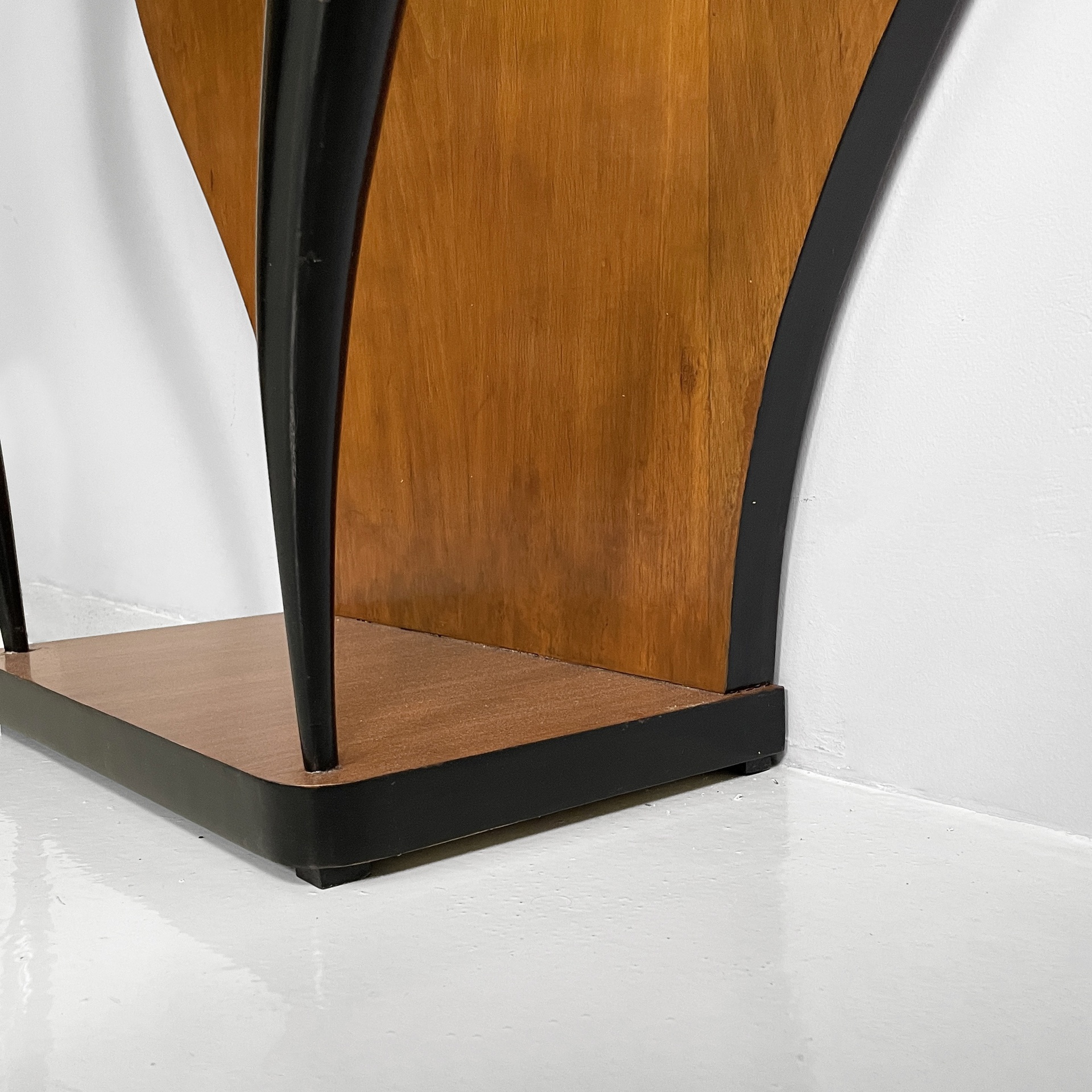 Consolle da parete con piano rettangolare ad angoli arrotondati, in legno. Sul fronte in legno grissinato nero è presente un cassetto in legno rettangolare con maniglie tonde in ottone. La struttura è composta da un lastra in legno sagomata con profili neri, la quale appoggia a parete, e due colonne dalla forma tondeggiante in legno verniciato nero e decori in legno. Base squadrata in legno con profili neri. Art Deco.
