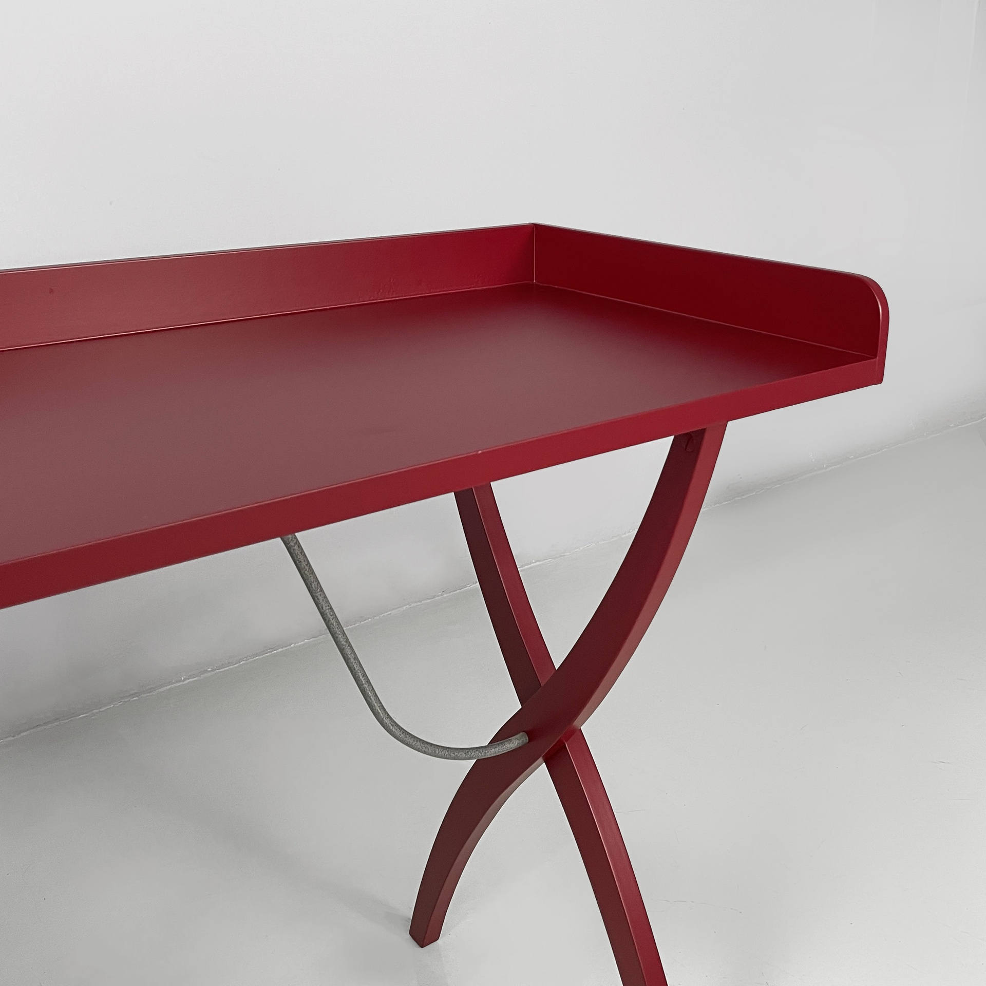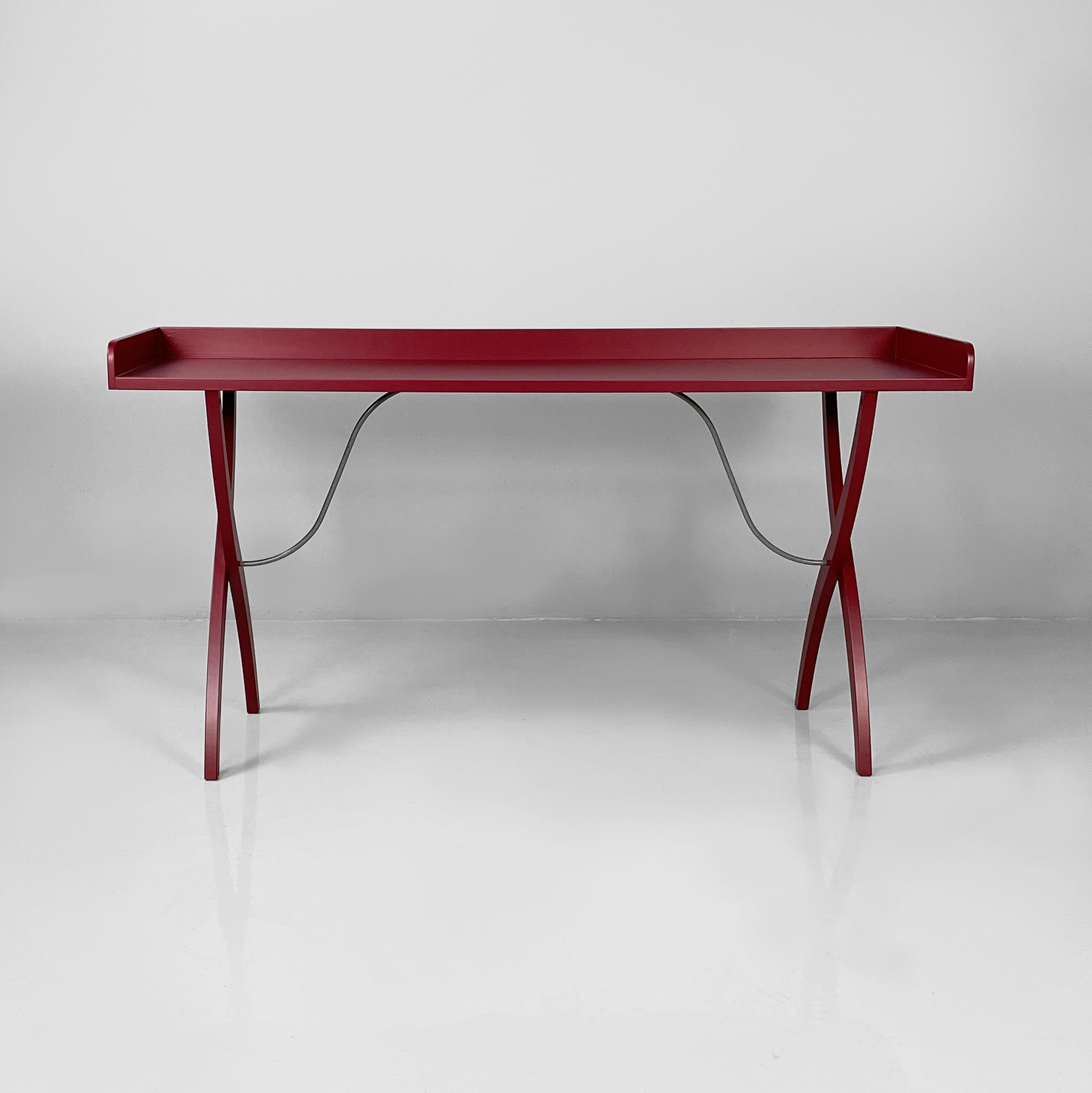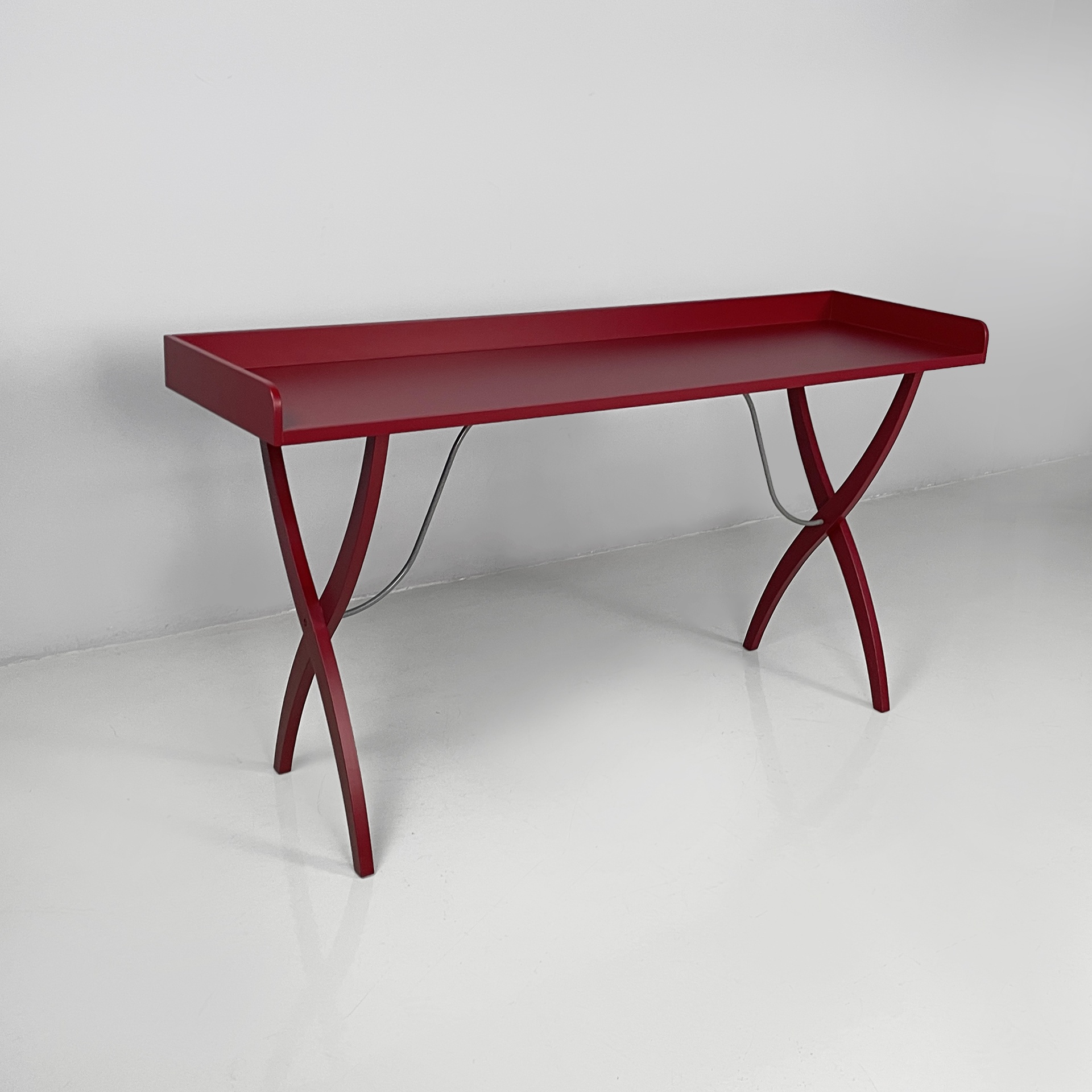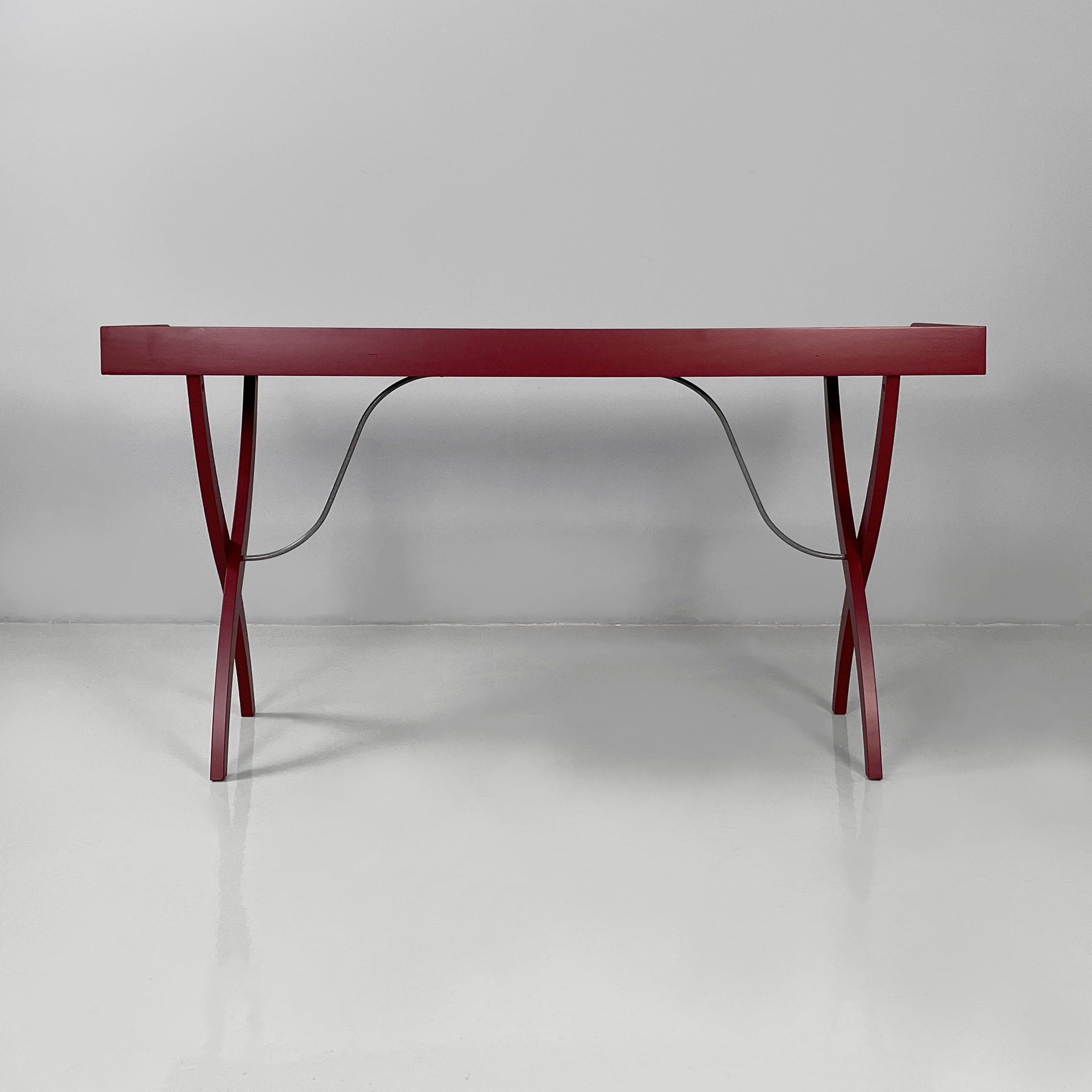 Consolle con piano rettangolare e con bordi rialzati, in legno verniciato bordeaux. Le zampe, anche esse in legno verniciato bordeaux, sono composte da listelli ad X e da due tondini di metallo. Utilizzabile come scrivania o tavolo.