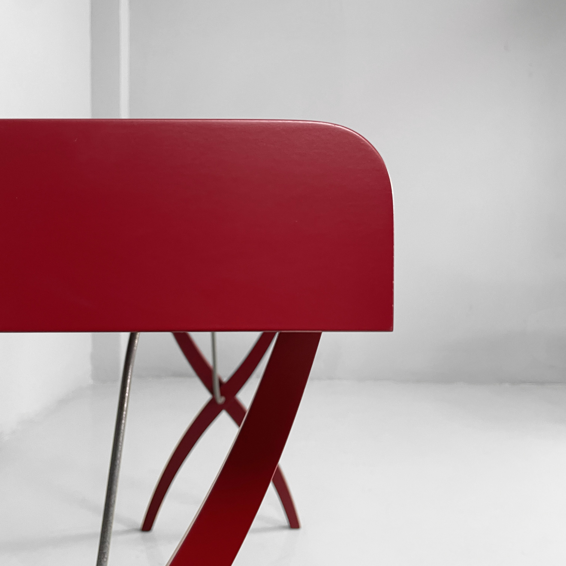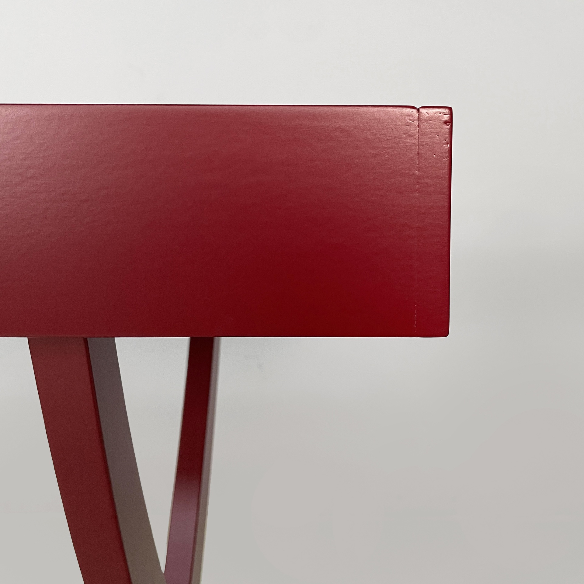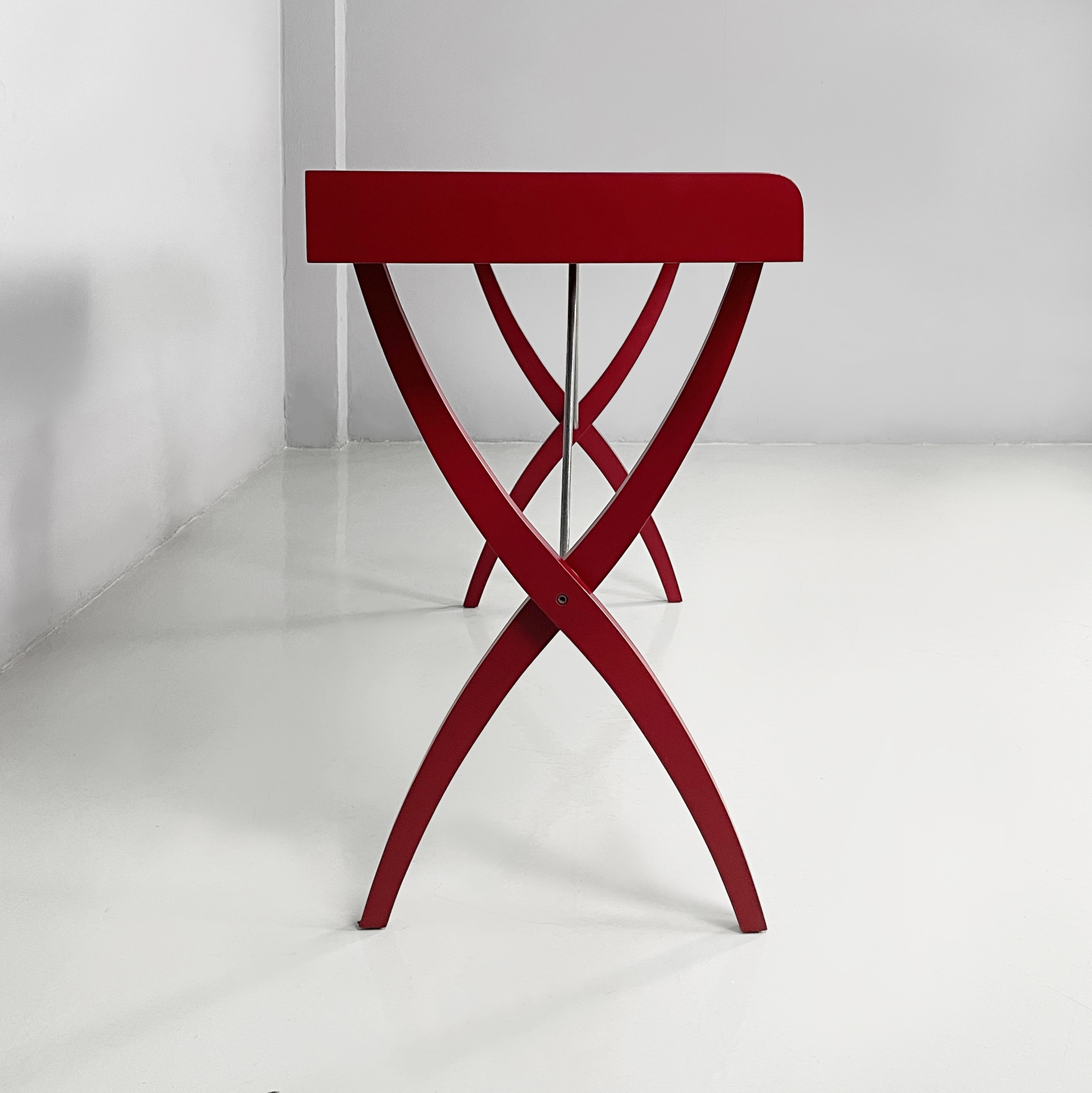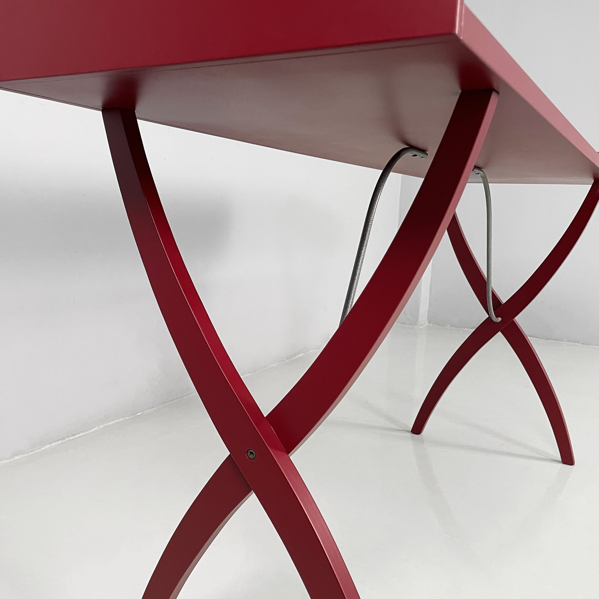Consolle con piano rettangolare e con bordi rialzati, in legno verniciato bordeaux. Le zampe, anche esse in legno verniciato bordeaux, sono composte da listelli ad X e da due tondini di metallo. Utilizzabile come scrivania o tavolo.