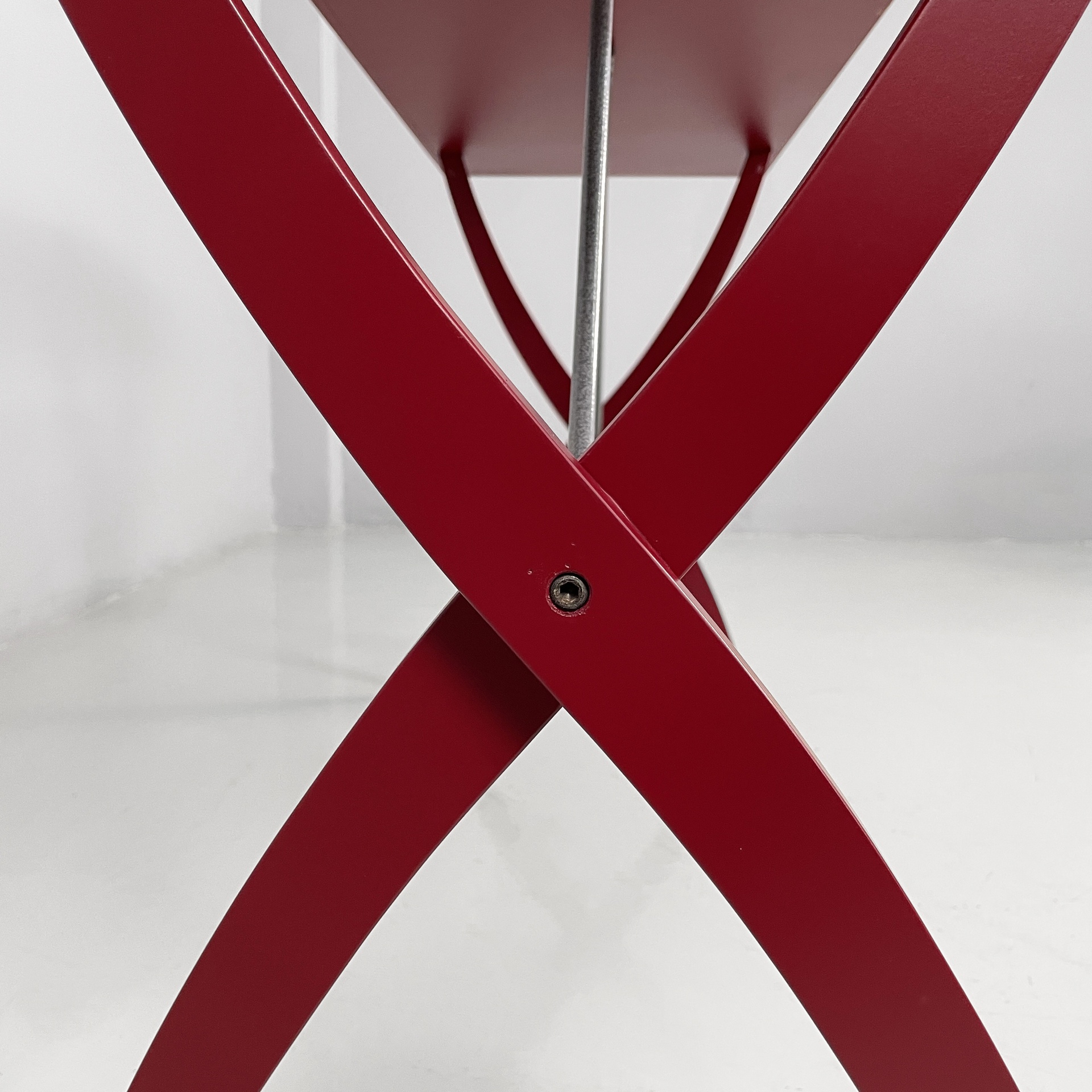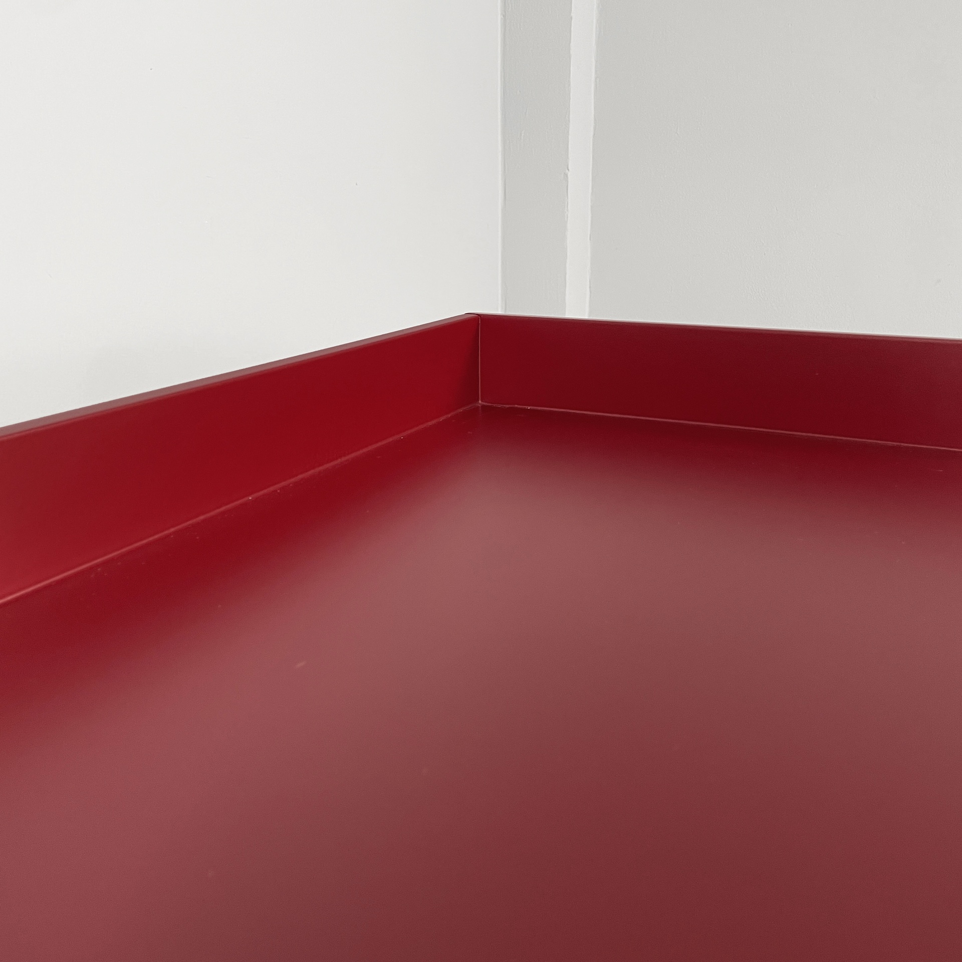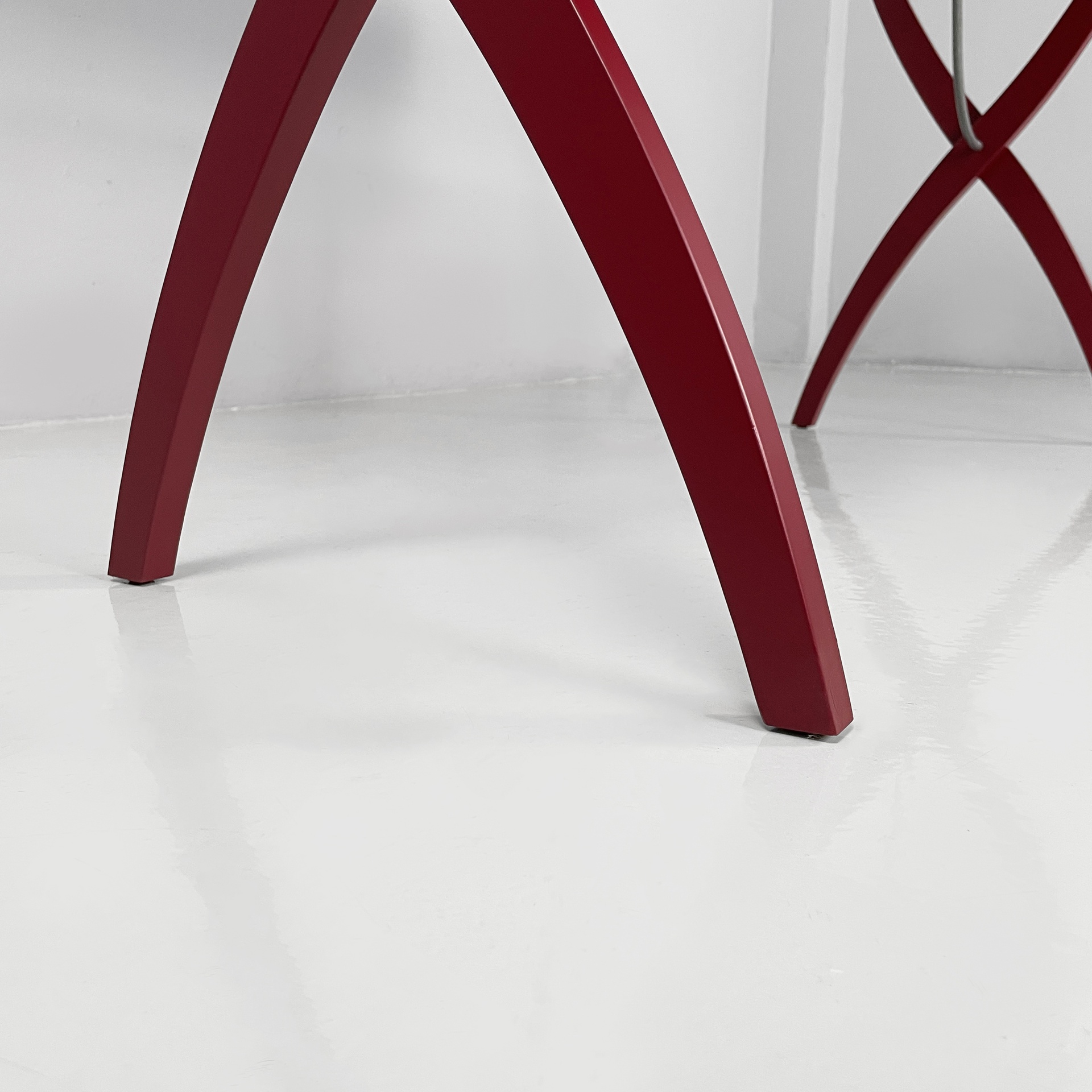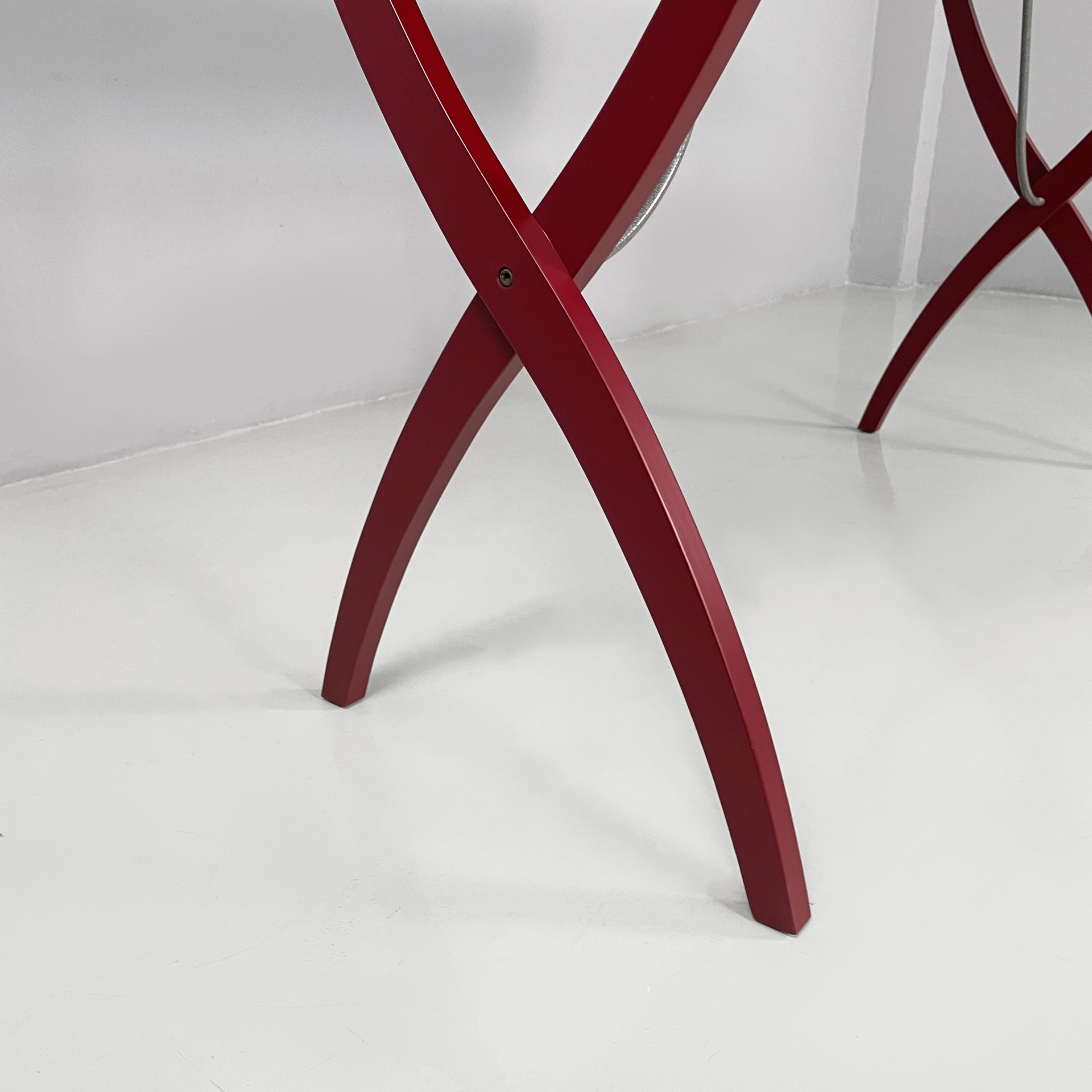 Consolle con piano rettangolare e con bordi rialzati, in legno verniciato bordeaux. Le zampe, anche esse in legno verniciato bordeaux, sono composte da listelli ad X e da due tondini di metallo. Utilizzabile come scrivania o tavolo.