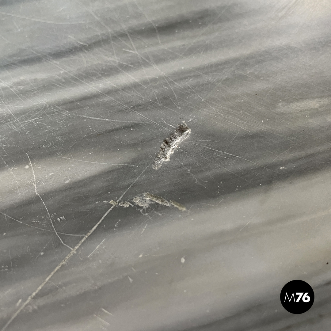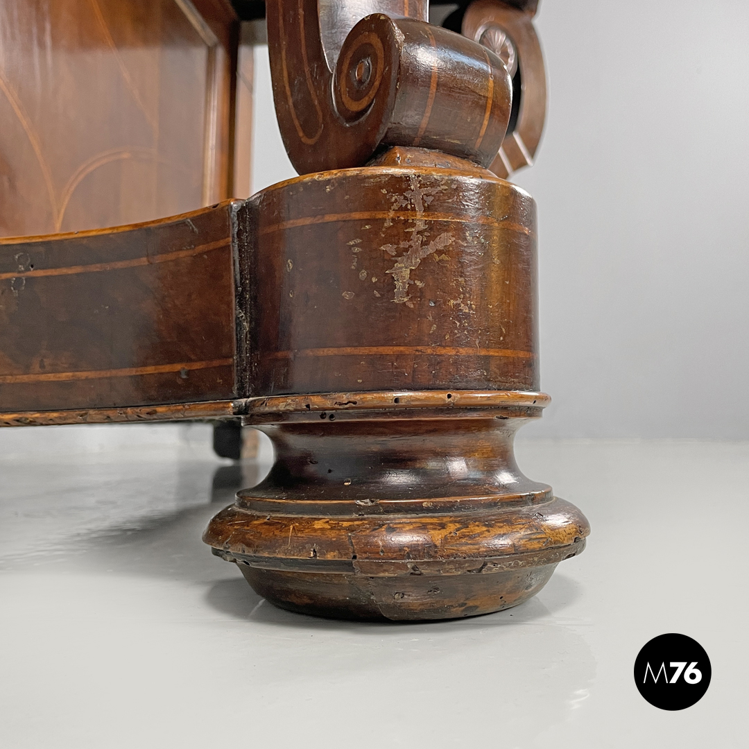 Consolle da parete con due cassetti. Il piano rettangolare è in marmo bianco con venature grigio sotto si trovano i due cassetti decorati a intarsio con delle forme circolari. La parte posteriore è piatta con intarsio decorativo a forma romboidale le due gambe davanti seguono linee sinuose e curve e sono riccamente decorate e intagliate. L’appoggio a terra è dato da un pannello con profili stondati e due piedini frontali tondeggianti e due posteriori rettangolari.