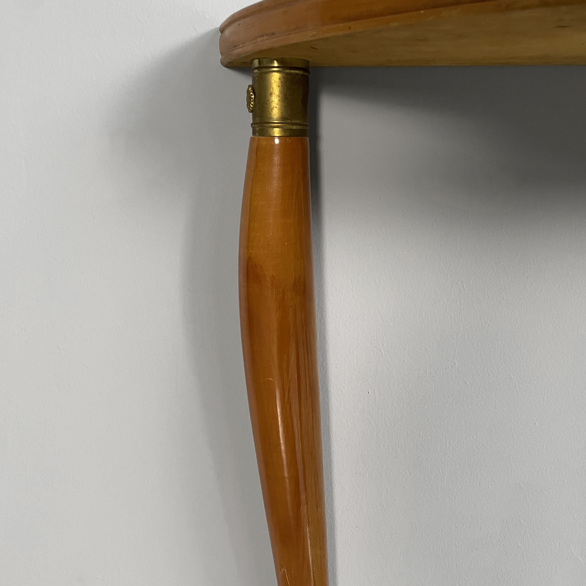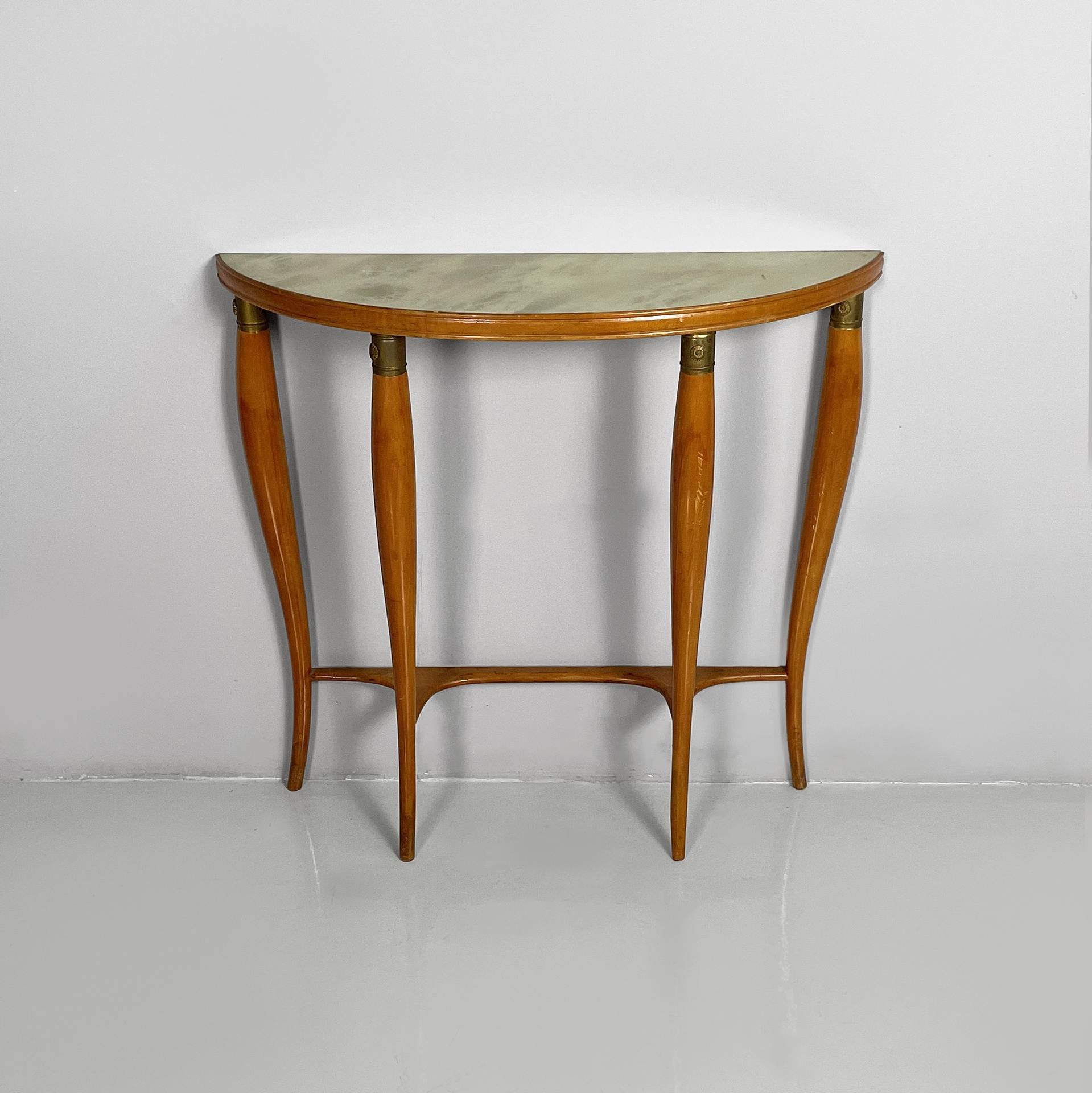 Consolle da parete con piano a mezzaluna in vetro retro-dipinto verde effetto marmo. La struttura e le quattro zampe curvate sono in legno. Sotto il piano Sono presenti dei dettagli in ottone con fiore decorativo.