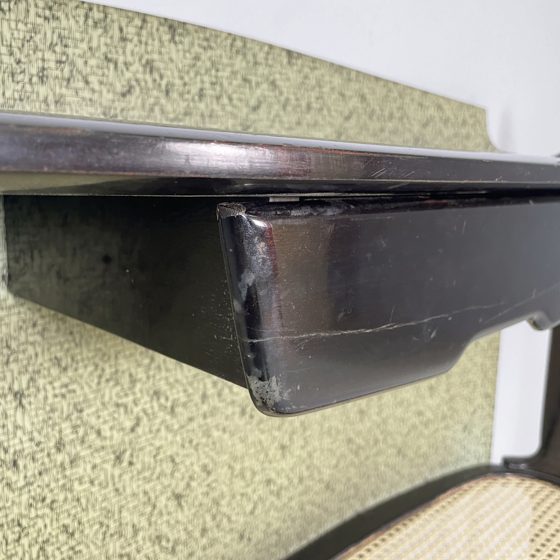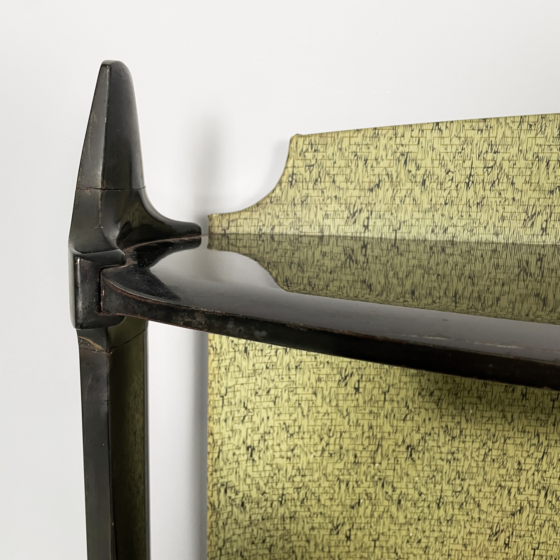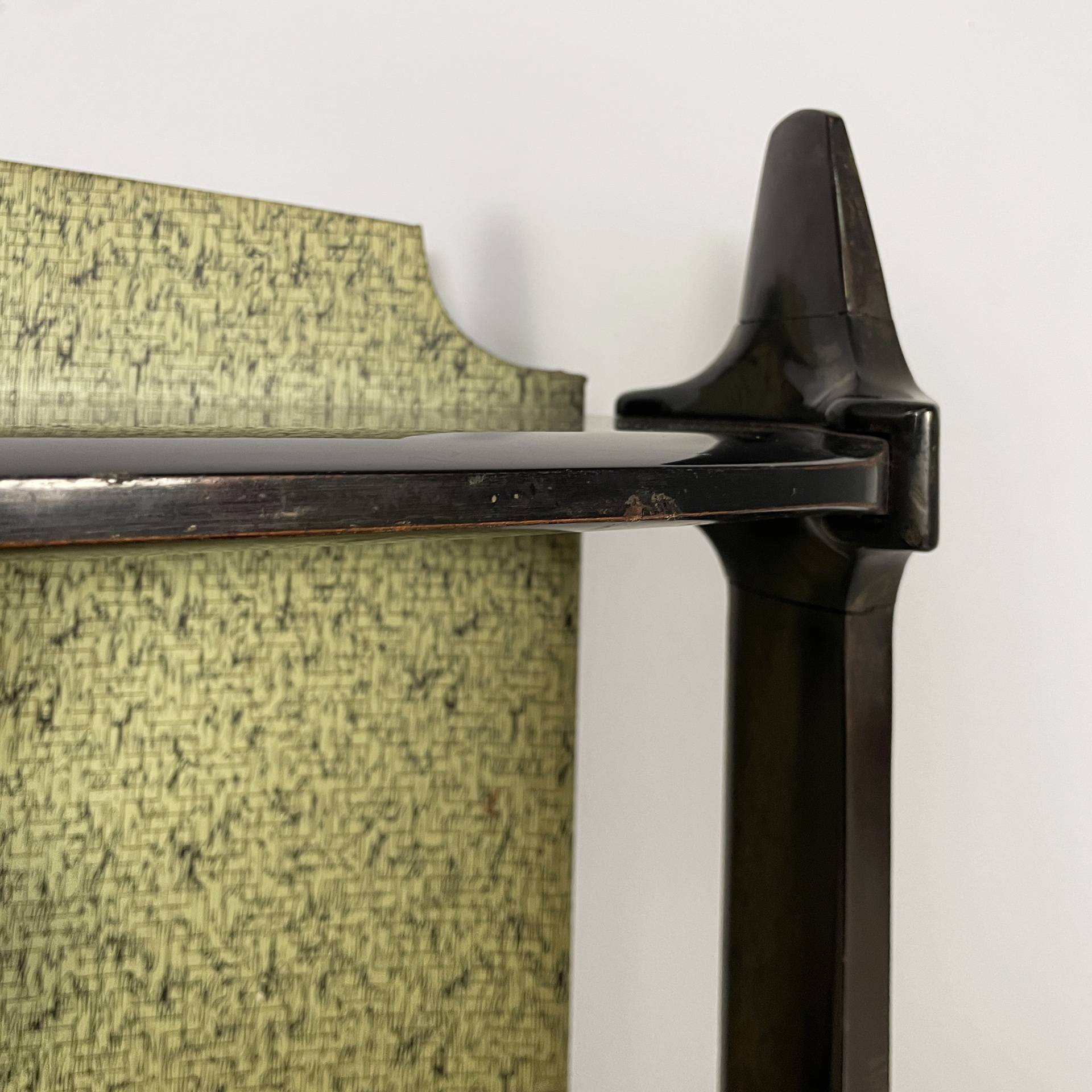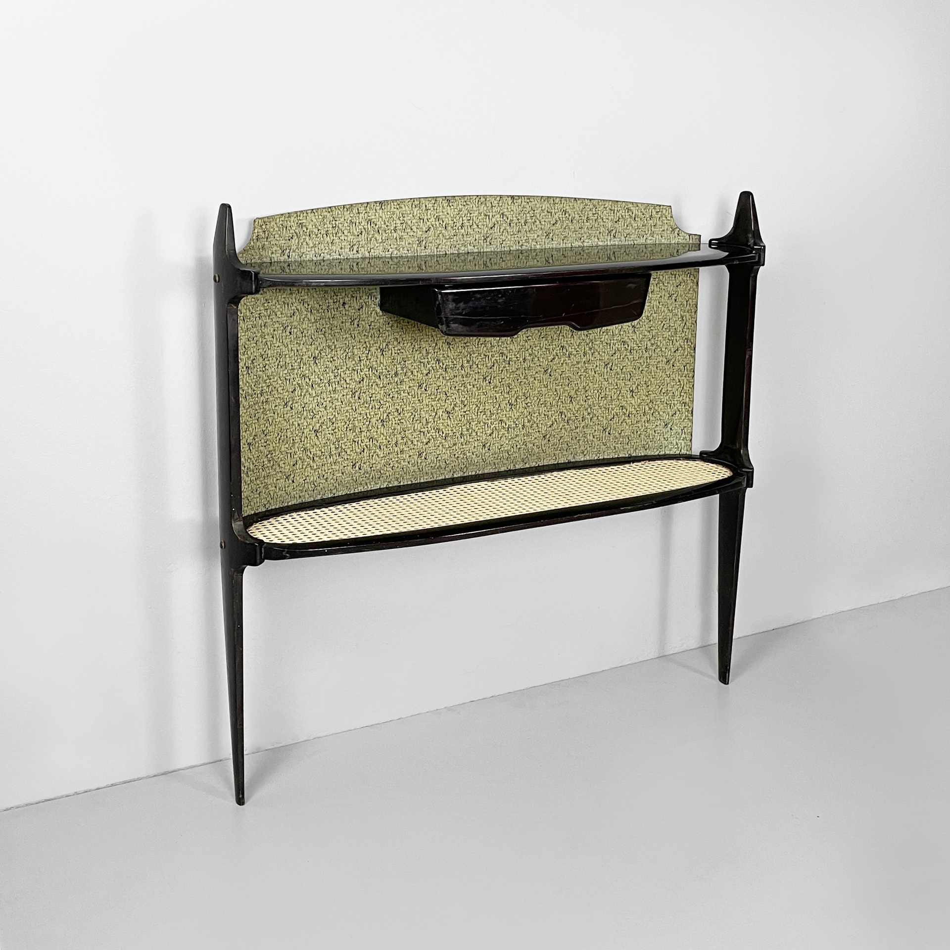 Consolle da parete con doppio ripiano ovale: uno in legno scuro con finitura lucida e uno in paglia con profilo in legno scuro con finitura lucida. Il ripiano superiore presenta un cassetto in legno scuro, anche esso con finitura lucida. L’attacco a parete curvato è in legno rivestito in tessuto verde chiaro con fantasia. Le zampe a listelli sono anche esse in legno scuro con finitura lucida.