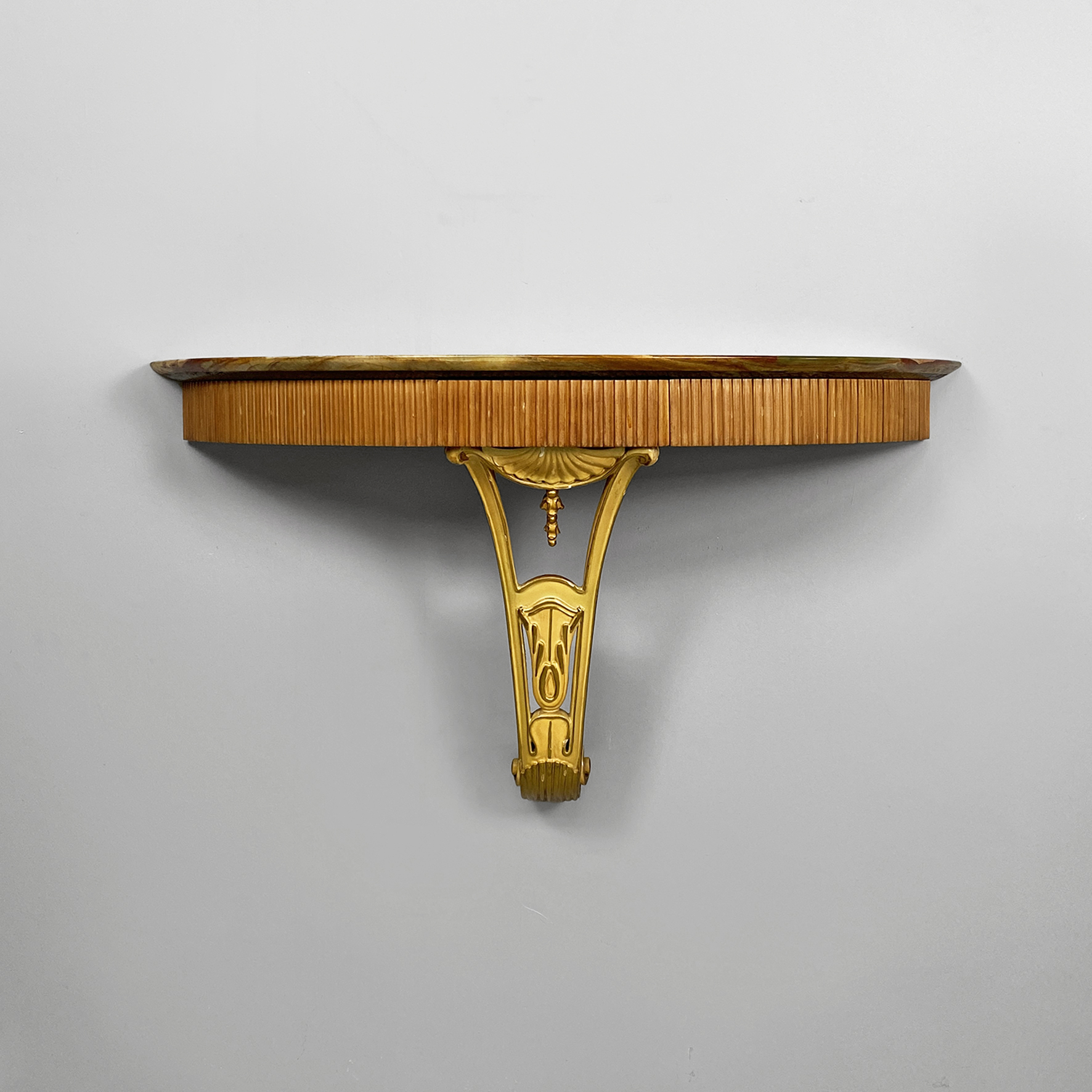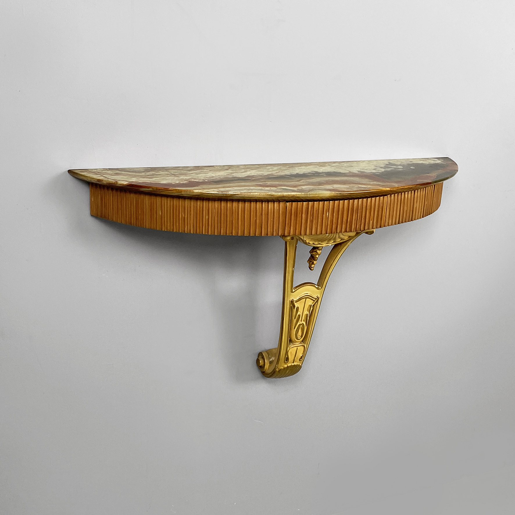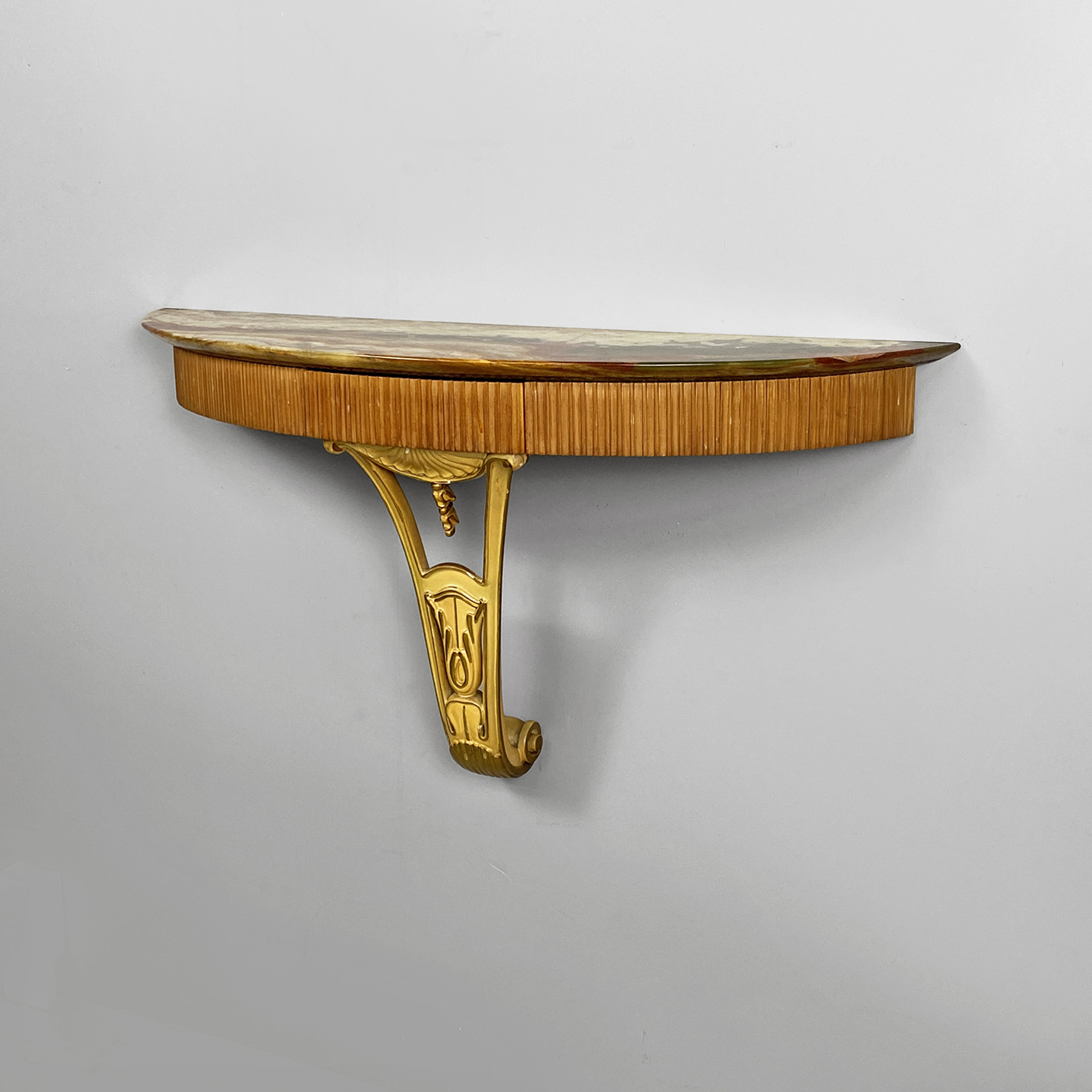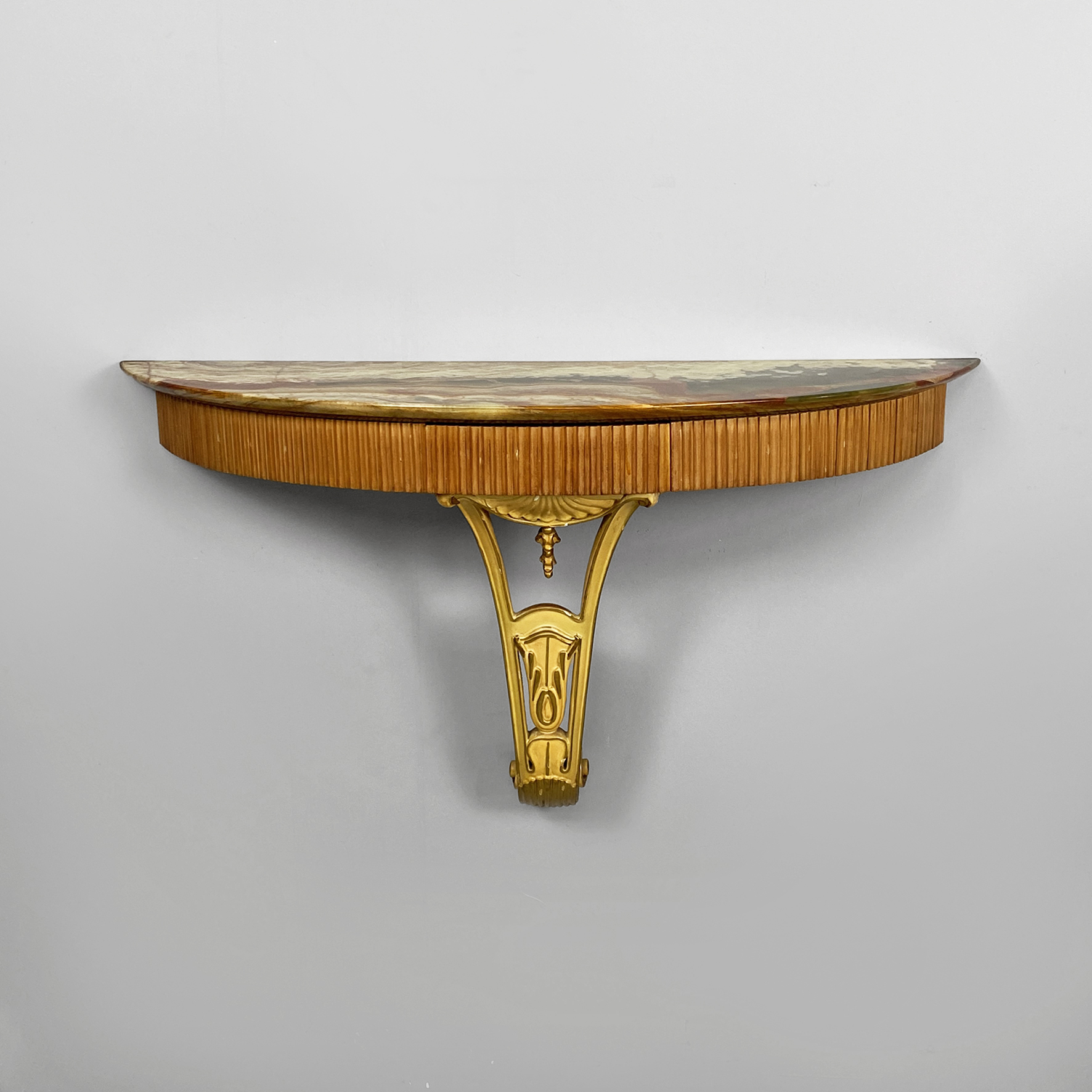 Consolle da parete in stile veneziano, con piano in marmo onice e struttura in legno con cassetto centrale. Profilo interamente grissinato e colonna centrale terminante “a ricciolo” con decori dorati. Piano in onice con forma semiellittica. Struttura predisposta di tre fori per poter essere sospesa a parete, di cui due presenti appena sotto il piano in marmo, sul retro, ed un terzo foro presente sul retro del ricciolo posto sulla zampa centrale, che permette di scaricare il peso dello stesso piano in marmo in modo omogeneo.