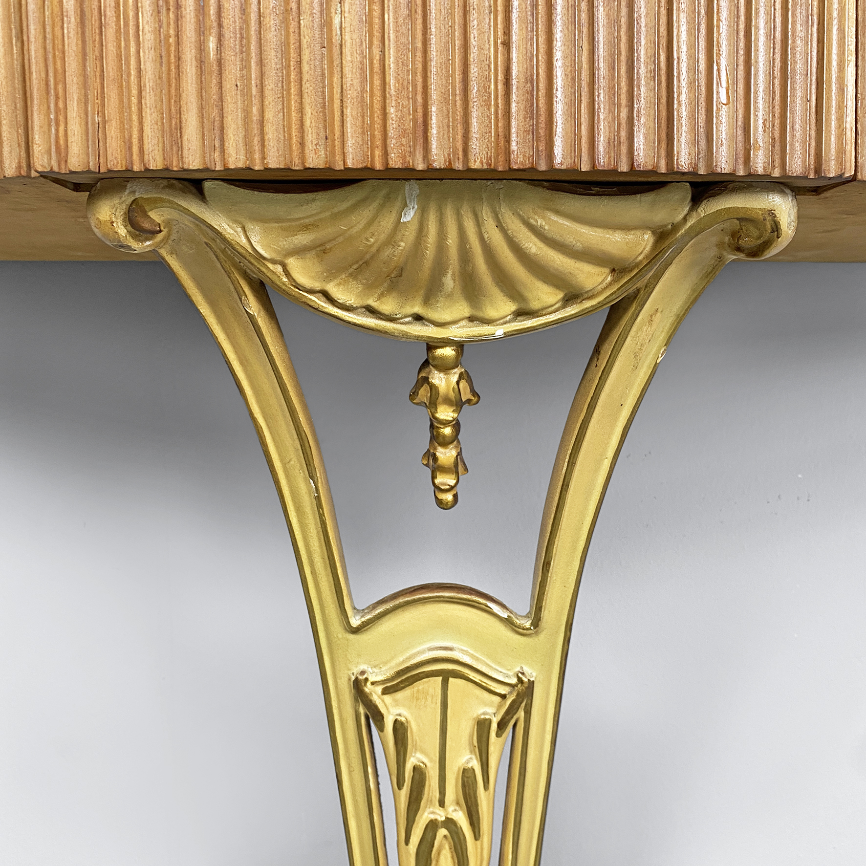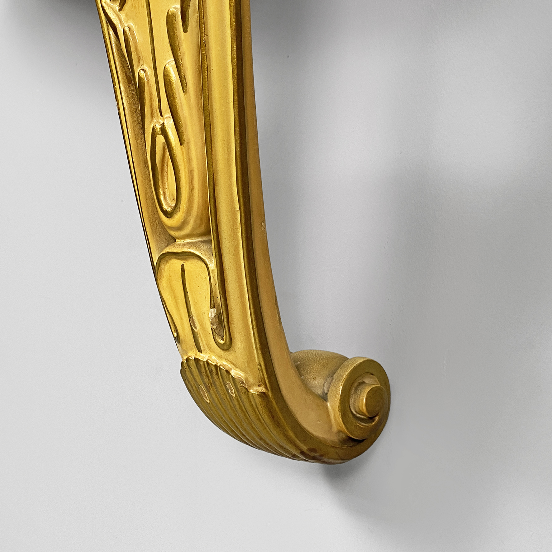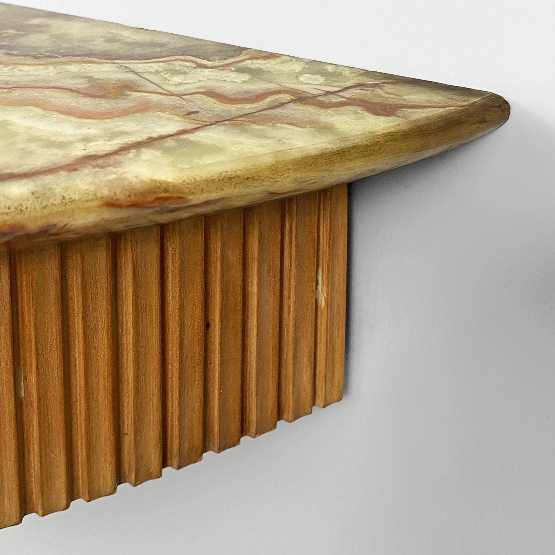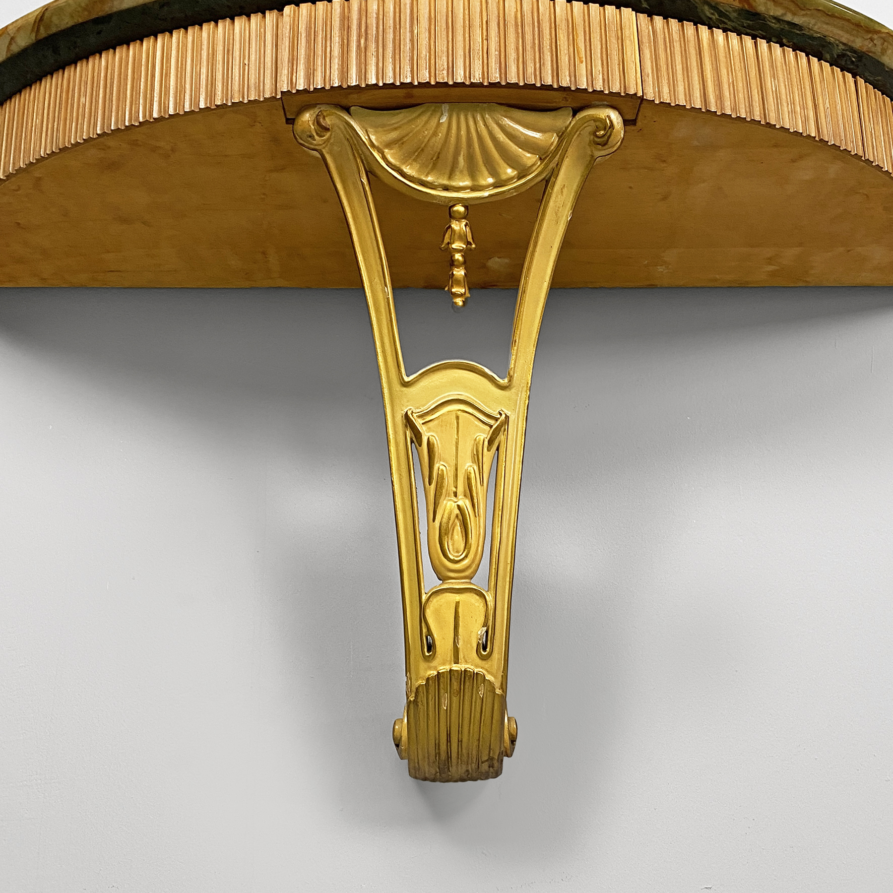 Consolle da parete in stile veneziano, con piano in marmo onice e struttura in legno con cassetto centrale. Profilo interamente grissinato e colonna centrale terminante “a ricciolo” con decori dorati. Piano in onice con forma semiellittica. Struttura predisposta di tre fori per poter essere sospesa a parete, di cui due presenti appena sotto il piano in marmo, sul retro, ed un terzo foro presente sul retro del ricciolo posto sulla zampa centrale, che permette di scaricare il peso dello stesso piano in marmo in modo omogeneo.