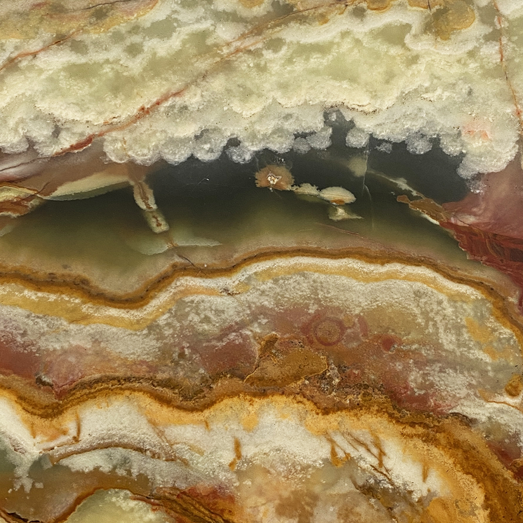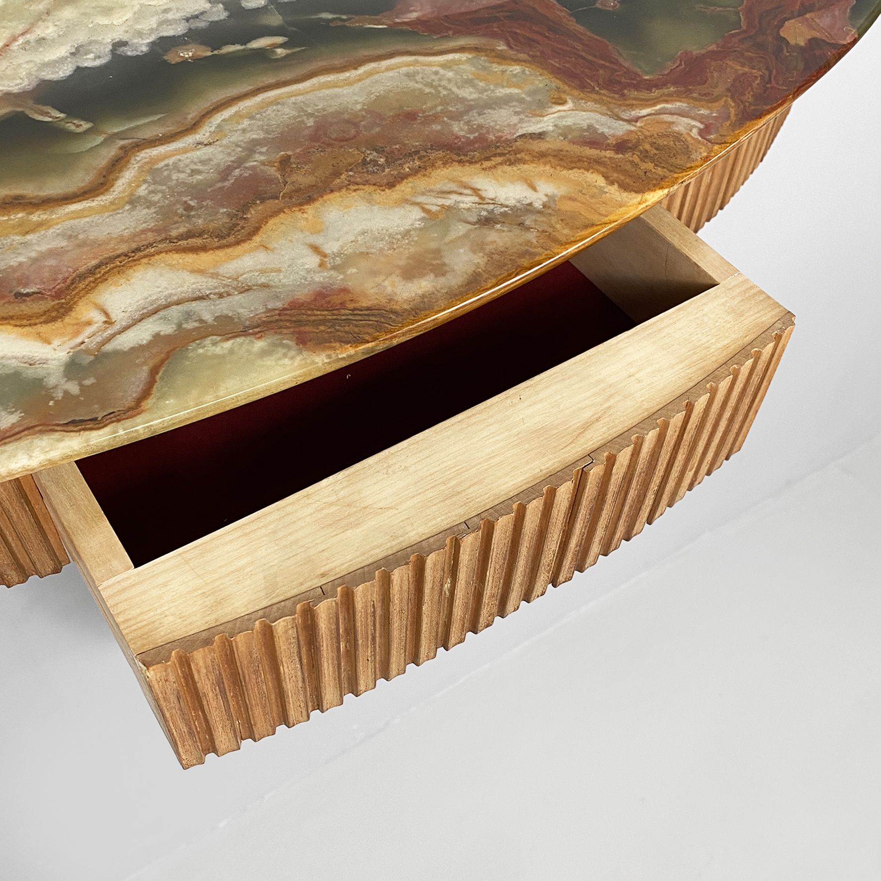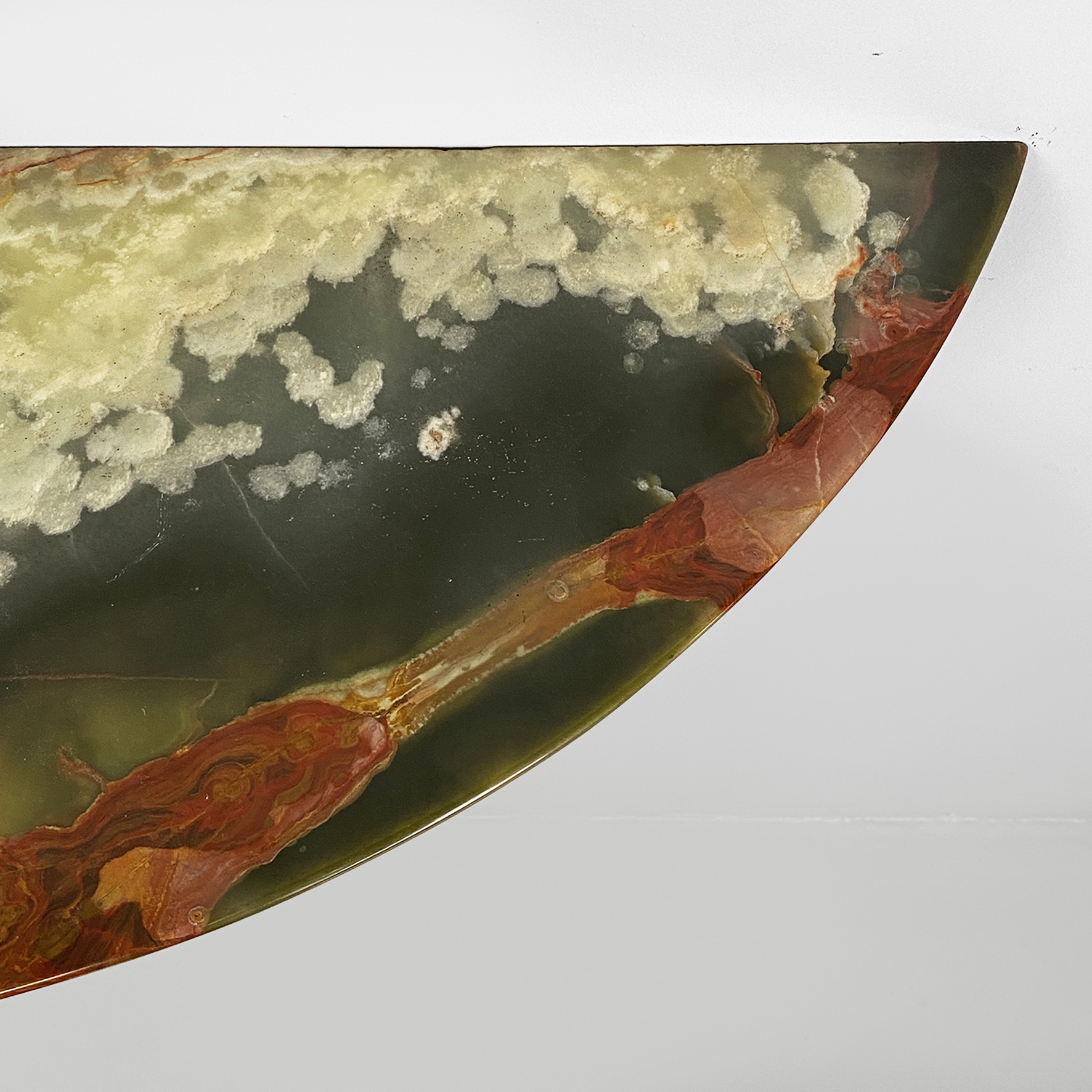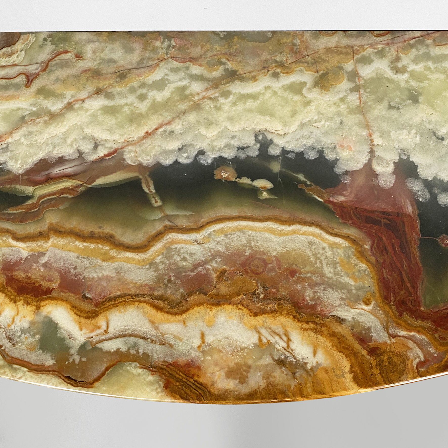 Consolle da parete in stile veneziano, con piano in marmo onice e struttura in legno con cassetto centrale. Profilo interamente grissinato e colonna centrale terminante “a ricciolo” con decori dorati. Piano in onice con forma semiellittica. Struttura predisposta di tre fori per poter essere sospesa a parete, di cui due presenti appena sotto il piano in marmo, sul retro, ed un terzo foro presente sul retro del ricciolo posto sulla zampa centrale, che permette di scaricare il peso dello stesso piano in marmo in modo omogeneo.