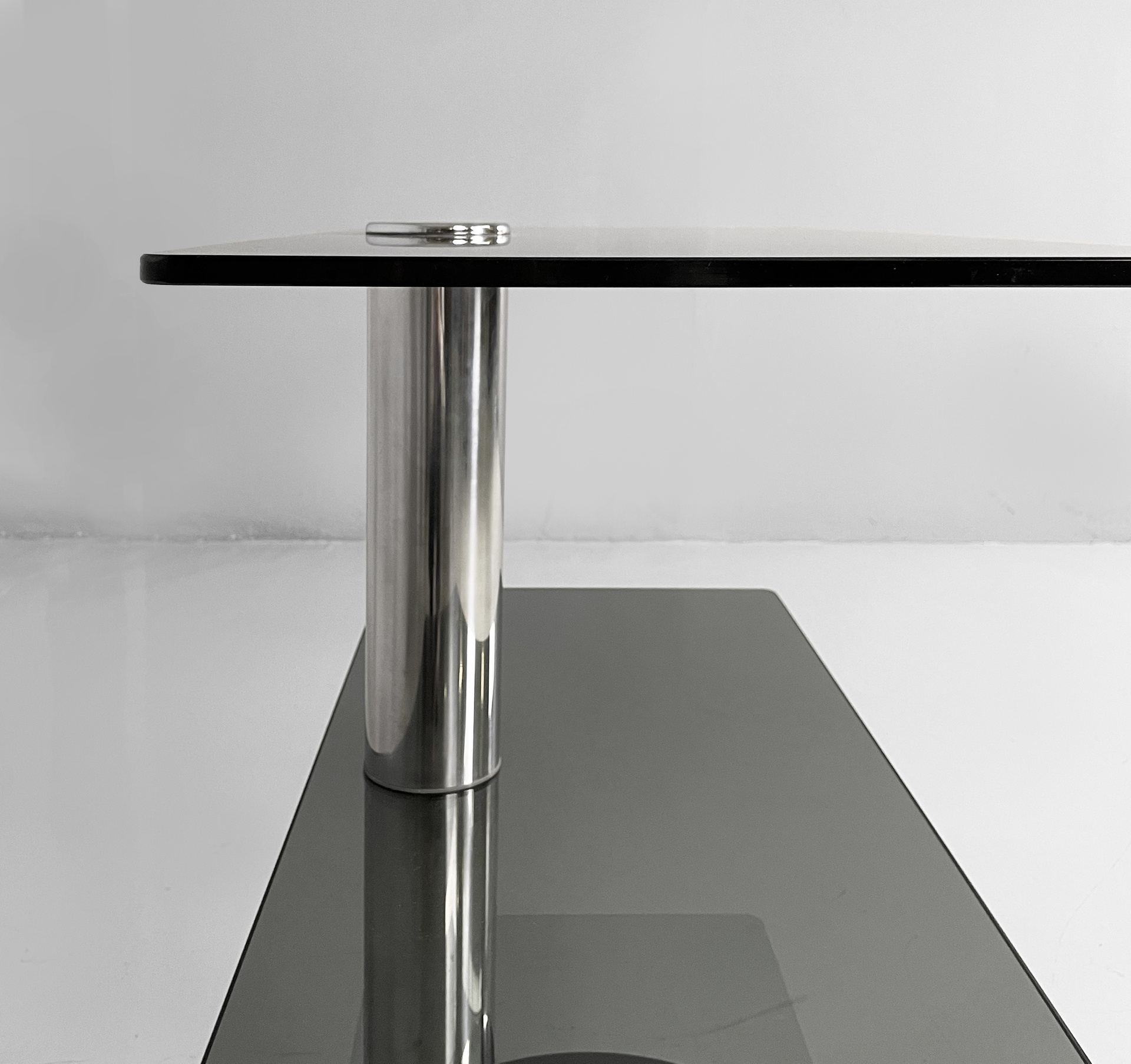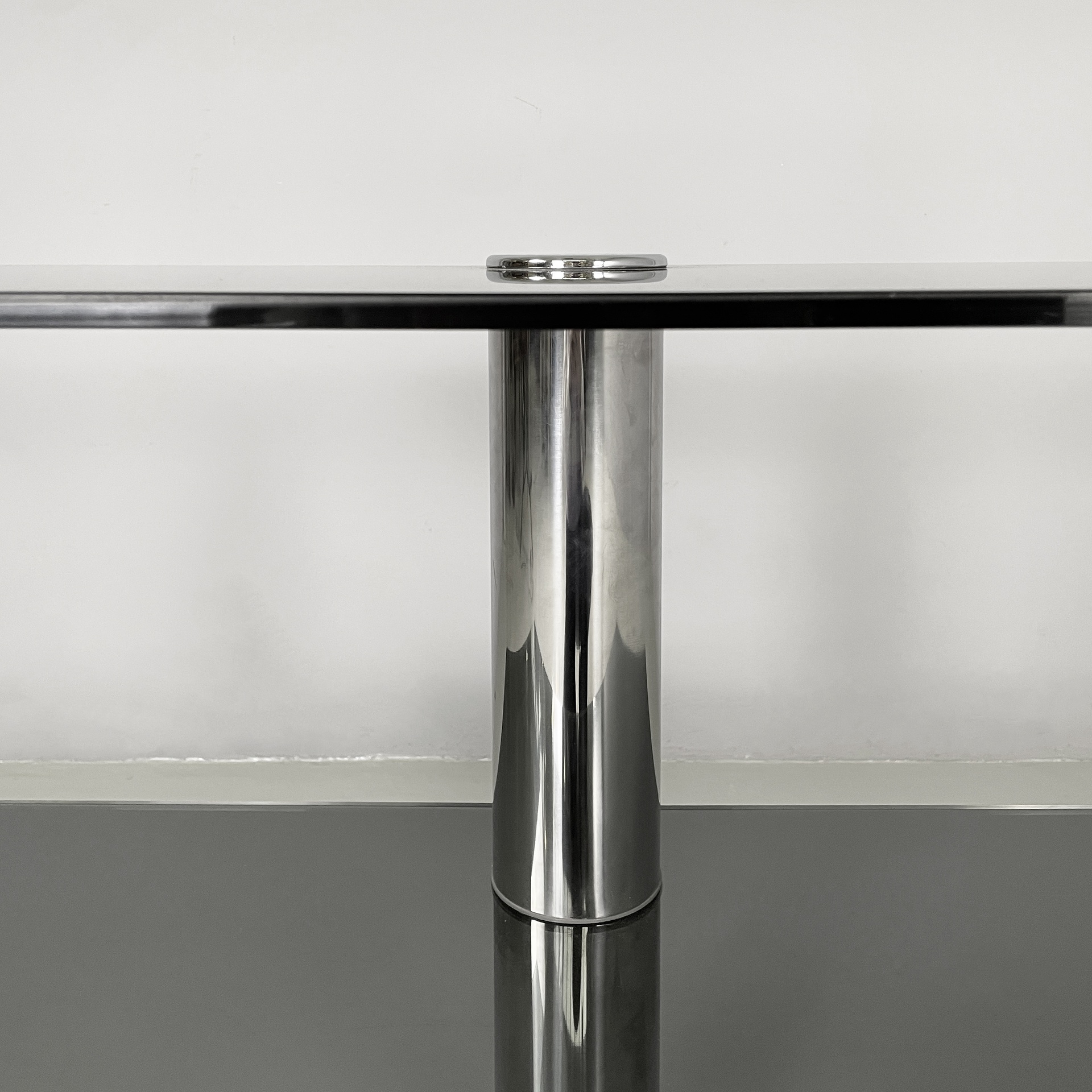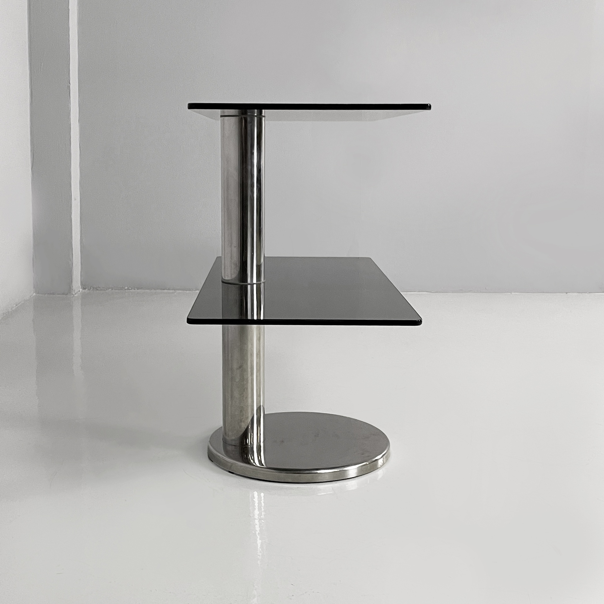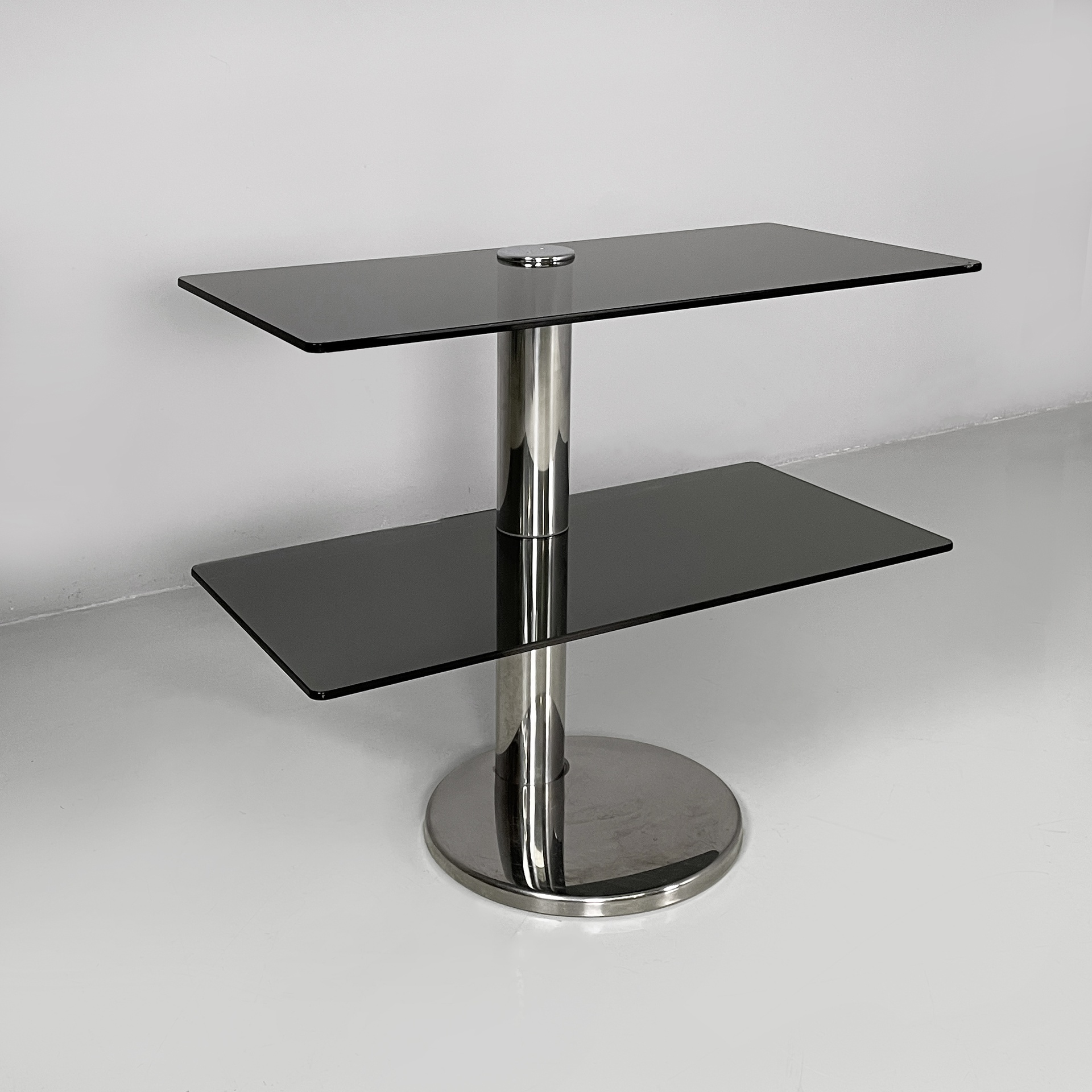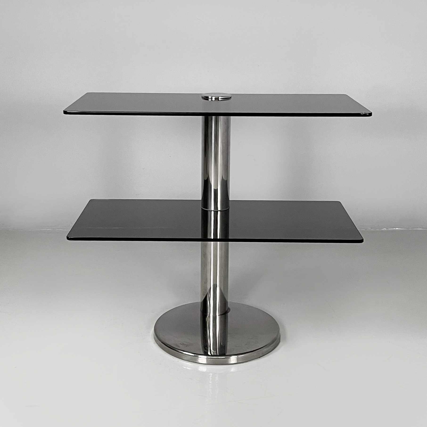 Consolle con doppio ripiano rettangolare ad angoli arrotondati in vetro fumè. La struttura centrale a sezione tonda è in acciaio. Base tonda in acciaio.