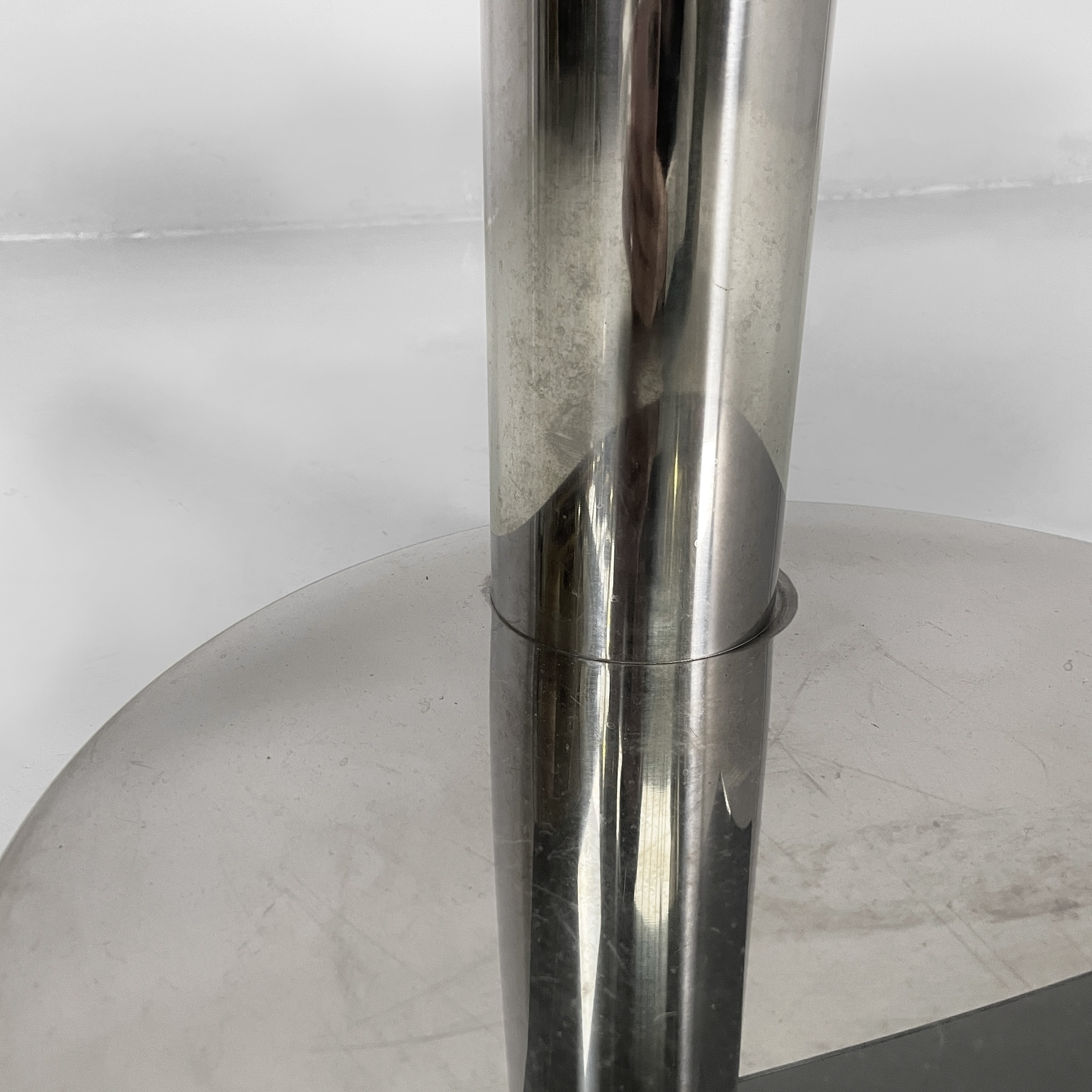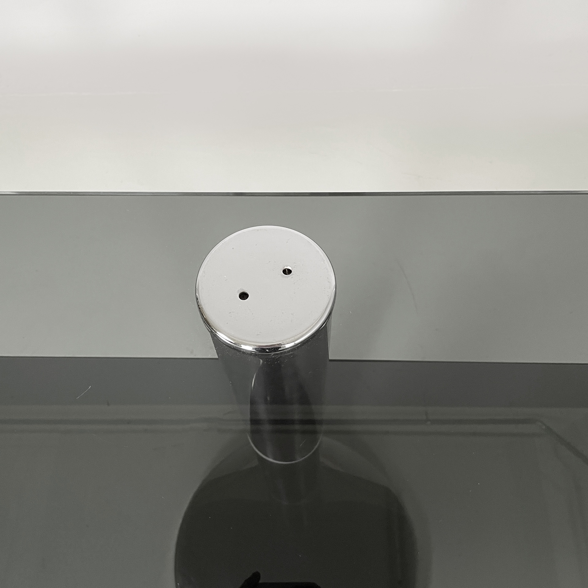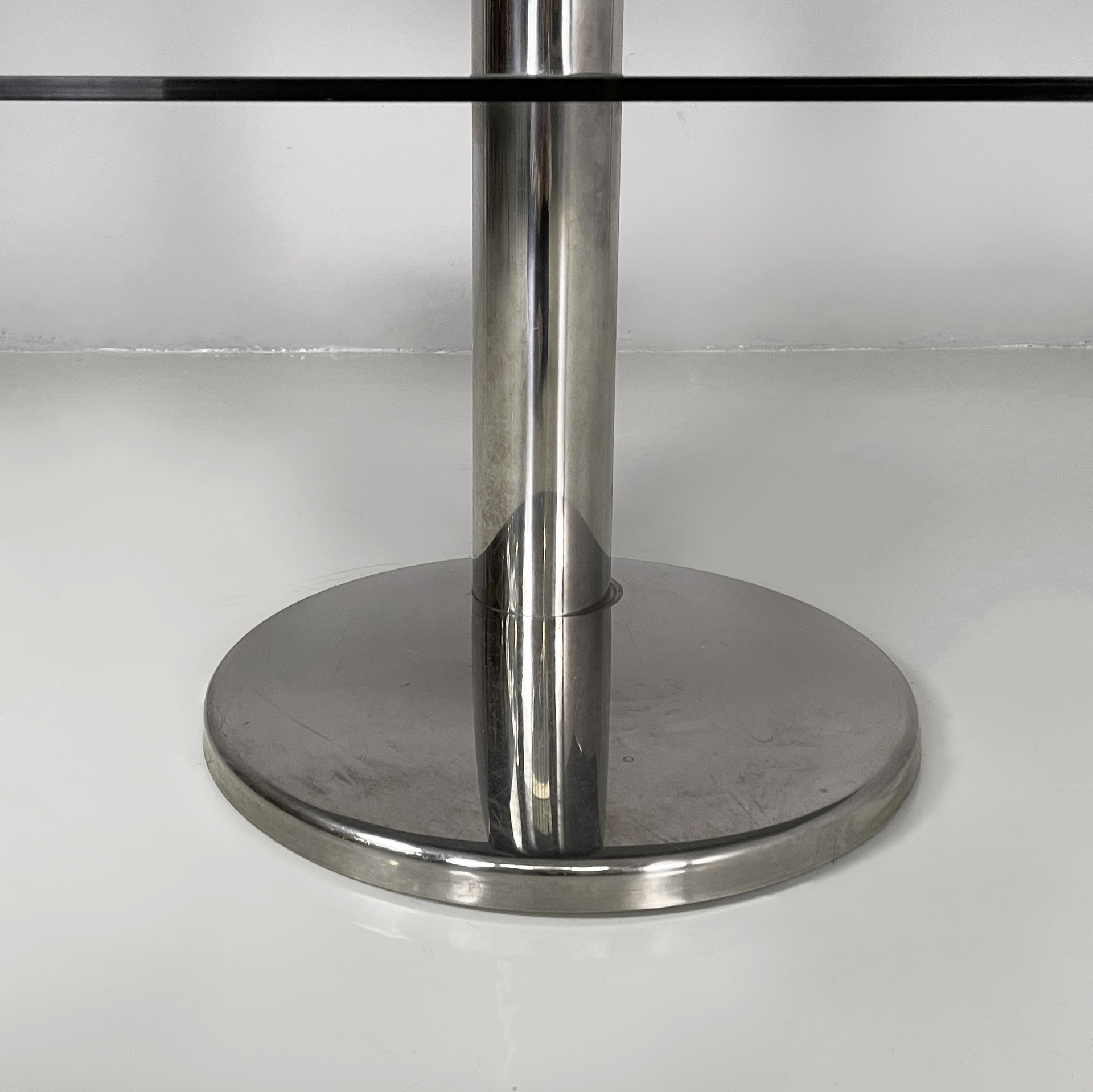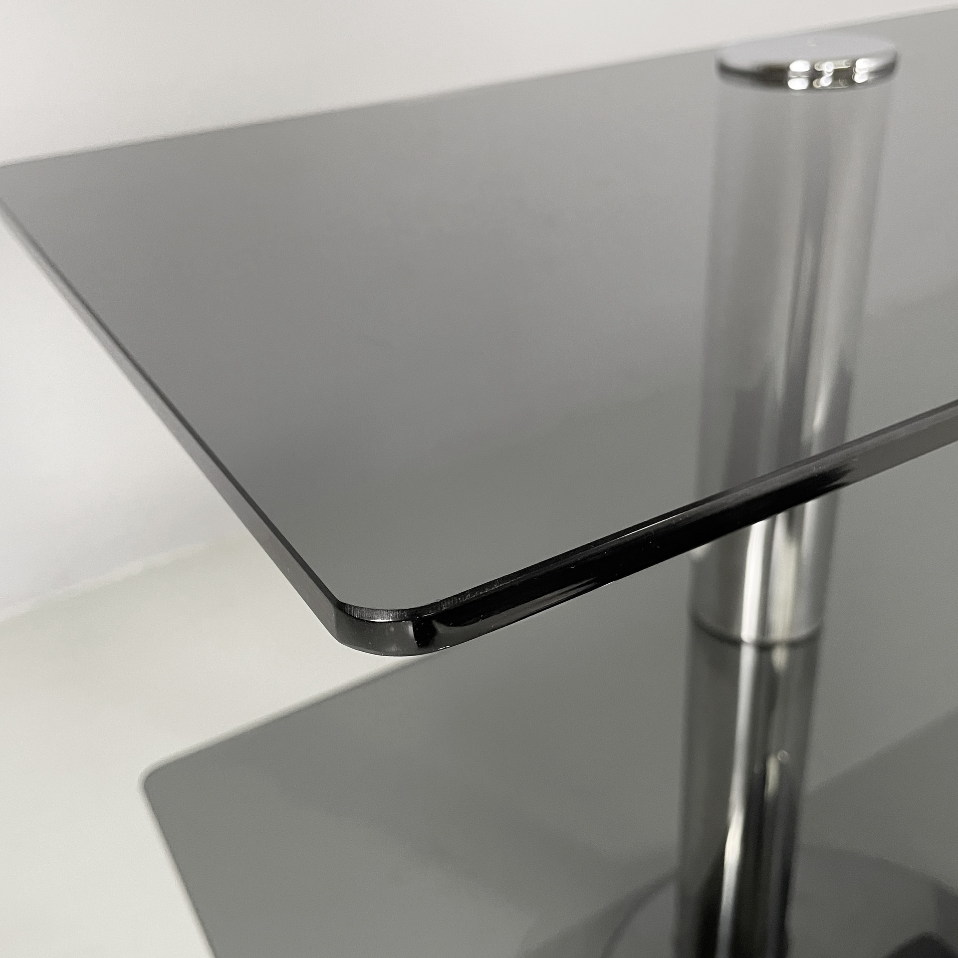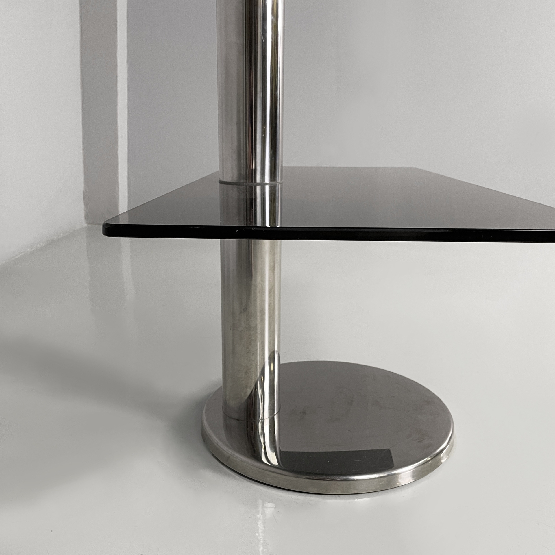 Consolle con doppio ripiano rettangolare ad angoli arrotondati in vetro fumè. La struttura centrale a sezione tonda è in acciaio. Base tonda in acciaio.