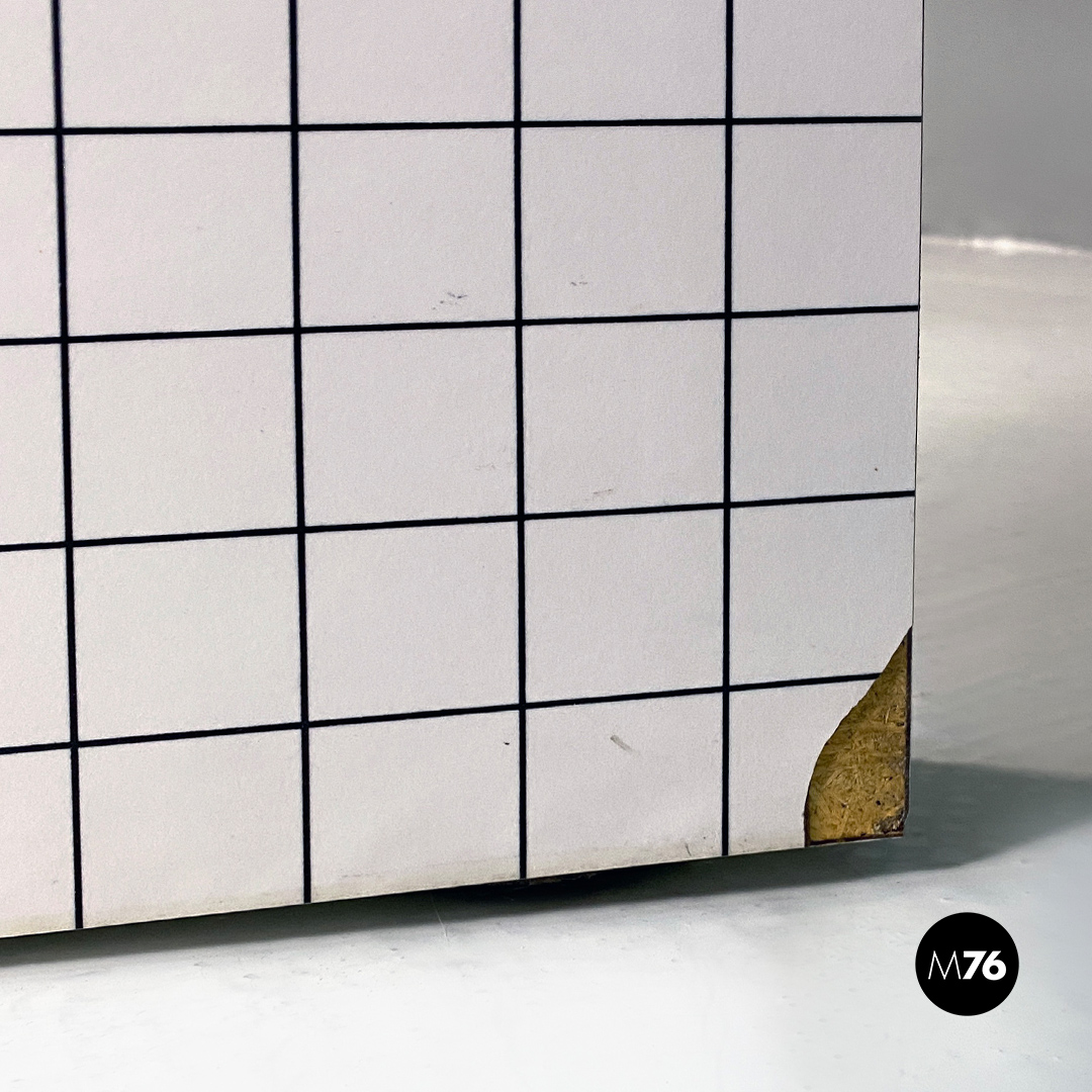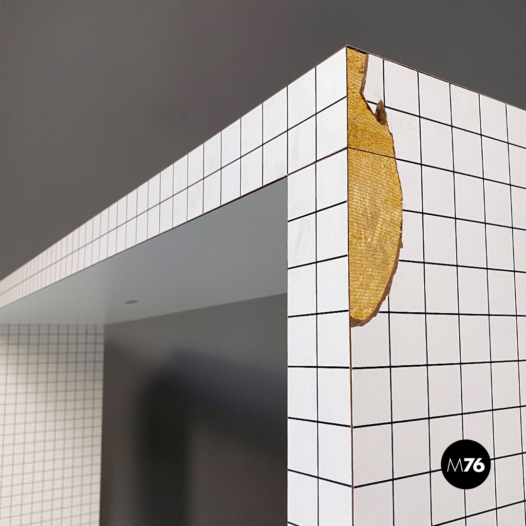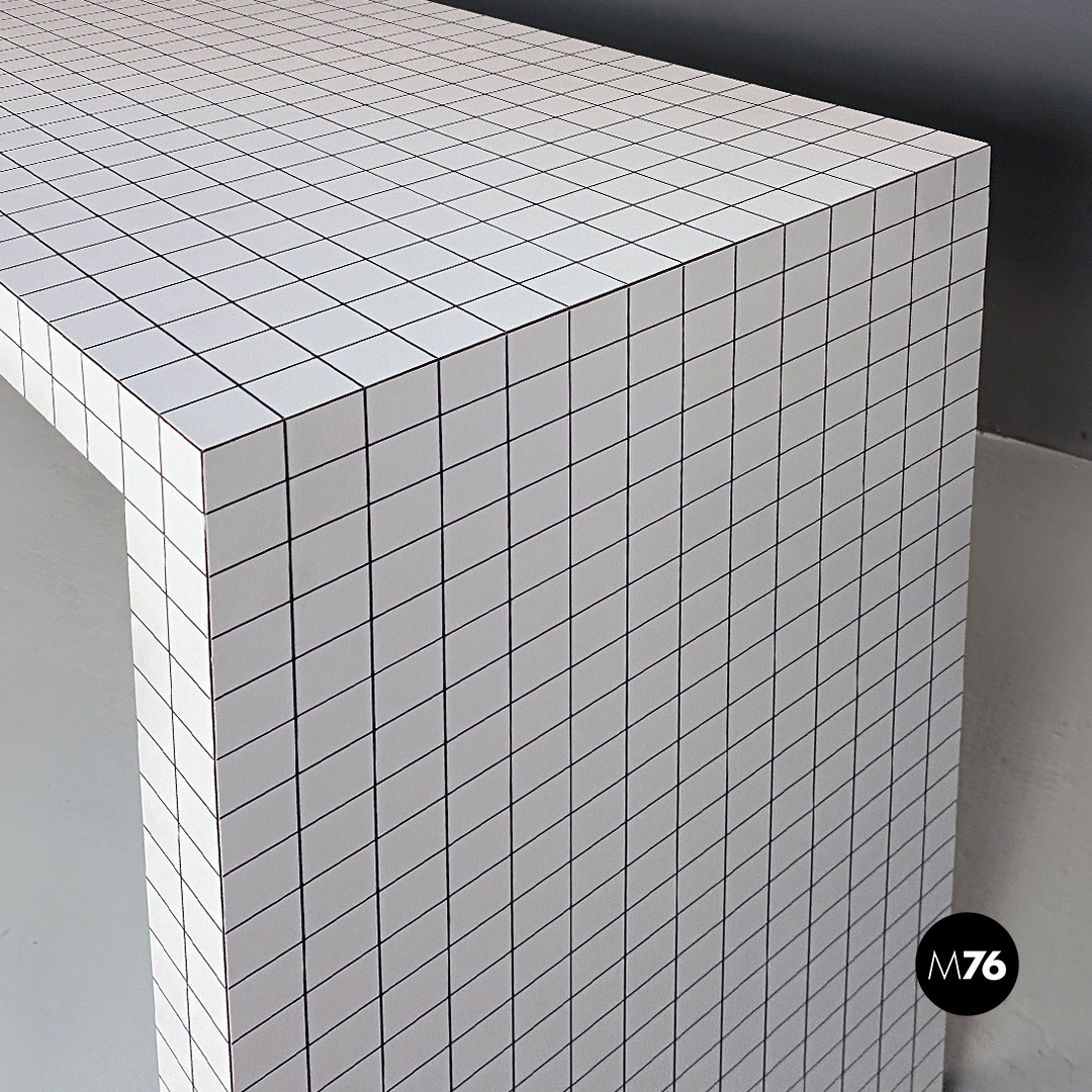 Consolle modello Quaderna con struttura in legno tamburato rivestita da laminato a stampa digitale a quadretti neri.