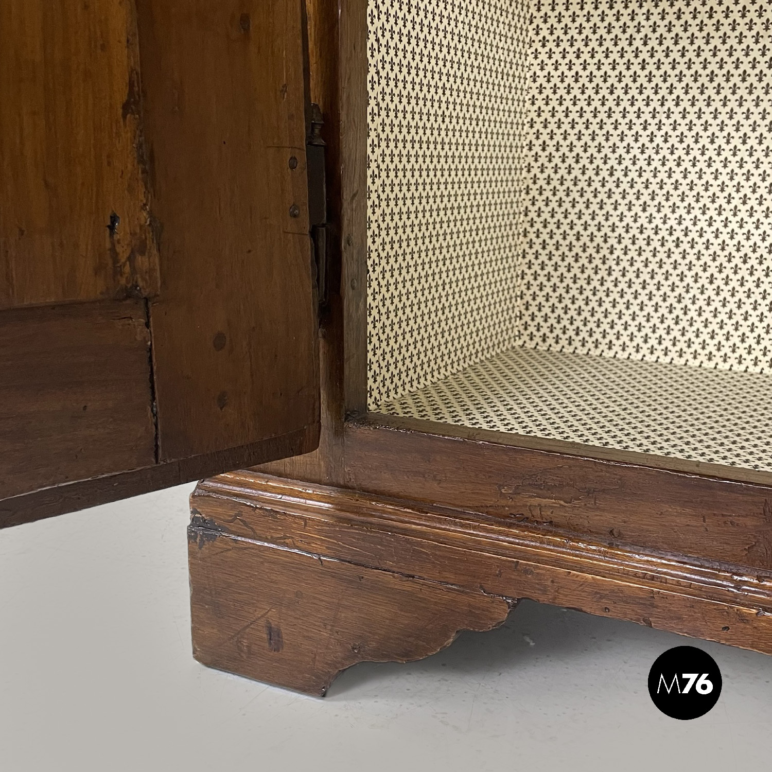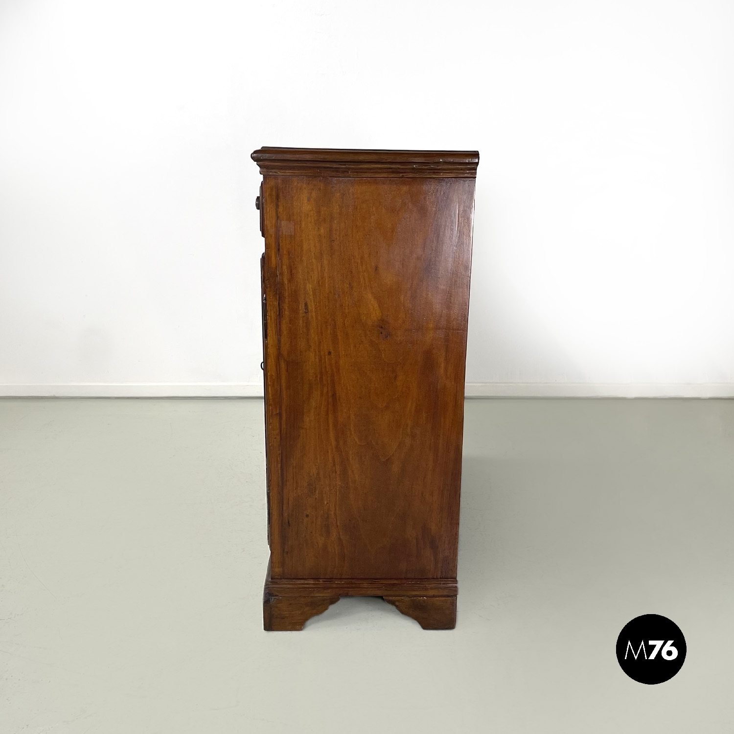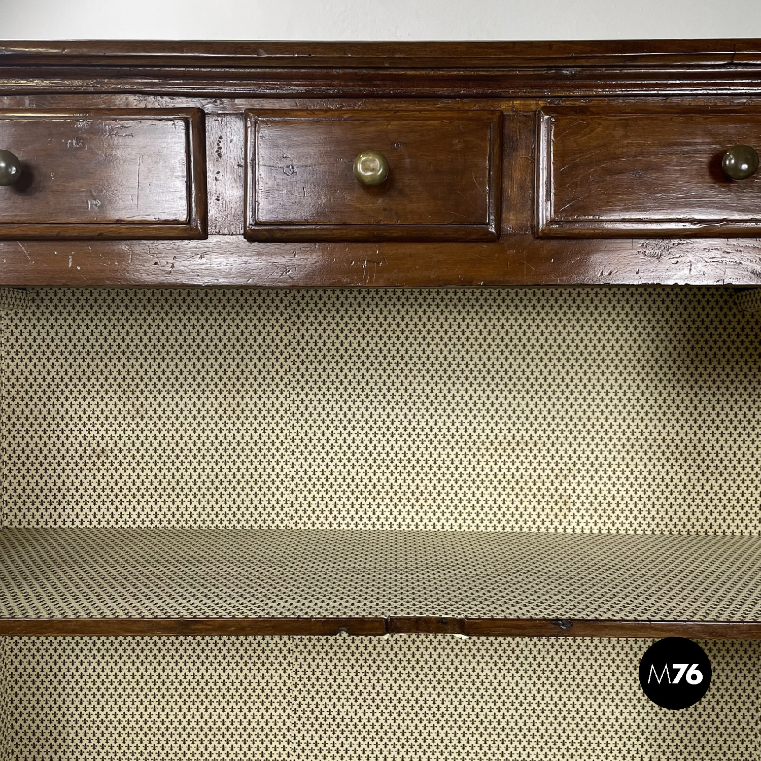 Credenza a base rettangolare interamente in legno. Presenta un piano con i lati del perimetro sagomati sotto si trovano tre cassetti di cui quello centrale più piccolo con pomelli tondi in ottone. Nella parte inferiore presenta due ante una con la serratura e la chiave al cui interno si trovano due piani. L’interno è rivestito con carta da parati con decorazione. I quattro piedini sono sagomati e a sezione quadrata. Utilizzabile come madia.
