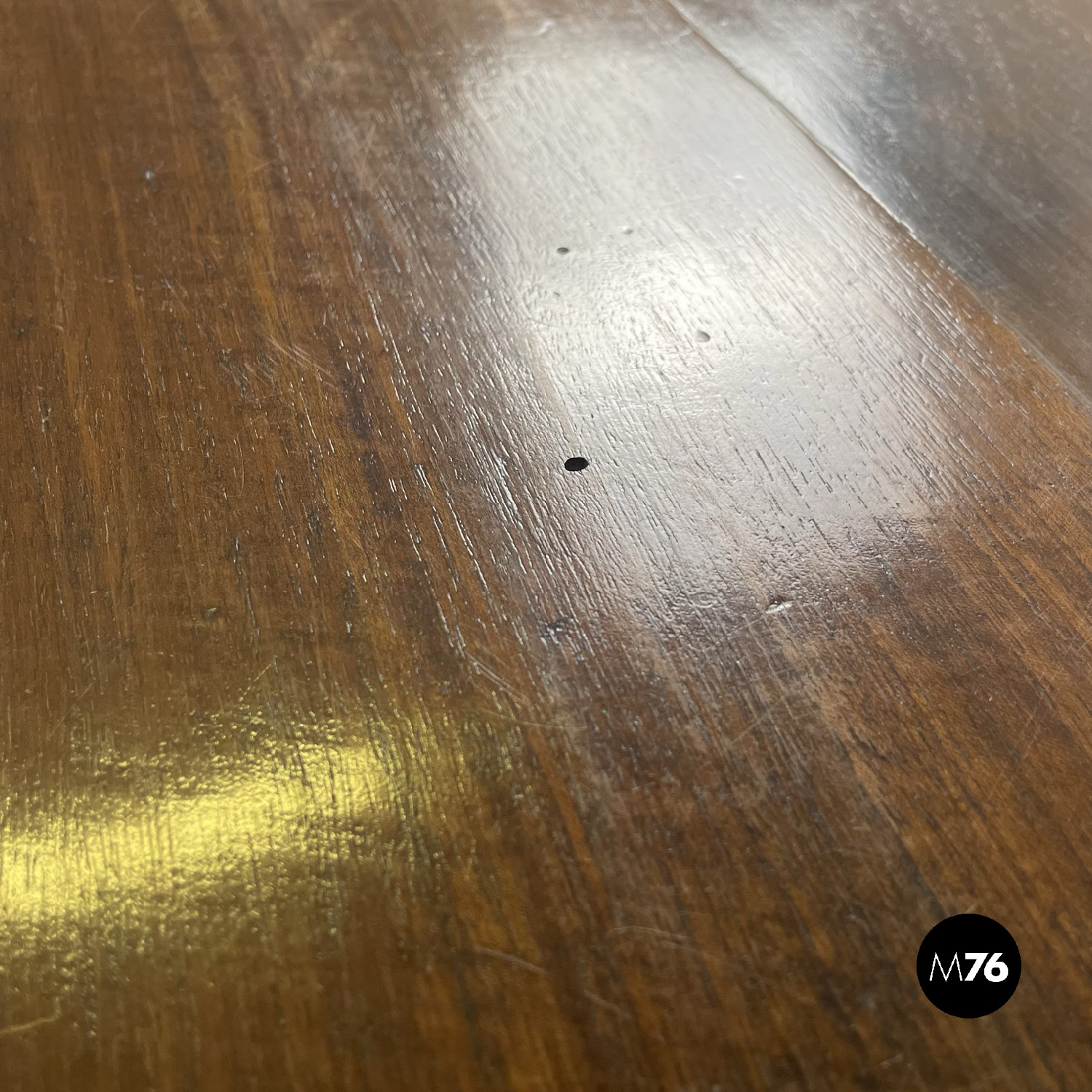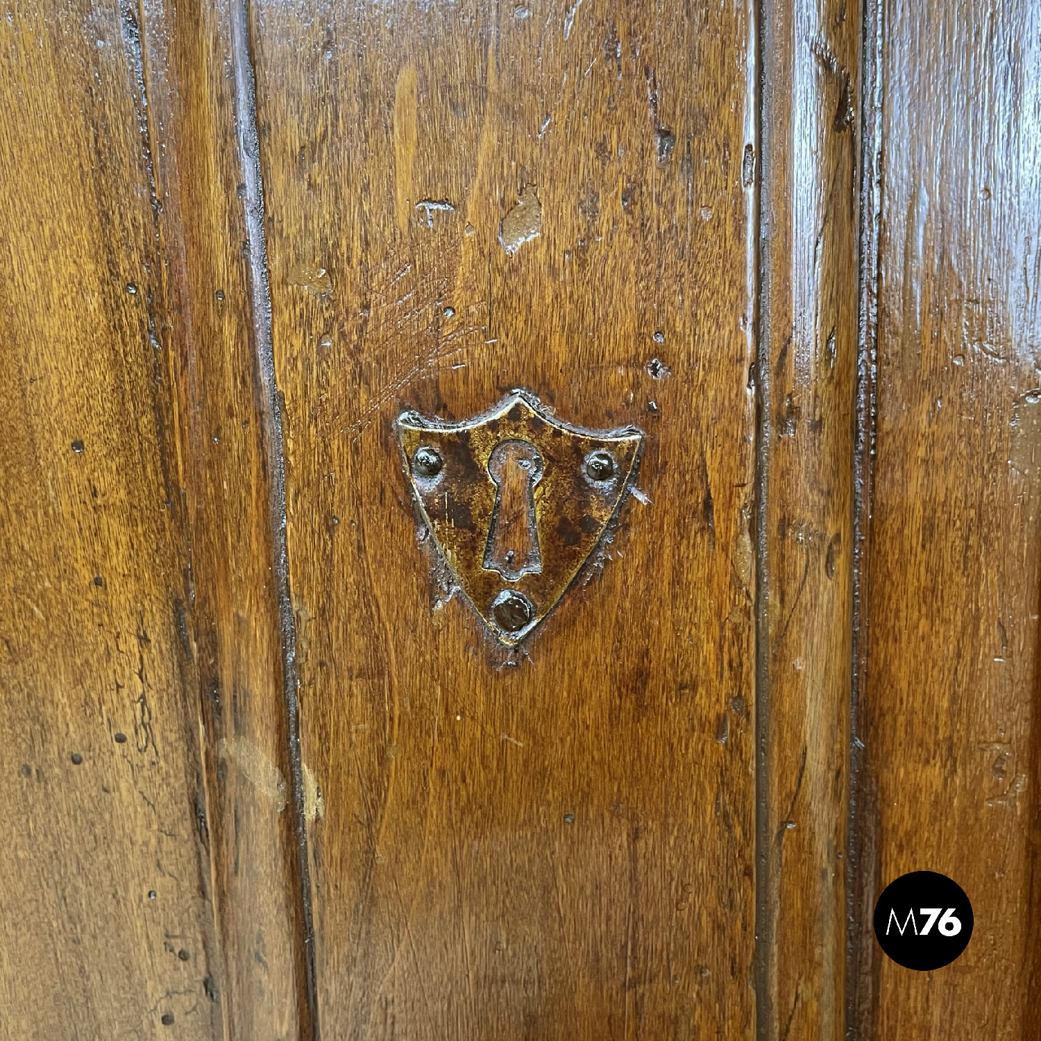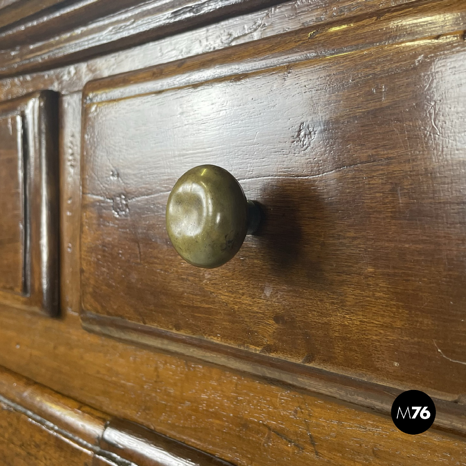 Credenza a base rettangolare interamente in legno. Presenta un piano con i lati del perimetro sagomati sotto si trovano tre cassetti di cui quello centrale più piccolo con pomelli tondi in ottone. Nella parte inferiore presenta due ante una con la serratura e la chiave al cui interno si trovano due piani. L’interno è rivestito con carta da parati con decorazione. I quattro piedini sono sagomati e a sezione quadrata. Utilizzabile come madia.