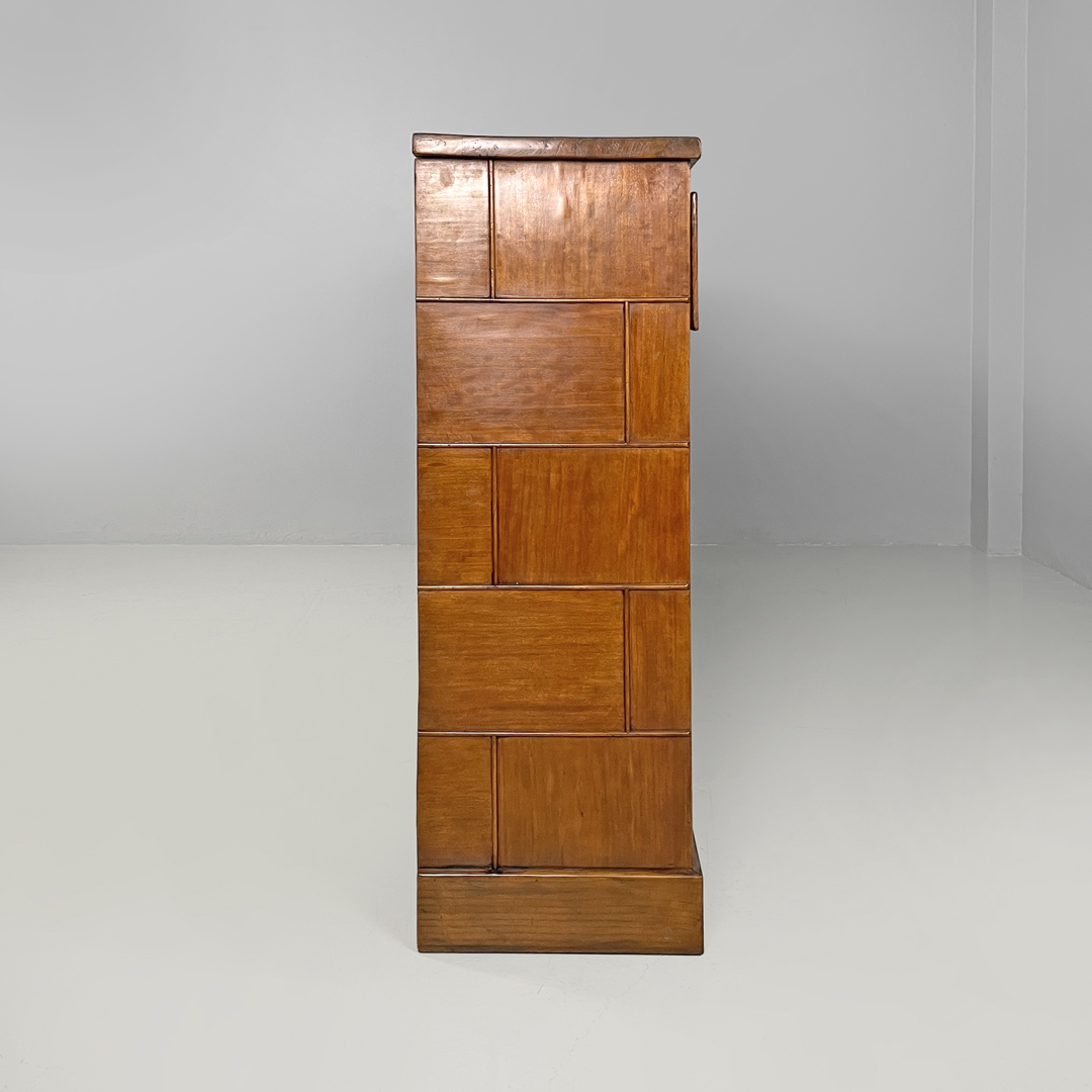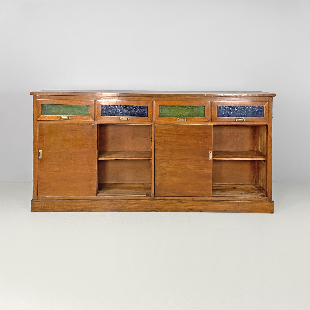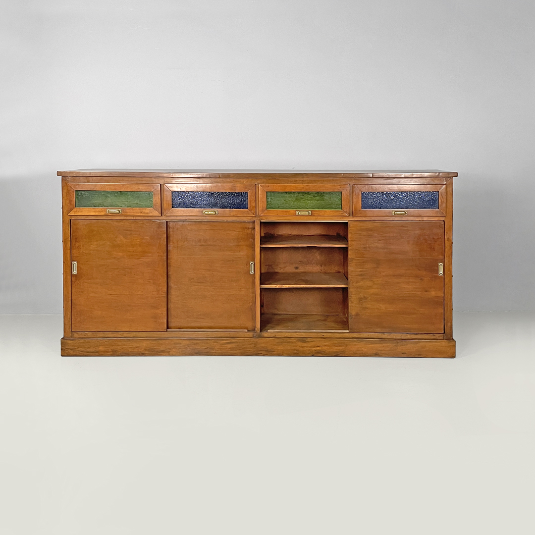 Sideboard credenza o mobile contenitore in legno. Sotto al piano si trovano quattro cassetti con parte frontale in vetro cattedrale verde e blu e maniglia in ottone. Sotto sono presenti due vani con mensole un vano con due ante a scorrimento e l’altro con una sola anta. I lati del mobile presentano decorazioni geometriche.