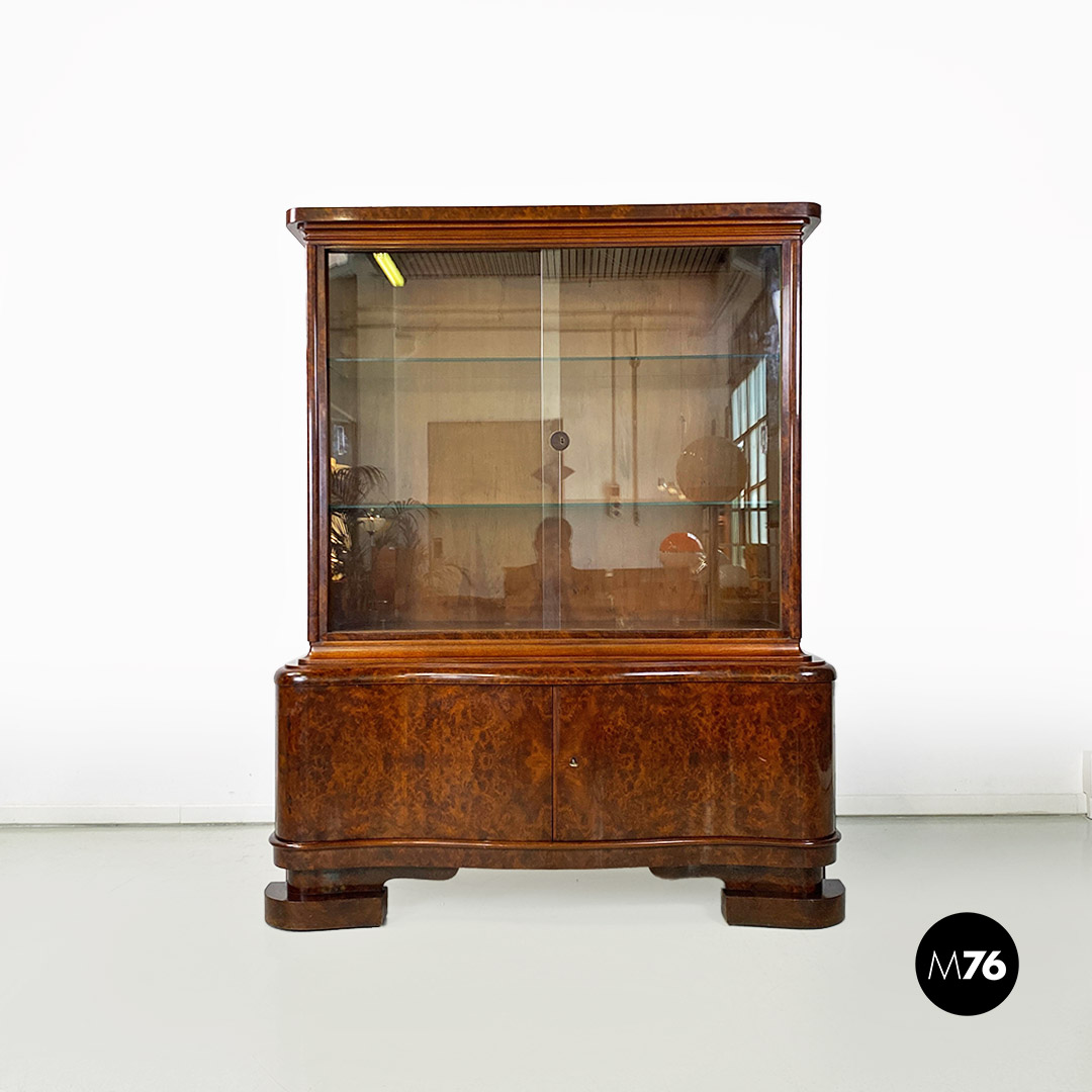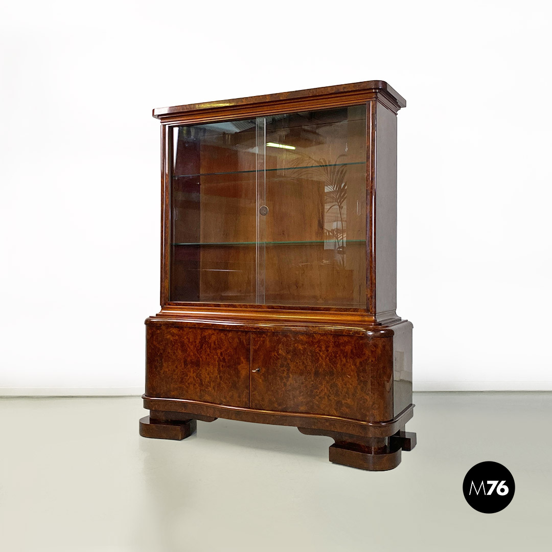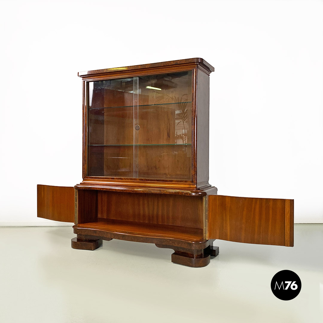 Credenza o highboard a doppio corpo. La parte bassa è chiusa a contenitore in legno provvista di ante a battente dal profilo ricurvo mentre la parte superiore meno profonda presenta due ante scorrevoli in vetro con due mensole interne con posizione regolabile. Art Deco.
