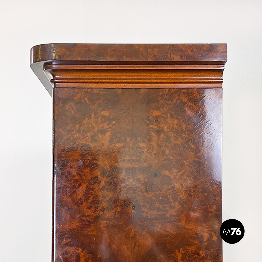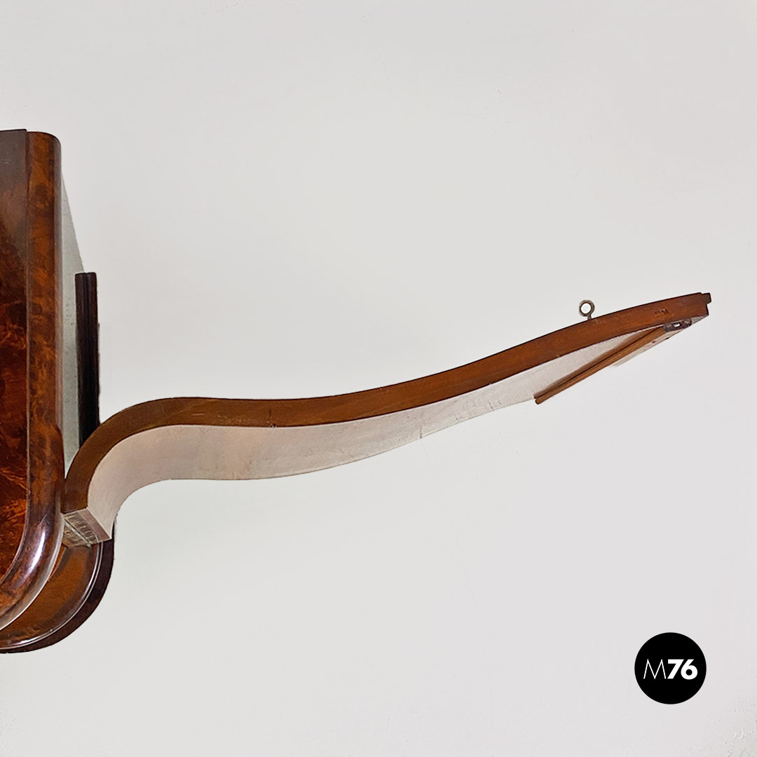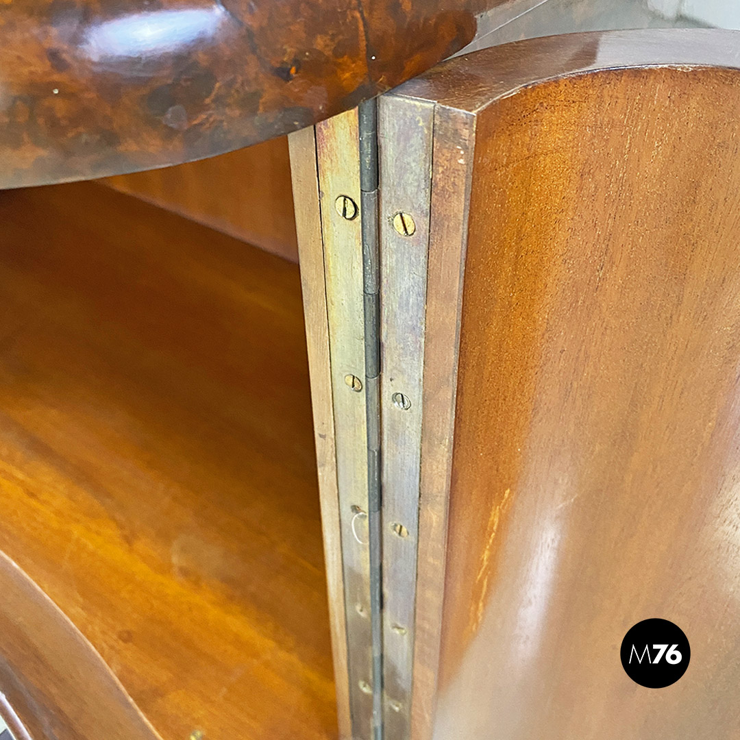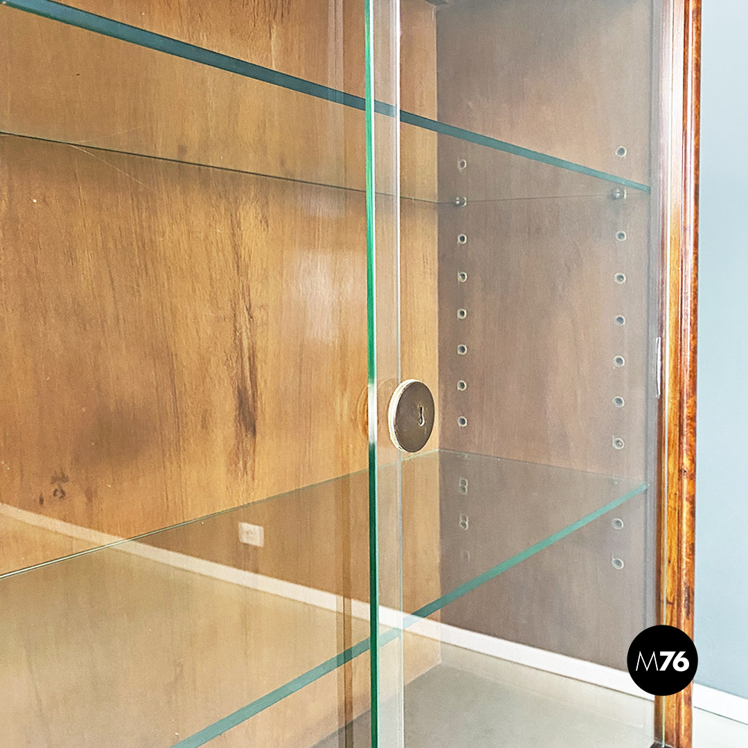 Credenza o highboard a doppio corpo. La parte bassa è chiusa a contenitore in legno provvista di ante a battente dal profilo ricurvo mentre la parte superiore meno profonda presenta due ante scorrevoli in vetro con due mensole interne con posizione regolabile. Art Deco.