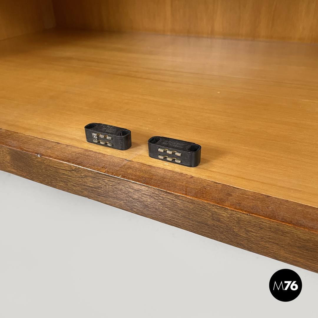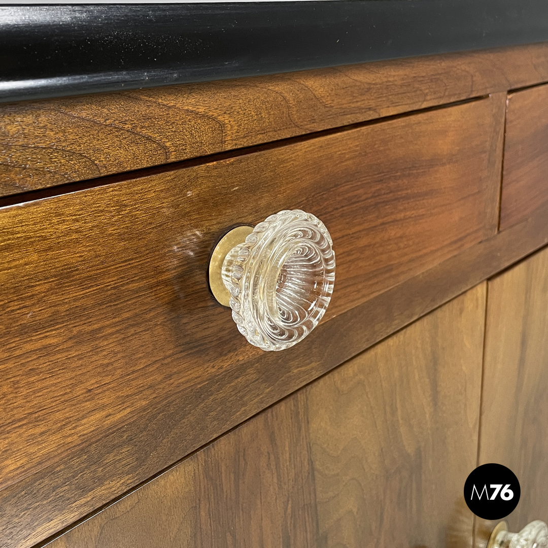 Credenza o sideboard in legno. Il piano del mobile è rettangolare e presenta profili sagomati verniciati in nero sono presenti due cassetti e due ante con maniglie tonde in vetro trasparente. Le due ante si aprono su un vano interno diviso da una mensola centrale. Con quattro gambe le due posteriori a sezione quadrata e le due davanti con profilo semicircolare.