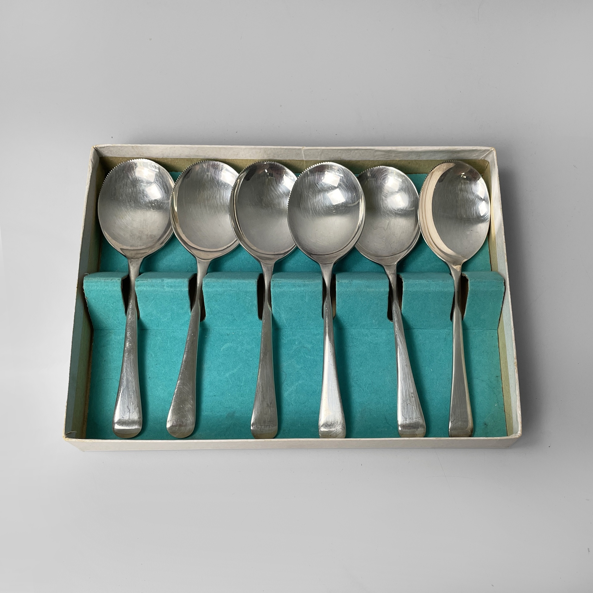 Set di sei cucchiai da melone placcato argento EPNS. Il cucchiaio presenta una parte di profilo dentellato. In scatola di cartone.
