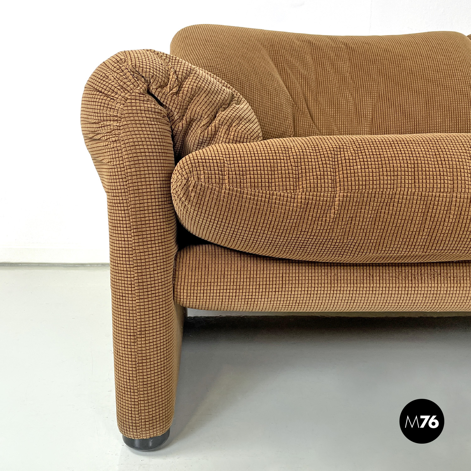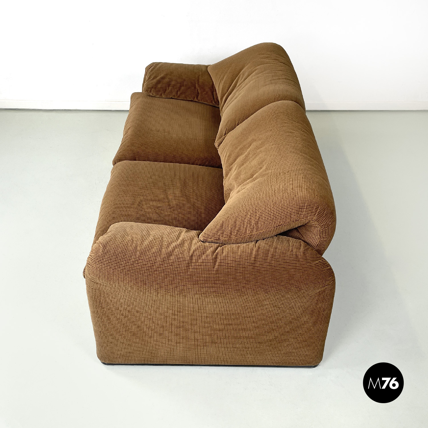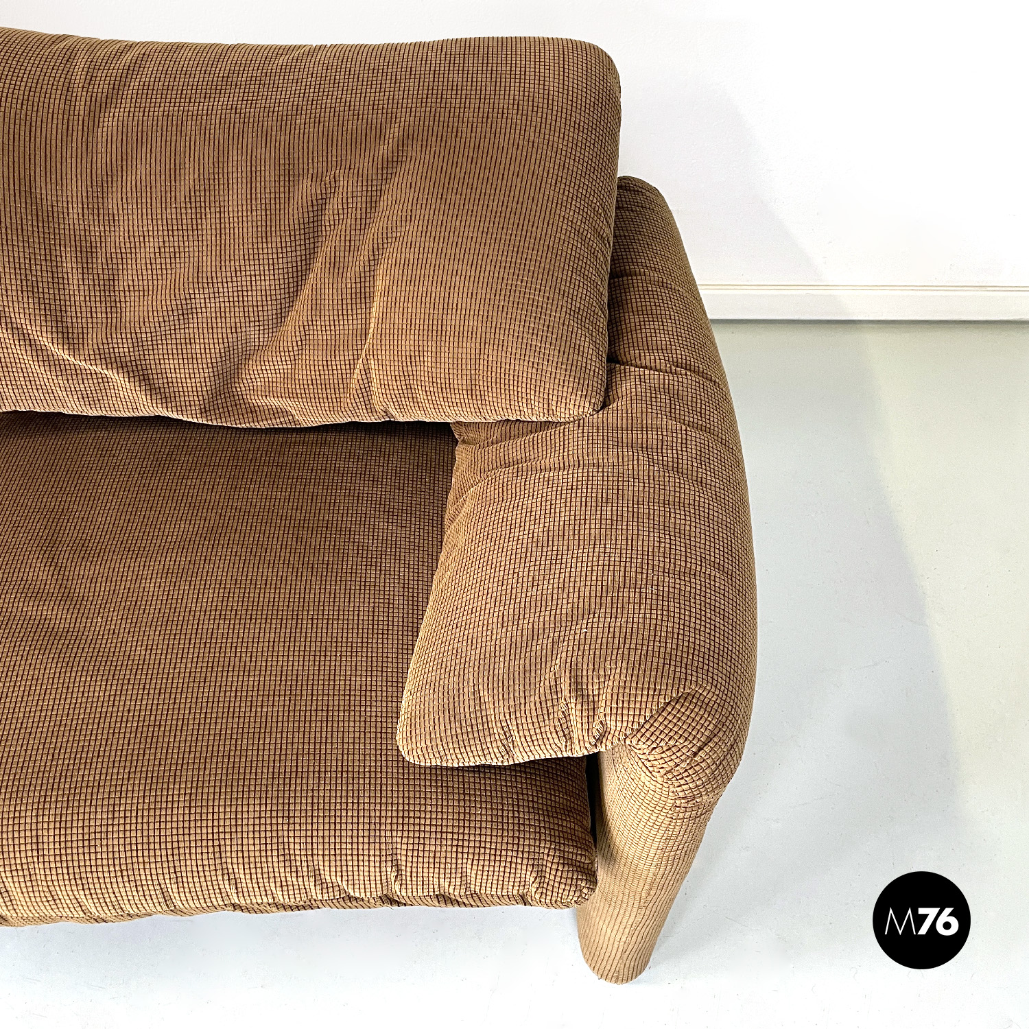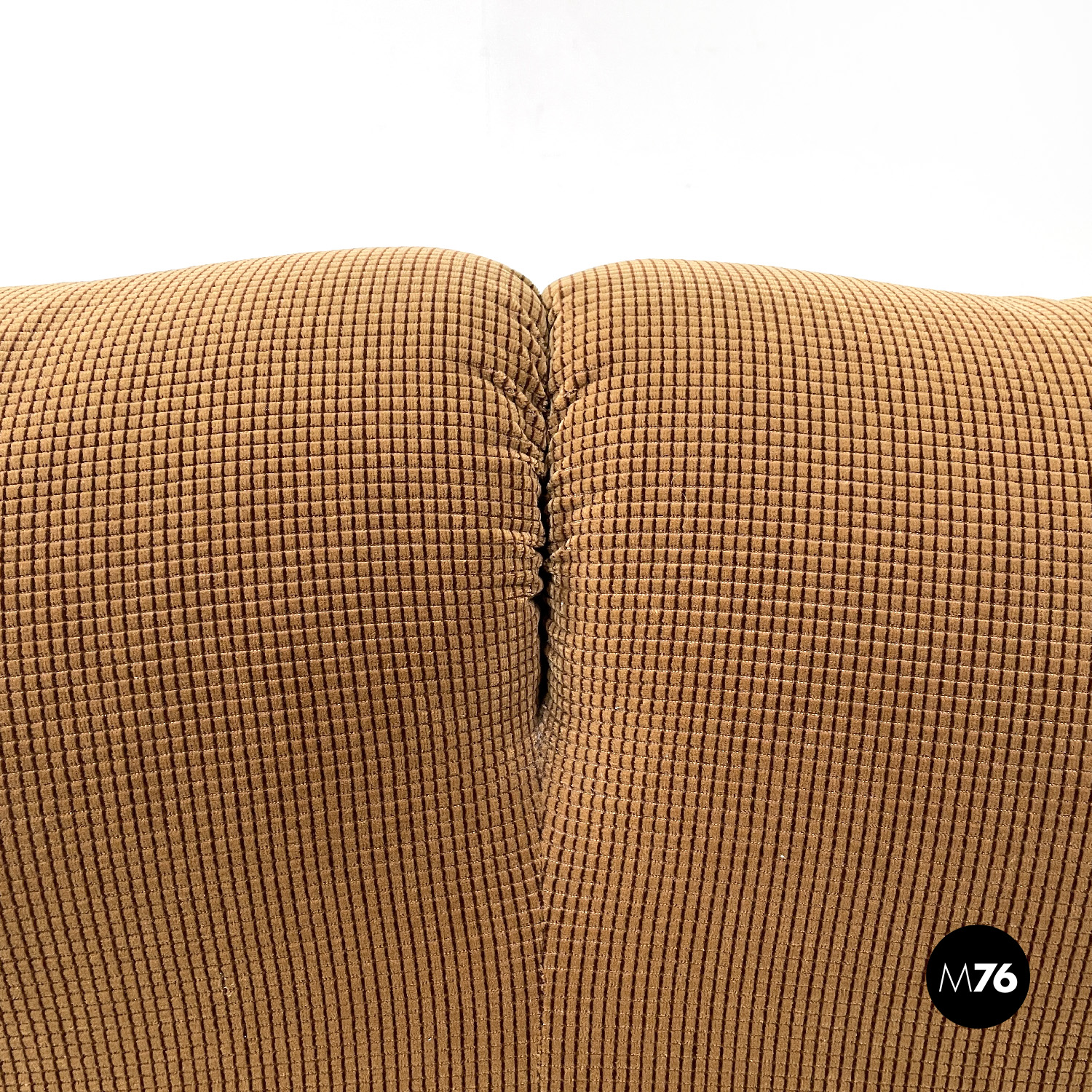 Coppia di divani modello Maralunga a due posti. Sono dotati di poggiatesta ribaltabile indipendenti per ogni singolo posto i due braccioli sono curvi e “ripiegati” verso la seduta. I divani sono rivestiti con tessuto in velluto marrone chiaro con una decorazione a rilievo a griglia di un marrone più scuro.