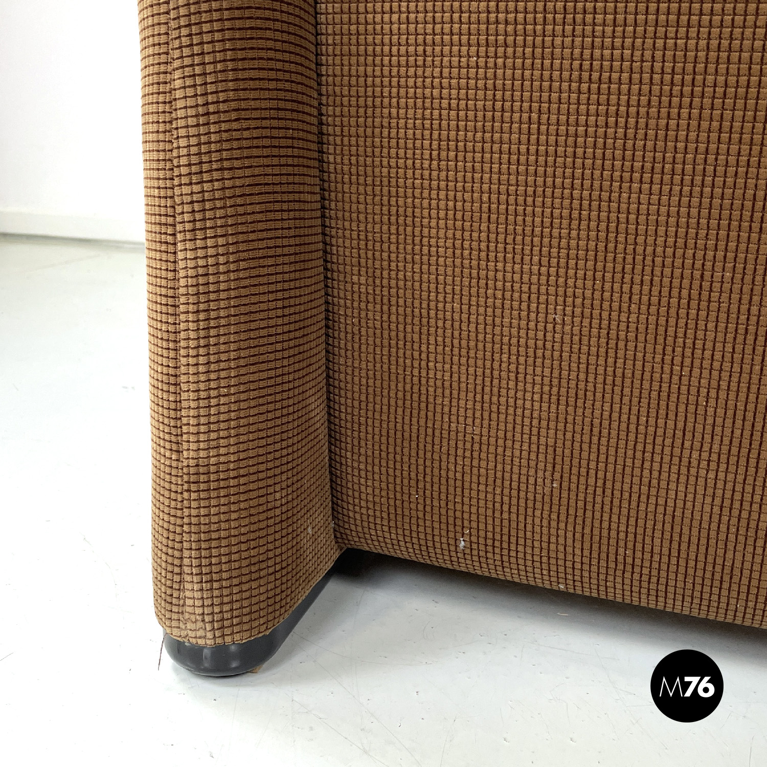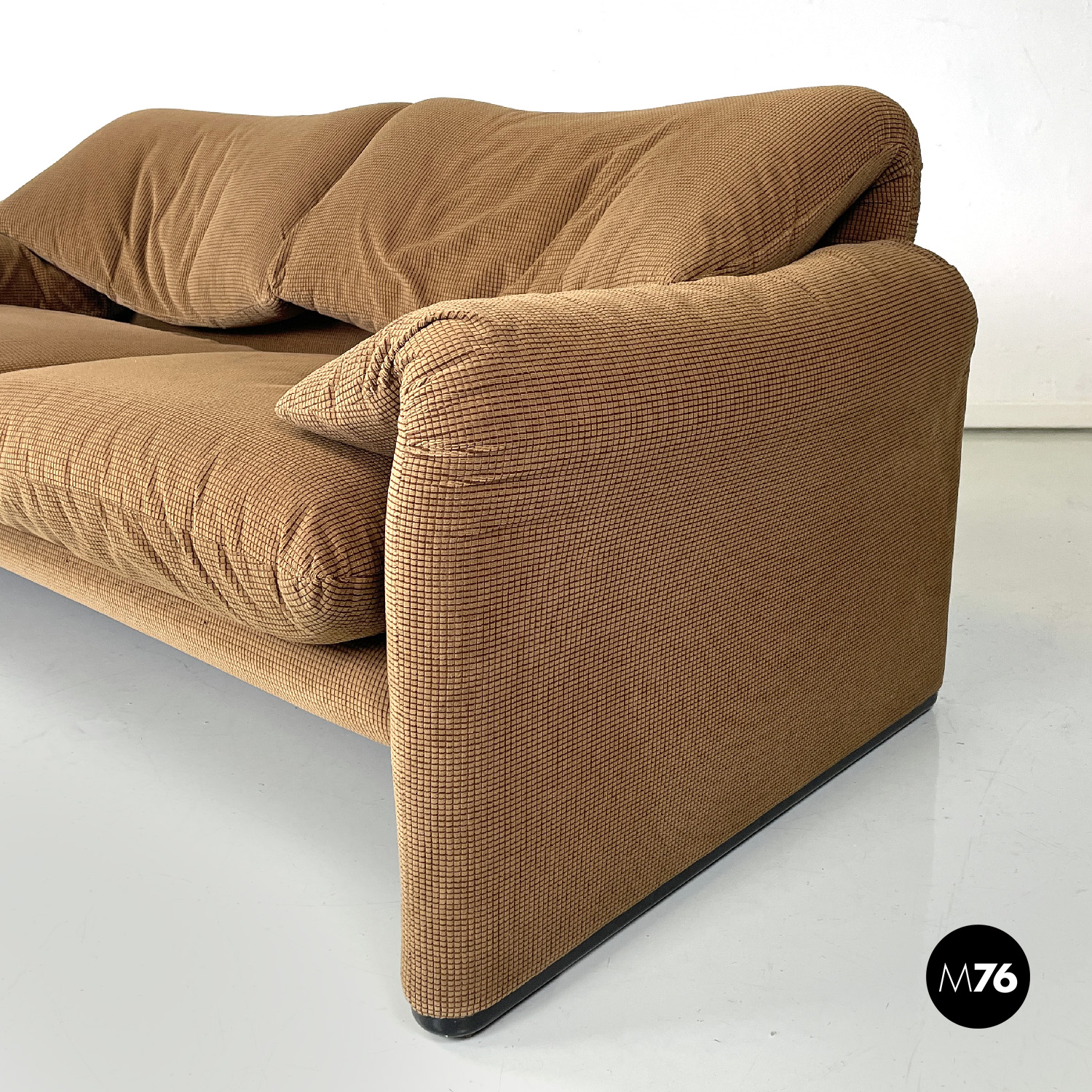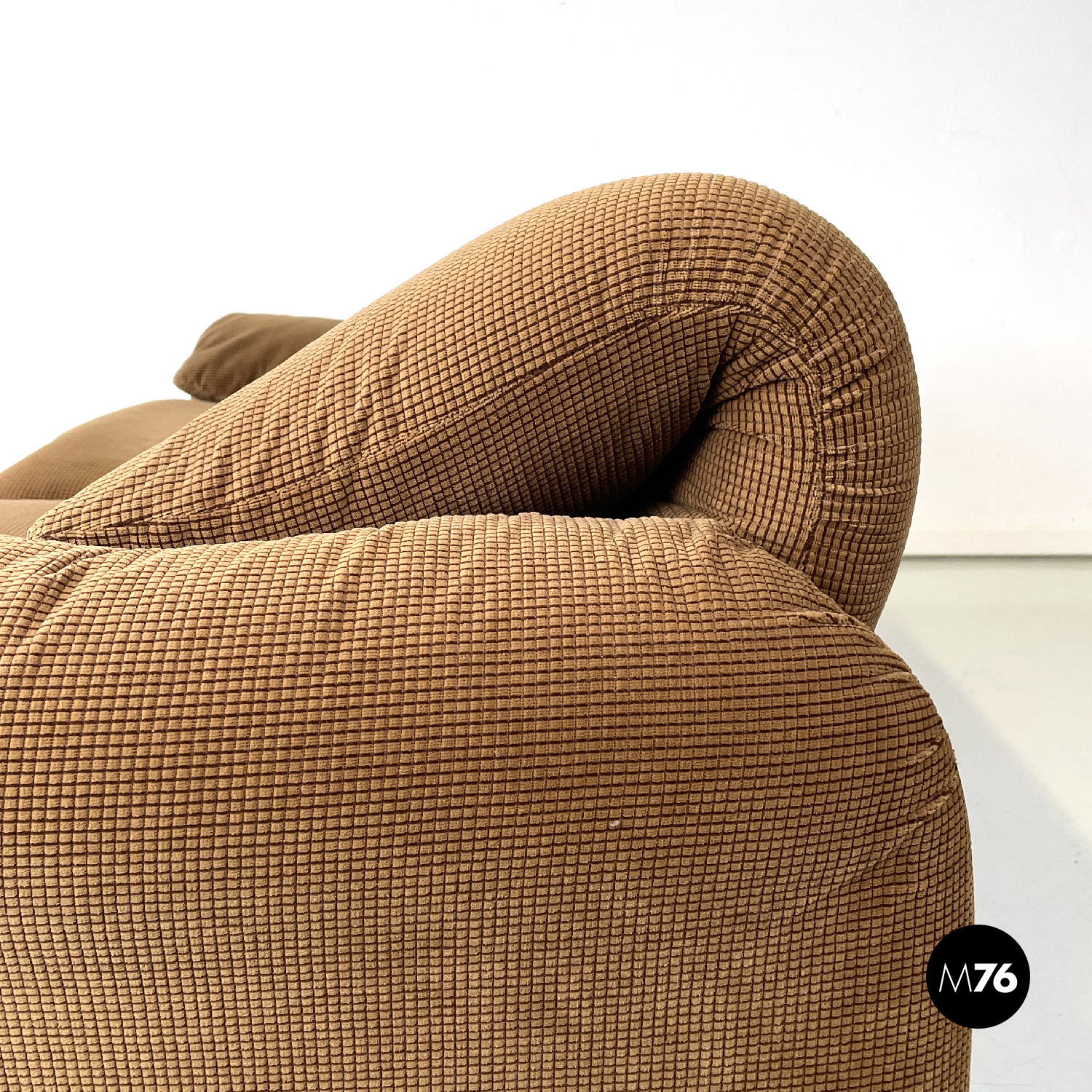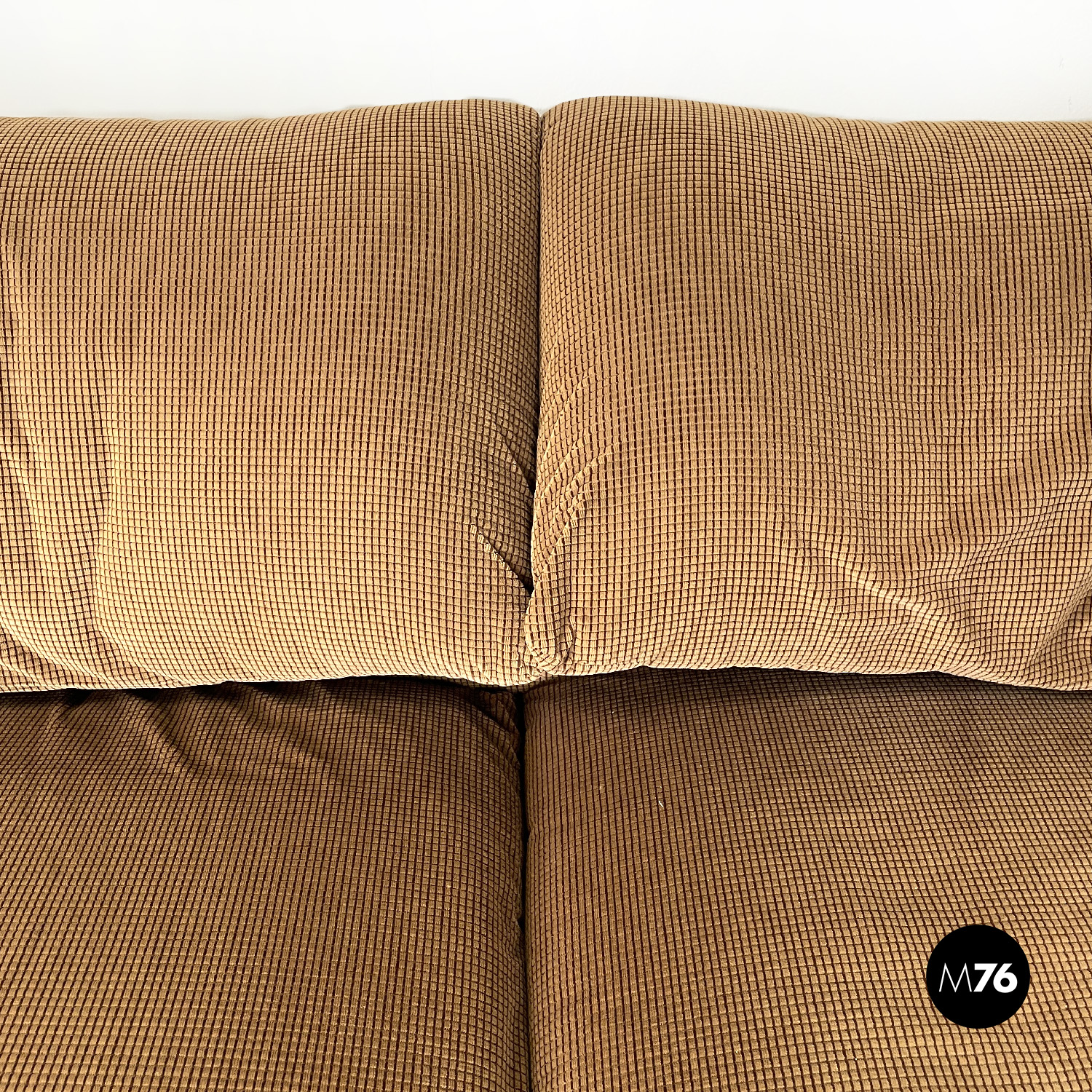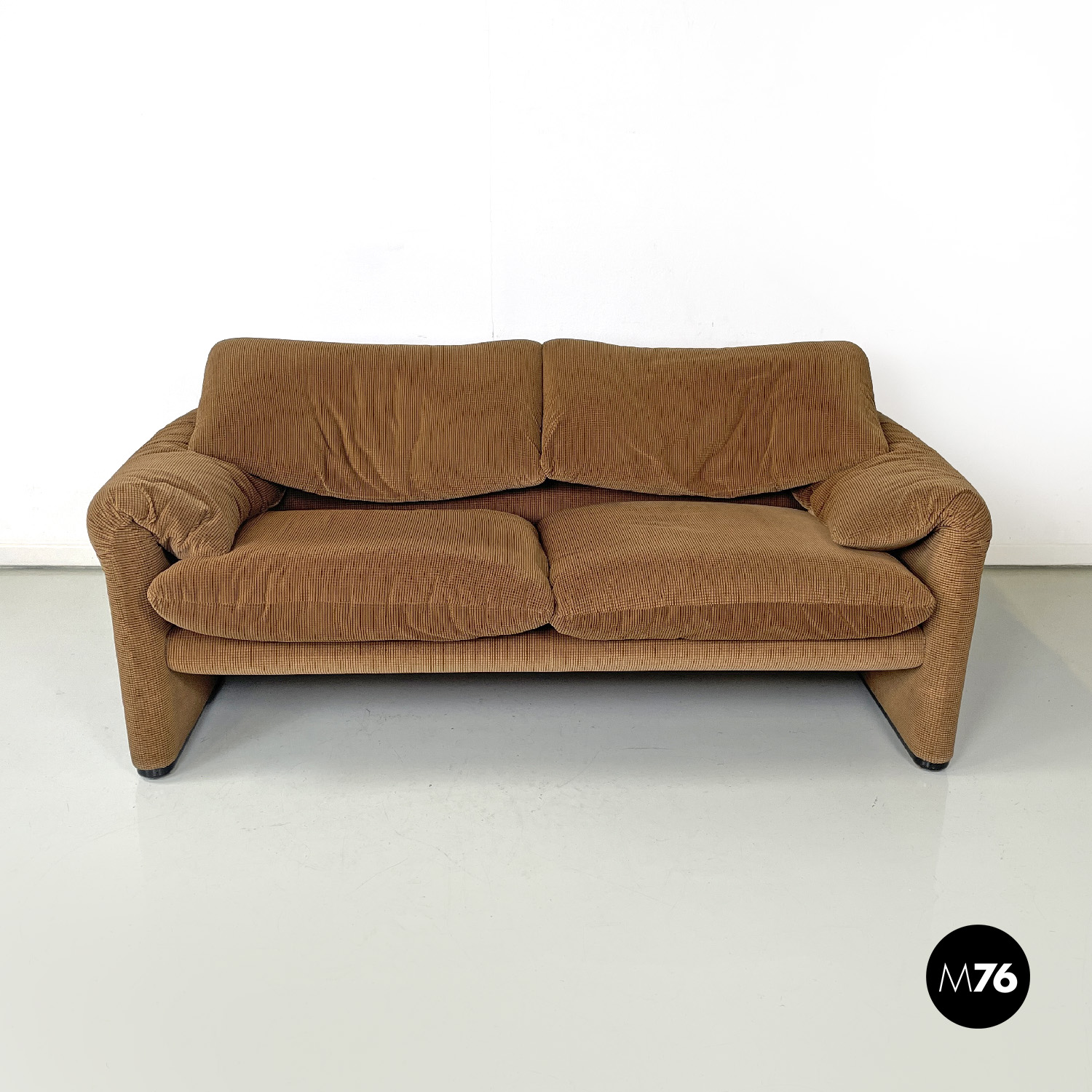 Coppia di divani modello Maralunga a due posti. Sono dotati di poggiatesta ribaltabile indipendenti per ogni singolo posto i due braccioli sono curvi e “ripiegati” verso la seduta. I divani sono rivestiti con tessuto in velluto marrone chiaro con una decorazione a rilievo a griglia di un marrone più scuro.