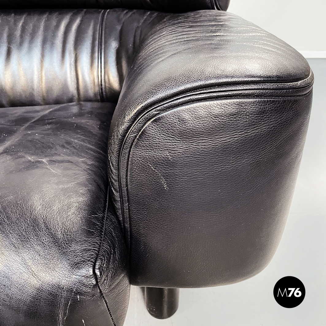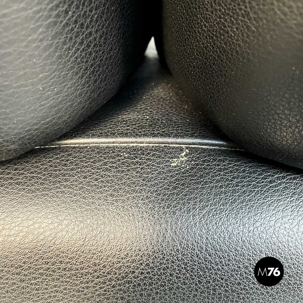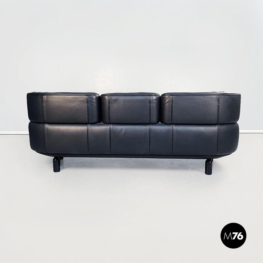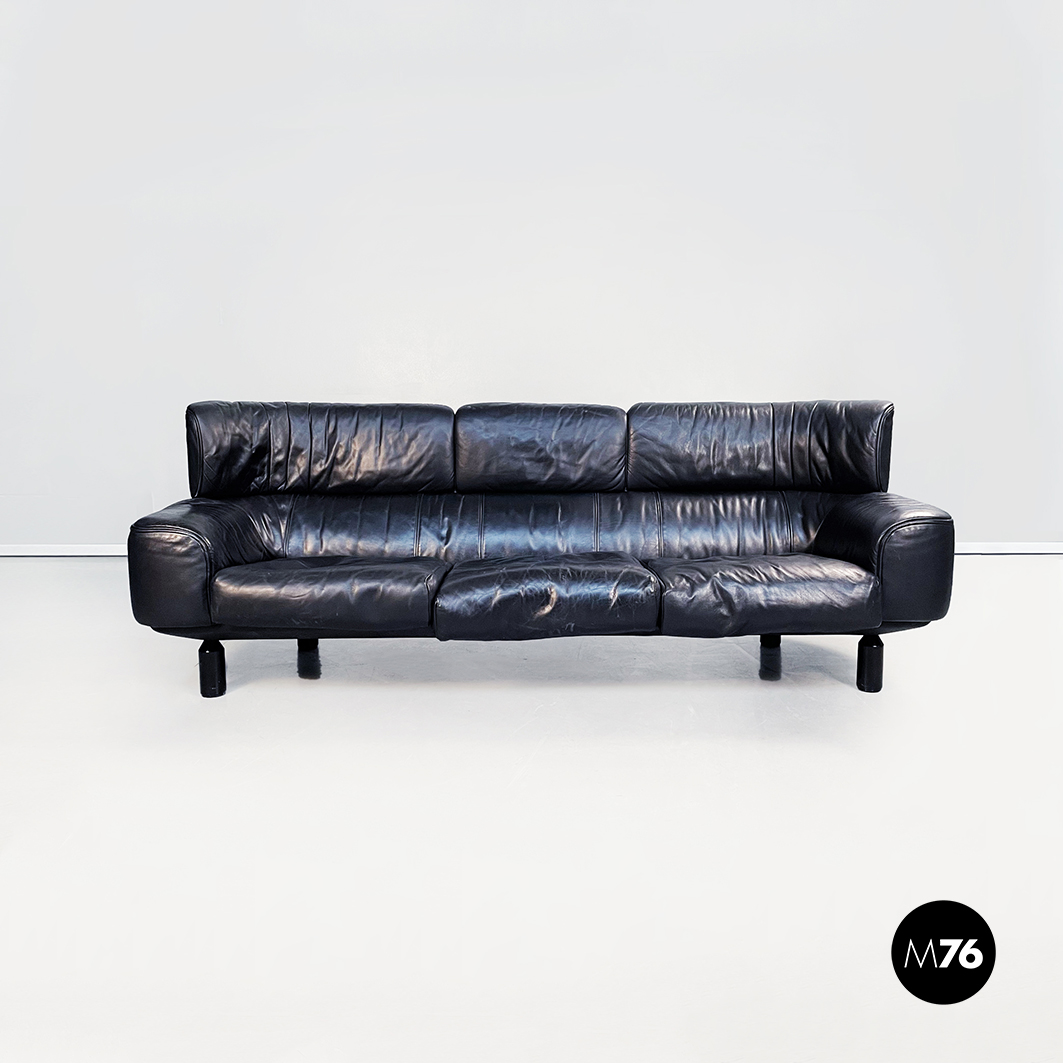 Divano tre posti modello Bull. La seduta rettangolare è composta da cuscini imbottiti e rivestiti in pelle nera. Lo schienale leggermente ricurvo ai lati è imbottito e rivestito in pelle nera. Le cerniere sono visibili sui braccioli e sullo schienale in pelle nera. I piedini cilindrici sono in legno verniciato nero e tendono a stringersi nella parte alta.