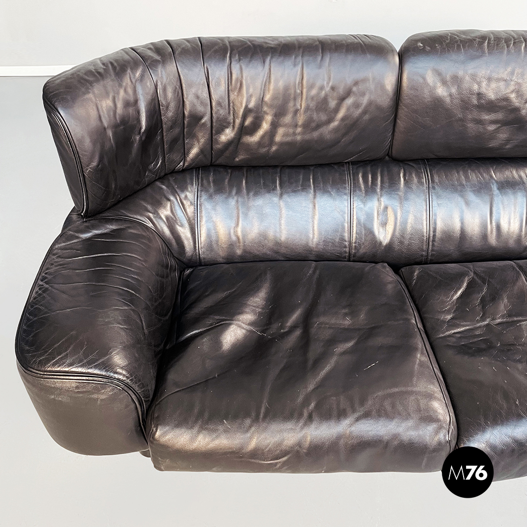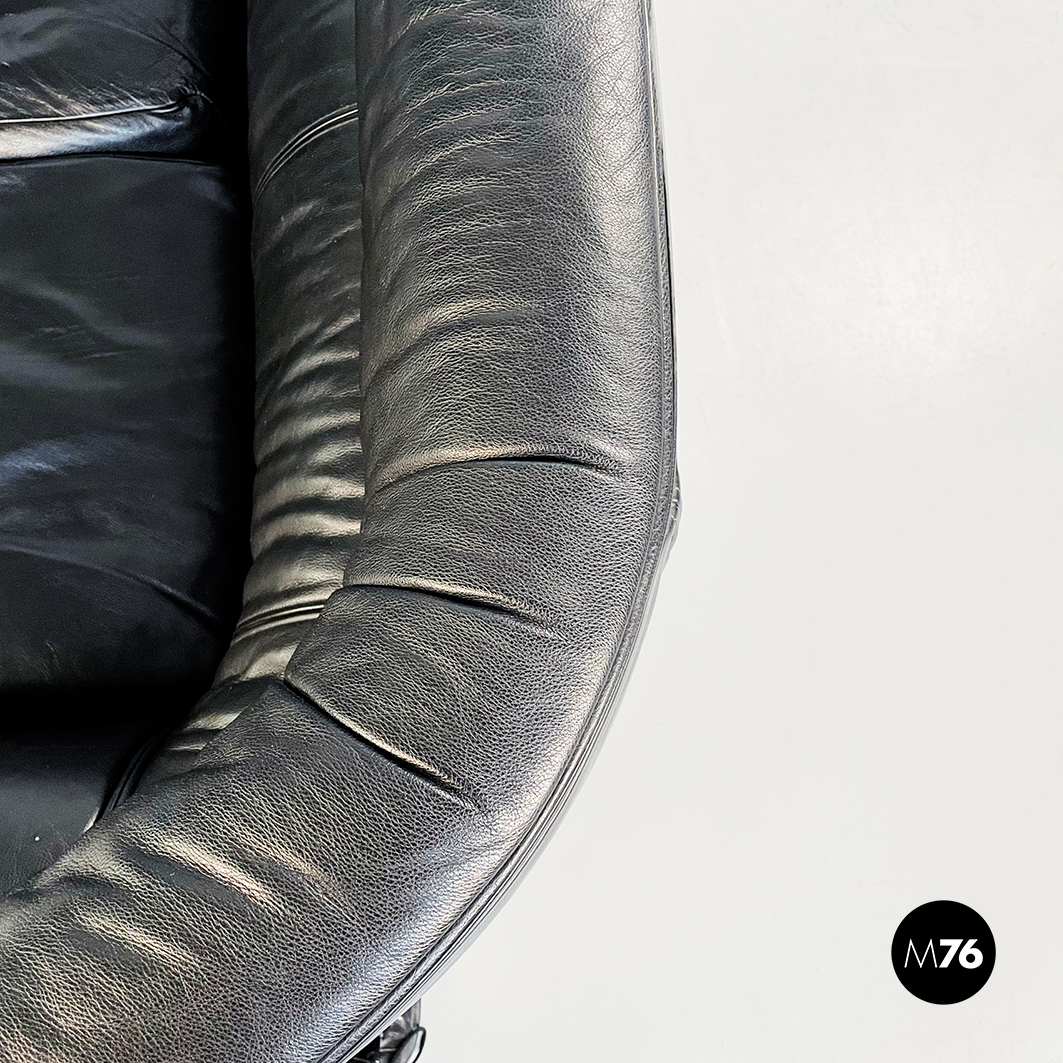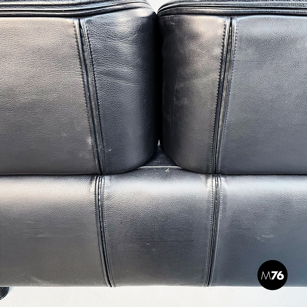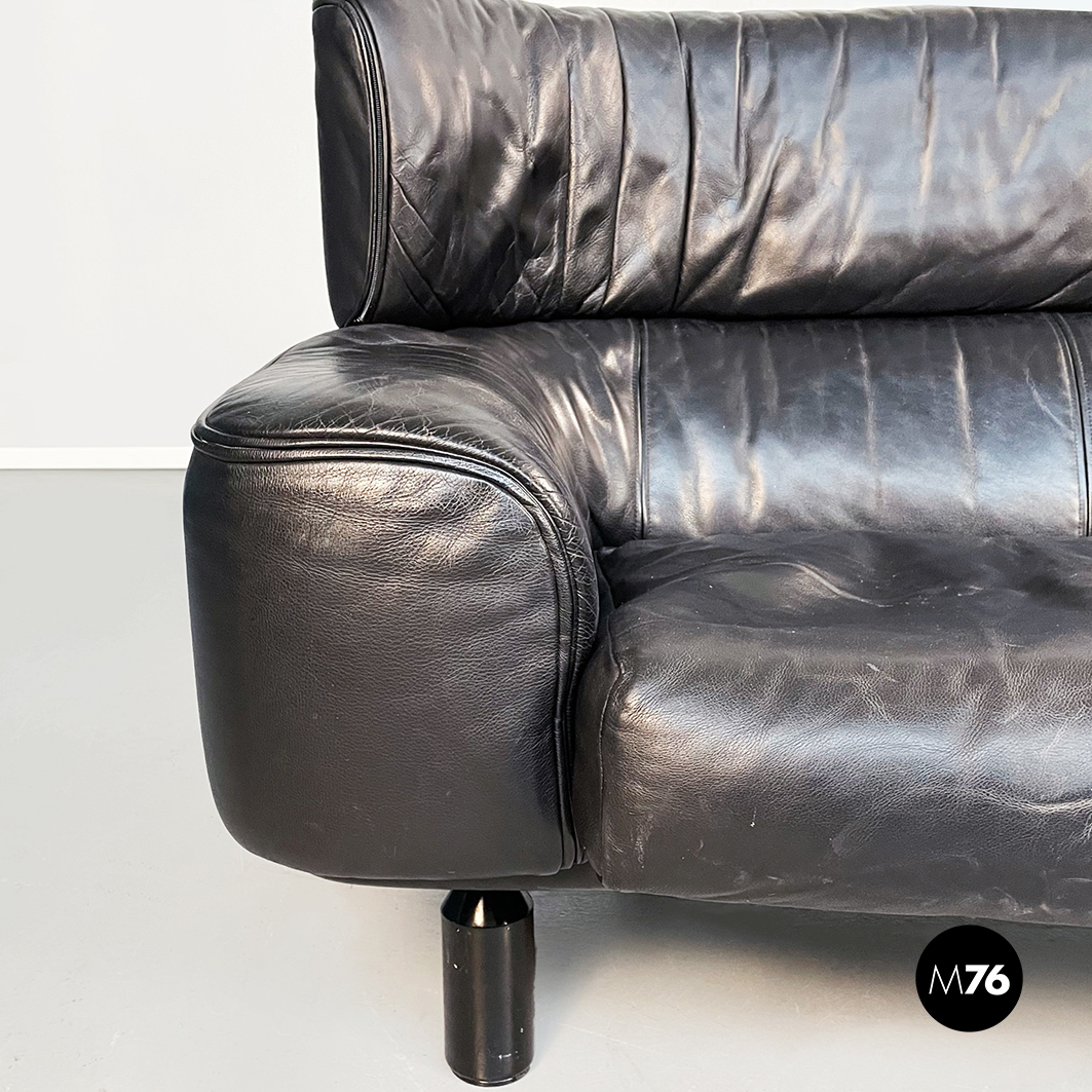 Divano tre posti modello Bull. La seduta rettangolare è composta da cuscini imbottiti e rivestiti in pelle nera. Lo schienale leggermente ricurvo ai lati è imbottito e rivestito in pelle nera. Le cerniere sono visibili sui braccioli e sullo schienale in pelle nera. I piedini cilindrici sono in legno verniciato nero e tendono a stringersi nella parte alta.