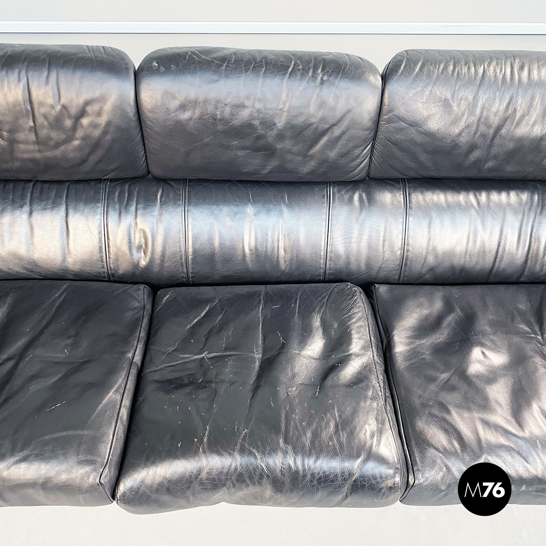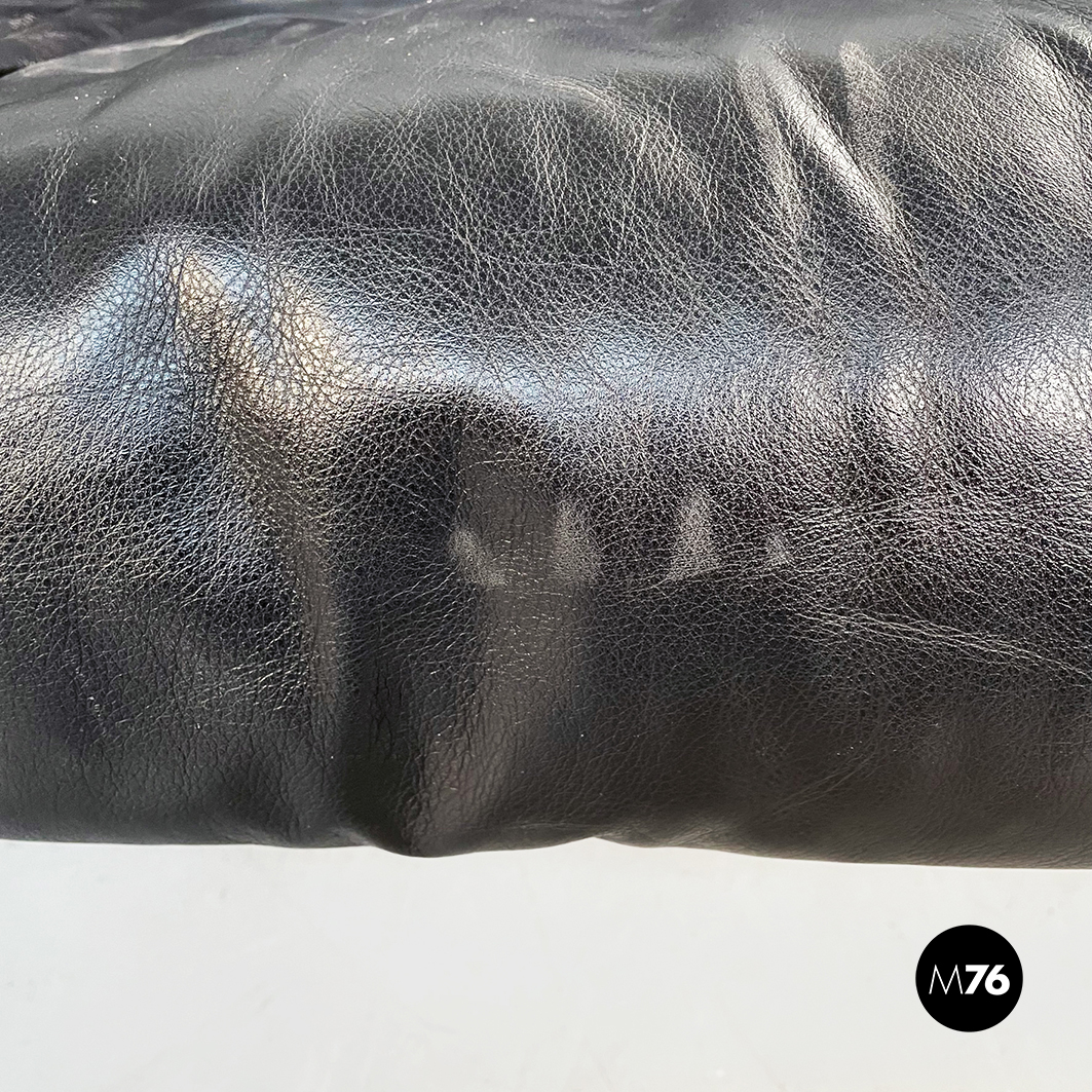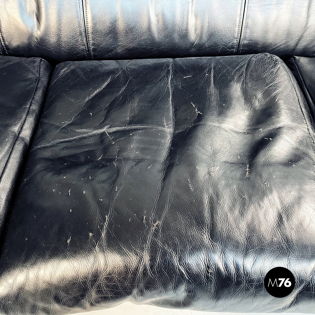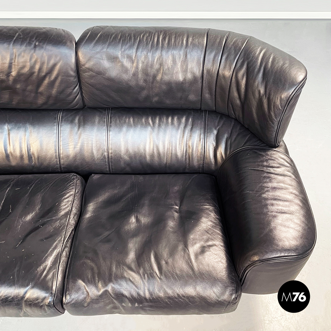 Divano tre posti modello Bull. La seduta rettangolare è composta da cuscini imbottiti e rivestiti in pelle nera. Lo schienale leggermente ricurvo ai lati è imbottito e rivestito in pelle nera. Le cerniere sono visibili sui braccioli e sullo schienale in pelle nera. I piedini cilindrici sono in legno verniciato nero e tendono a stringersi nella parte alta.