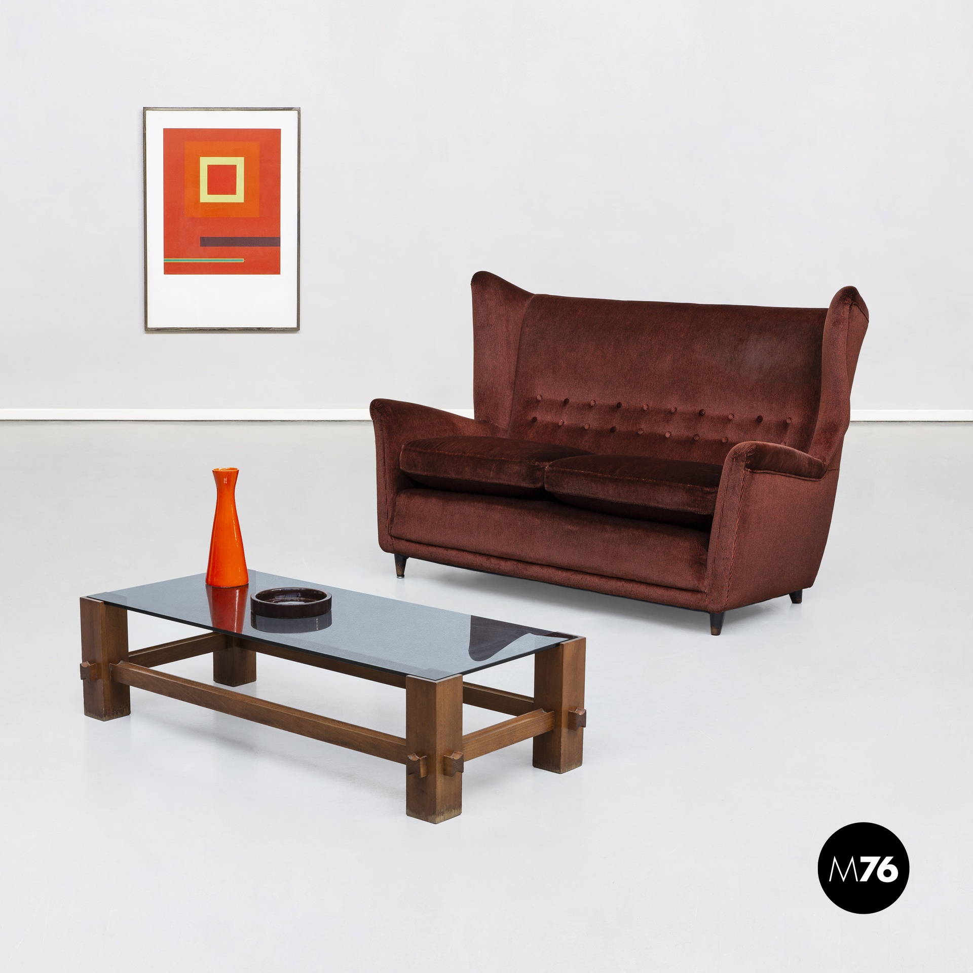 Divano a due posti in velluto a coste rosso scuro. Struttura con braccioli e schienale alto e confortevole il tutto rivestito nel suo tessuto originale con un’unica linea di cucitura su di esso e un’ampia forma curva per il poggiatesta. Schienale rifinito con bottoni. Poggia su quattro gambe tornite in legno con una struttura robusta.
