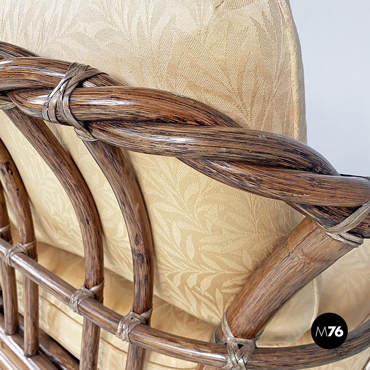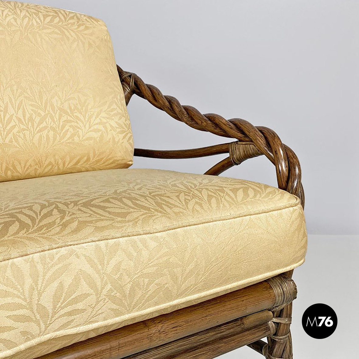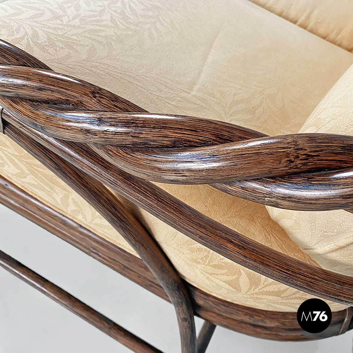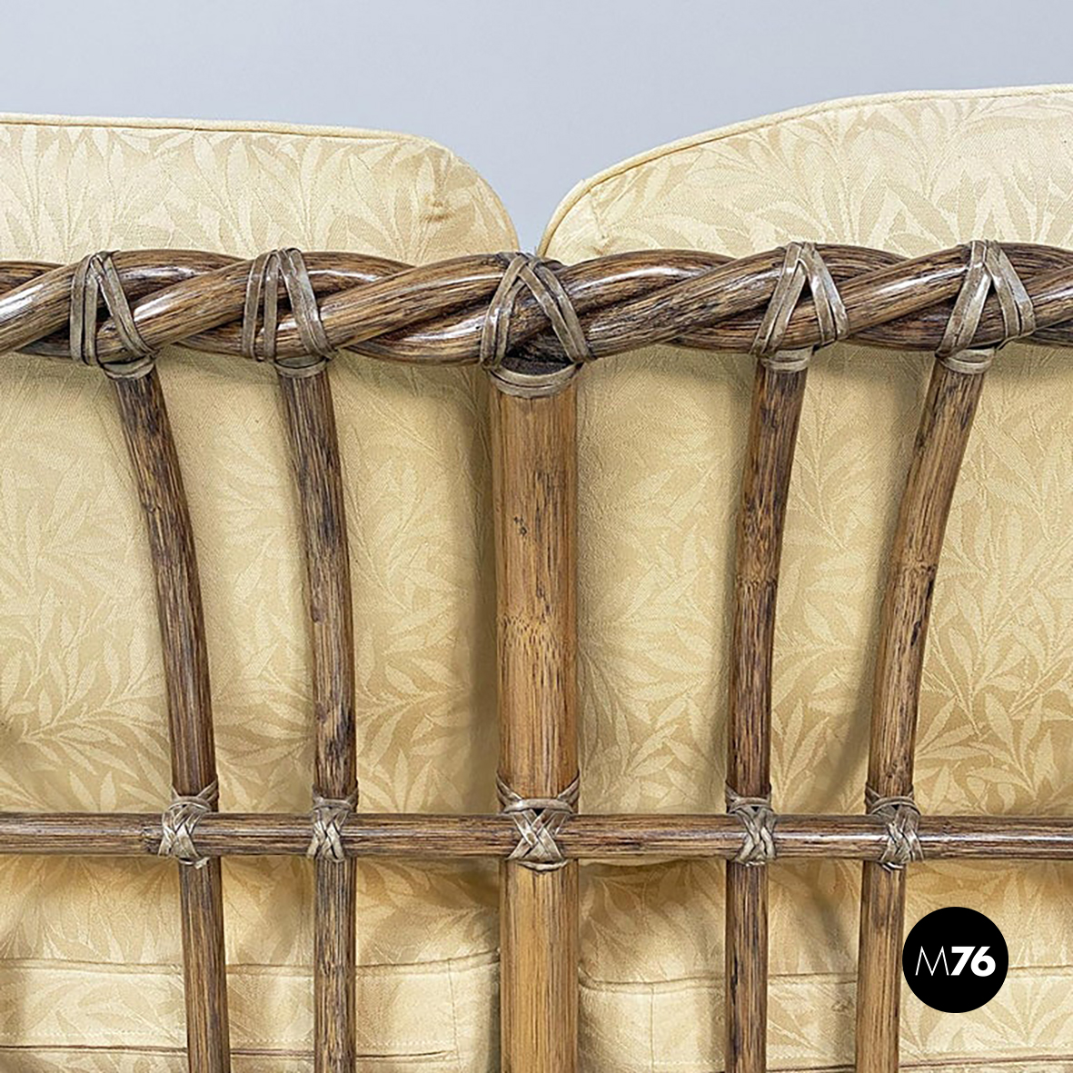 Divano a due posti con seduta e schienale composti da cuscini imbottiti e rivestiti in tessuto beige con motivi floreali. La struttura, i braccioli e le zampe sono in rattan intrecciato con dettagli in cuoio. Adatto ad anche a uso esterno, come in giardino o in veranda.