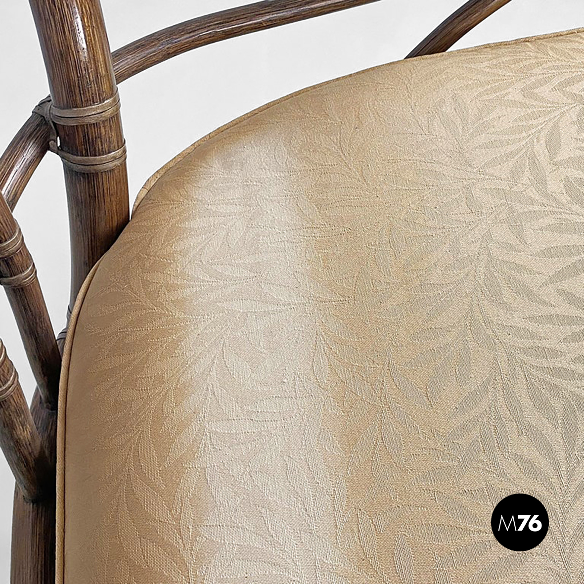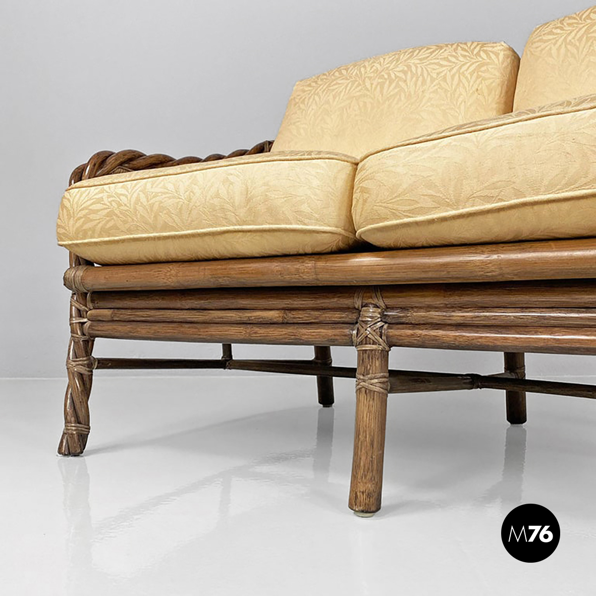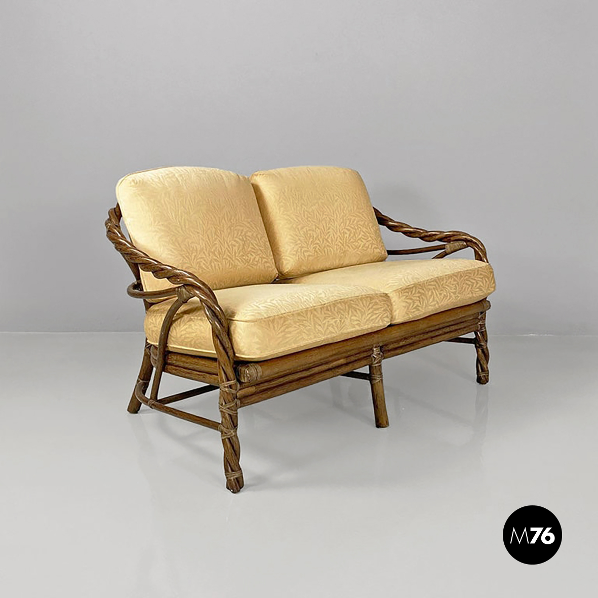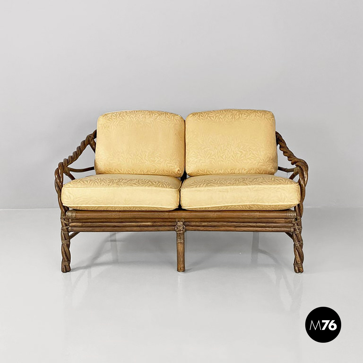 Divano a due posti con seduta e schienale composti da cuscini imbottiti e rivestiti in tessuto beige con motivi floreali. La struttura, i braccioli e le zampe sono in rattan intrecciato con dettagli in cuoio. Adatto ad anche a uso esterno, come in giardino o in veranda.